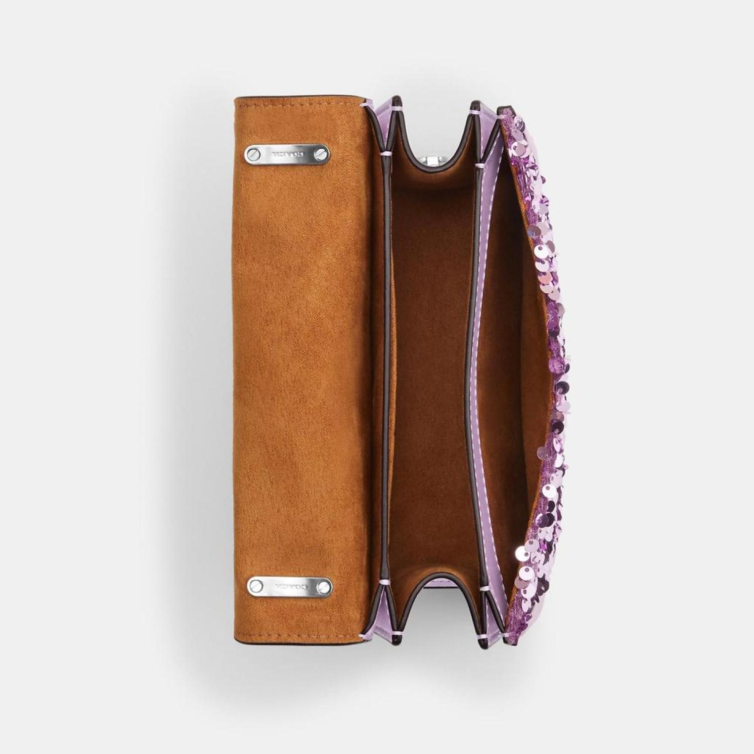 Sequins foil metallic smooth leather and metallic refined calf leather Inside zip and multifunction pockets Snap closure fabric lining Outside open pocket Adjustable strap with 21 1/2 drop for shoulder or crossbody wear 7 1/4 (L) x 5 3/4 (H) x 2 1/4 (W) Style No. CQ557 | Coach Outlet Morgan Square Crossbody - Purple