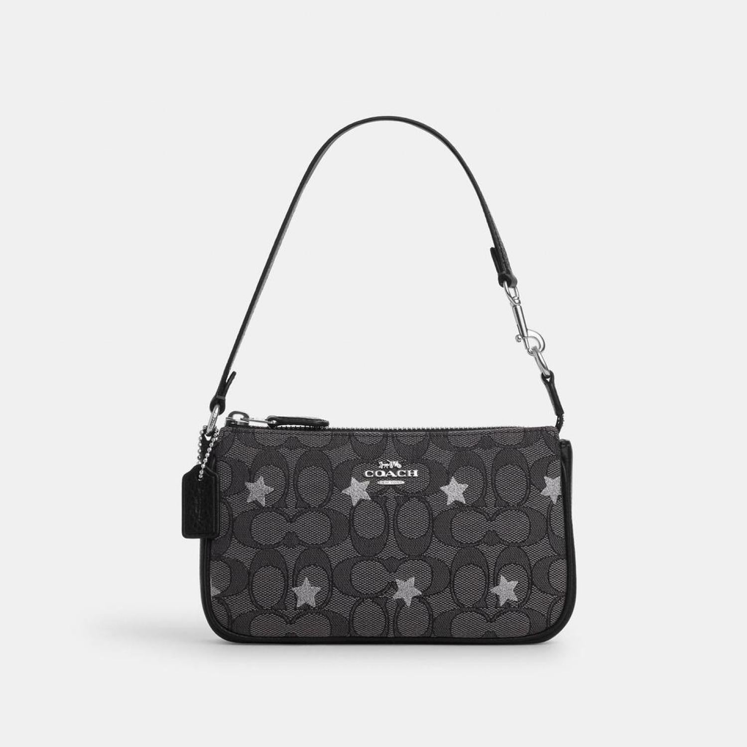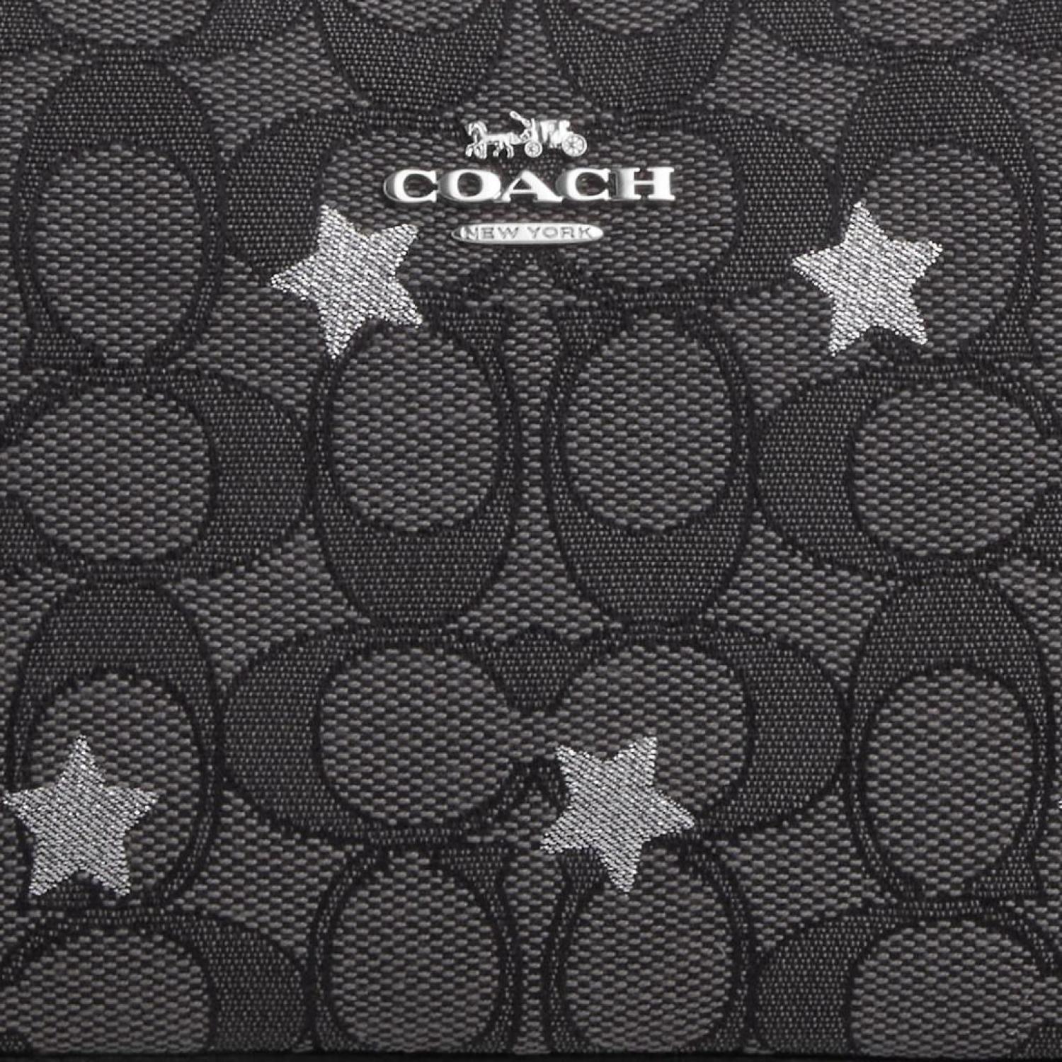 - Signature jacquard and refined pebble leather Two credit card slots Inside multifunction pocket Zip-top closure fabric lining Handle with 6 1/4 drop 7 1/2 (L) x 4 1/2 (H) x 2 (W) Style No. CP477 | Coach Outlet Nolita 19 In Signature Jacquard With Star Embroidery - Black