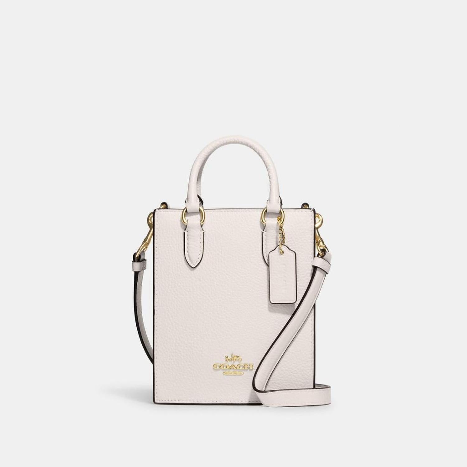 Refined pebble leather Two credit card slots Magnetic snap closure fabric lining Handles with 2 1/4 drop Detachable strap with 23 1/4 drop for shoulder or crossbody wear 5 1/2 (L) x 6 3/4 (H) x 2 (W) Style No. CJ500 | Coach Outlet North South Mini Tote - White