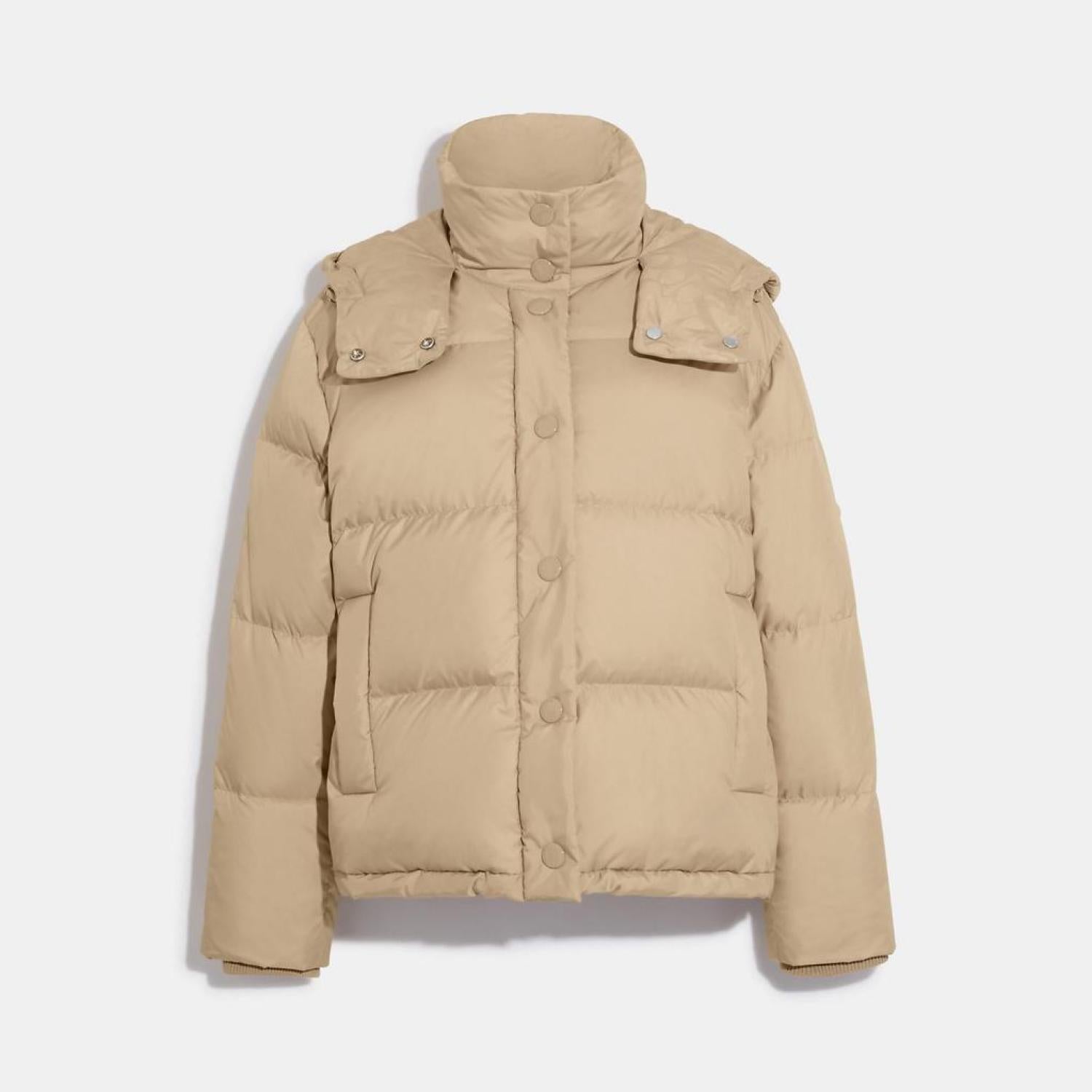 100% polyester Knit rib - 98% cotton 2% elastane Lining - 100% polyester Fill 1 - 90% down 10% feathers Fill 2 - 100% polyester Snap button closure Slip pockets Length - 25 1/4 Model is 5'10 (178cm) chest 31 (79cm) waist 24 (61cm) hips 35 (89cm) and wears a size S Style No. CL445 | Coach Outlet Short Down Puffer - Beige, Size - Medium