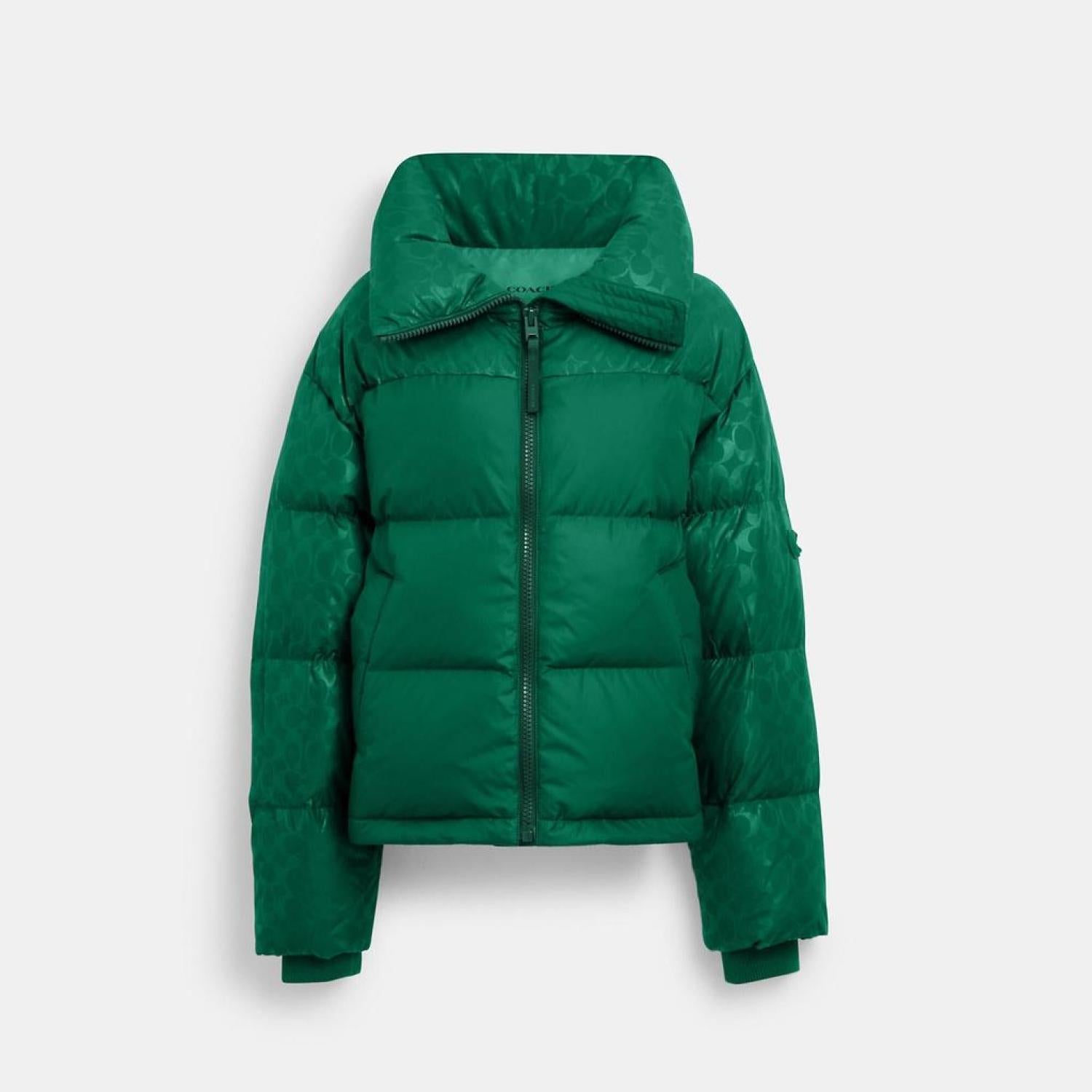 100% polyester Knit rib - 98% cotton 2% elastane Lining - 100% polyester Fill 1 - 90% down 10% feathers Fill 2 - 100% polyester Zip closure Slip pockets Length - 23 1/2 Model is 5'10 (178cm) chest 31 (79cm) waist 24 (61cm) hips 35 (89cm) and wears a size S Style No. CL276 | Coach Outlet Signature Short Puffer - Green, Size - Medium