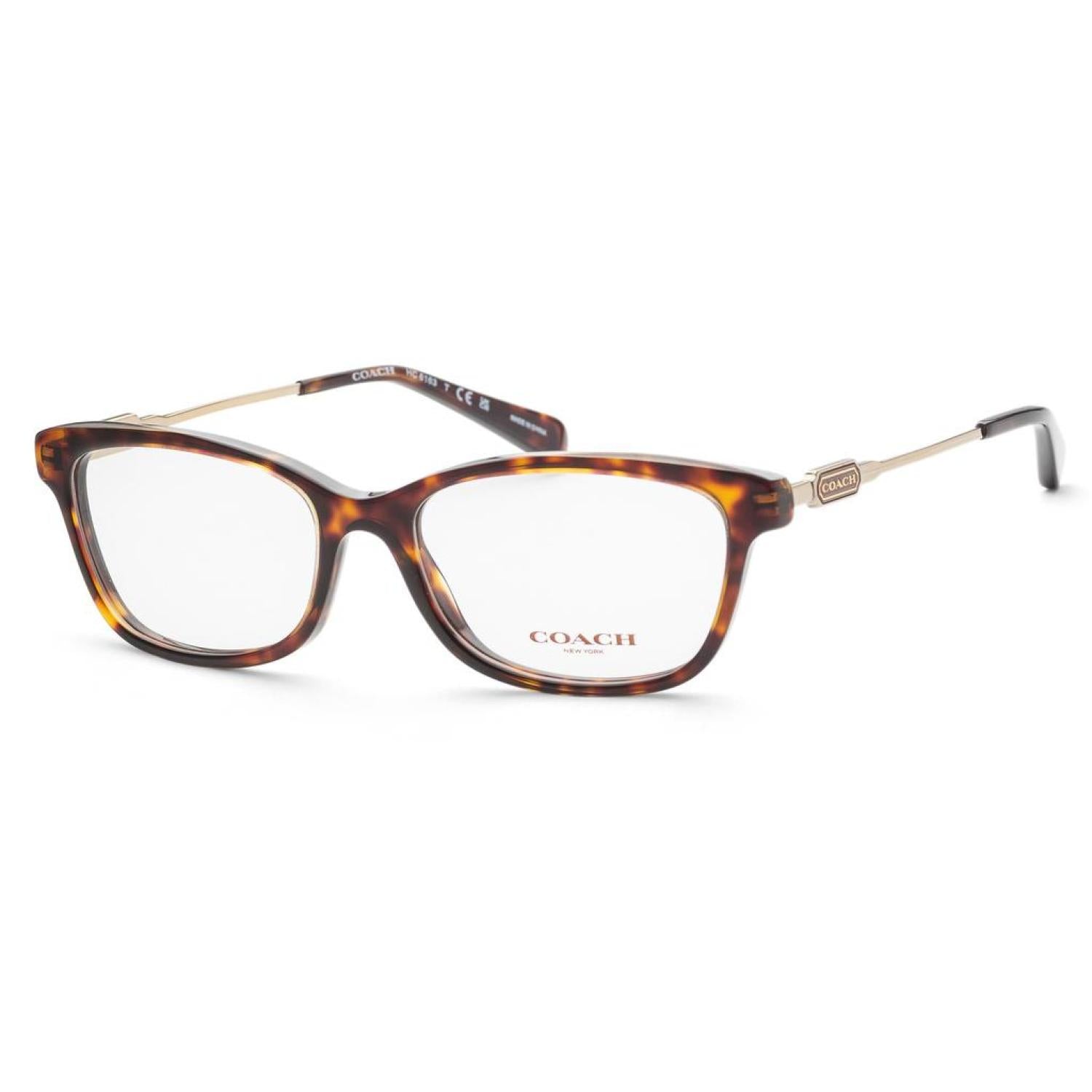 The Coach unisex Opticals measure at 54 mm lens width, 17 mm bridge width, and 140 mm arm length. The frame is rectangular-shaped dark tortoise metal and plastic. Made in China (HC6163-5120-54)