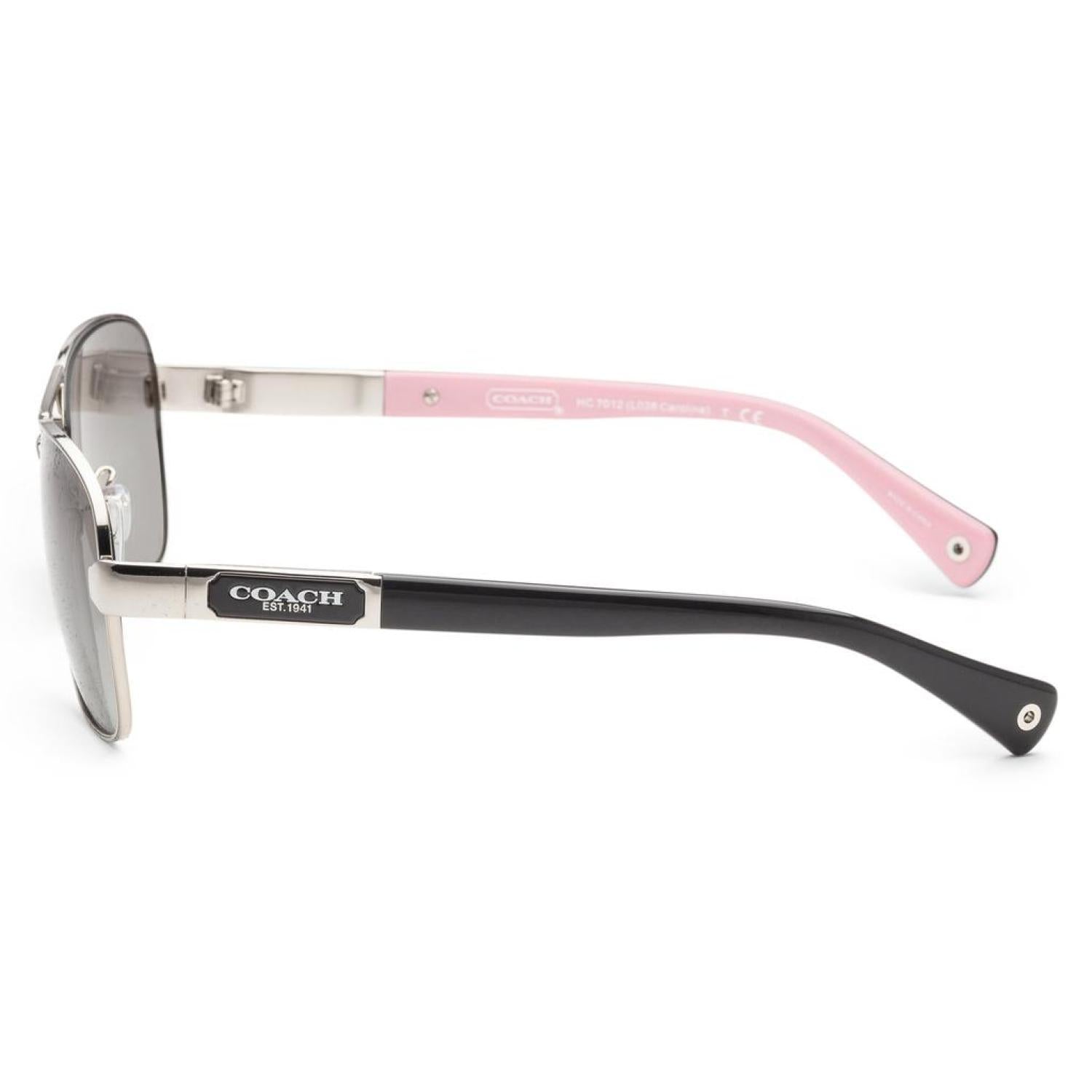 The Coach women's sunglasses measure at 56 mm lends width, 14 mm bridge width, and 130 mm arm length. The frame is aviator-shaped silver metal. The lenses are grey gradient. Made in Italy. (HC7012-910211-56)