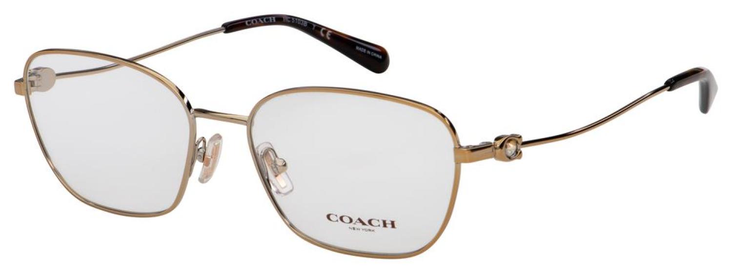 The Coach women's Opticals measure at 54 mm lens width, 17 mm bridge width, and 140 mm arm length. The frame is square-shaped light gold metal. Made in China (HC5103B-9005-54)