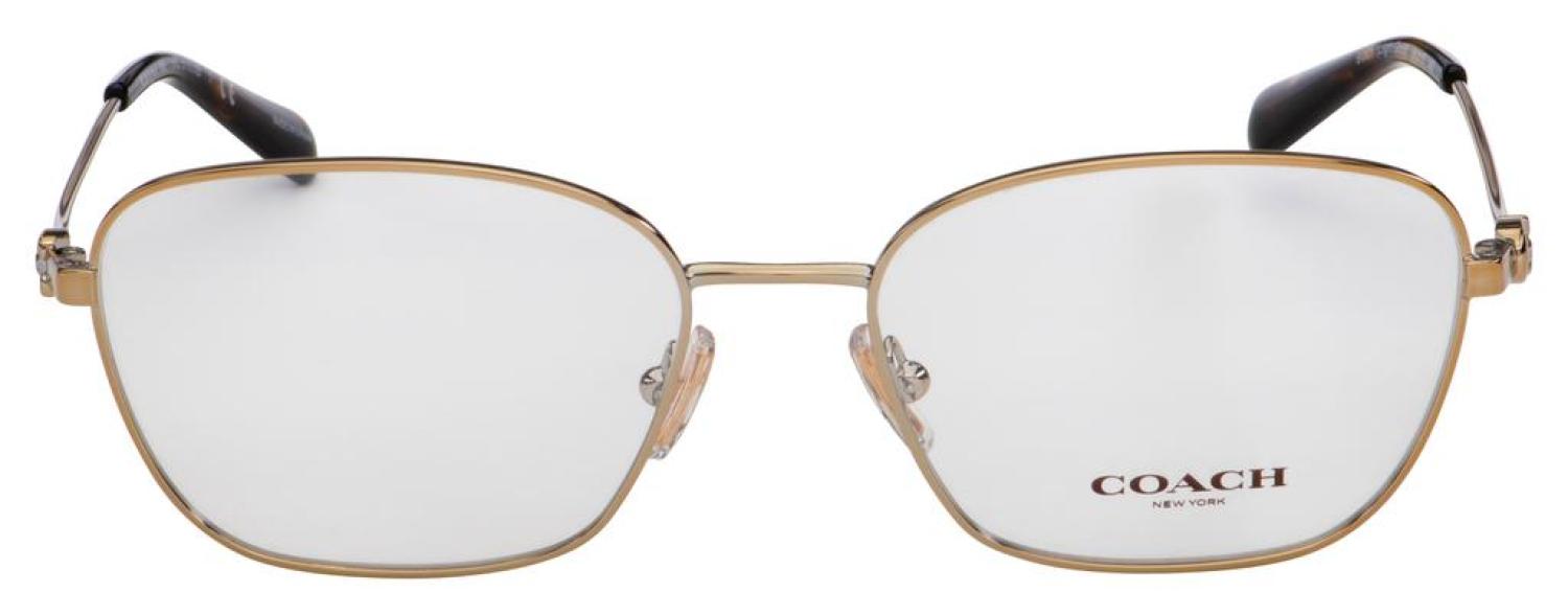 • The Coach women's Opticals measure at 54 mm lens width, 17 mm bridge width, and 140 mm arm length. The frame is square-shaped light gold metal. Made in China (HC5103B-9005-54)