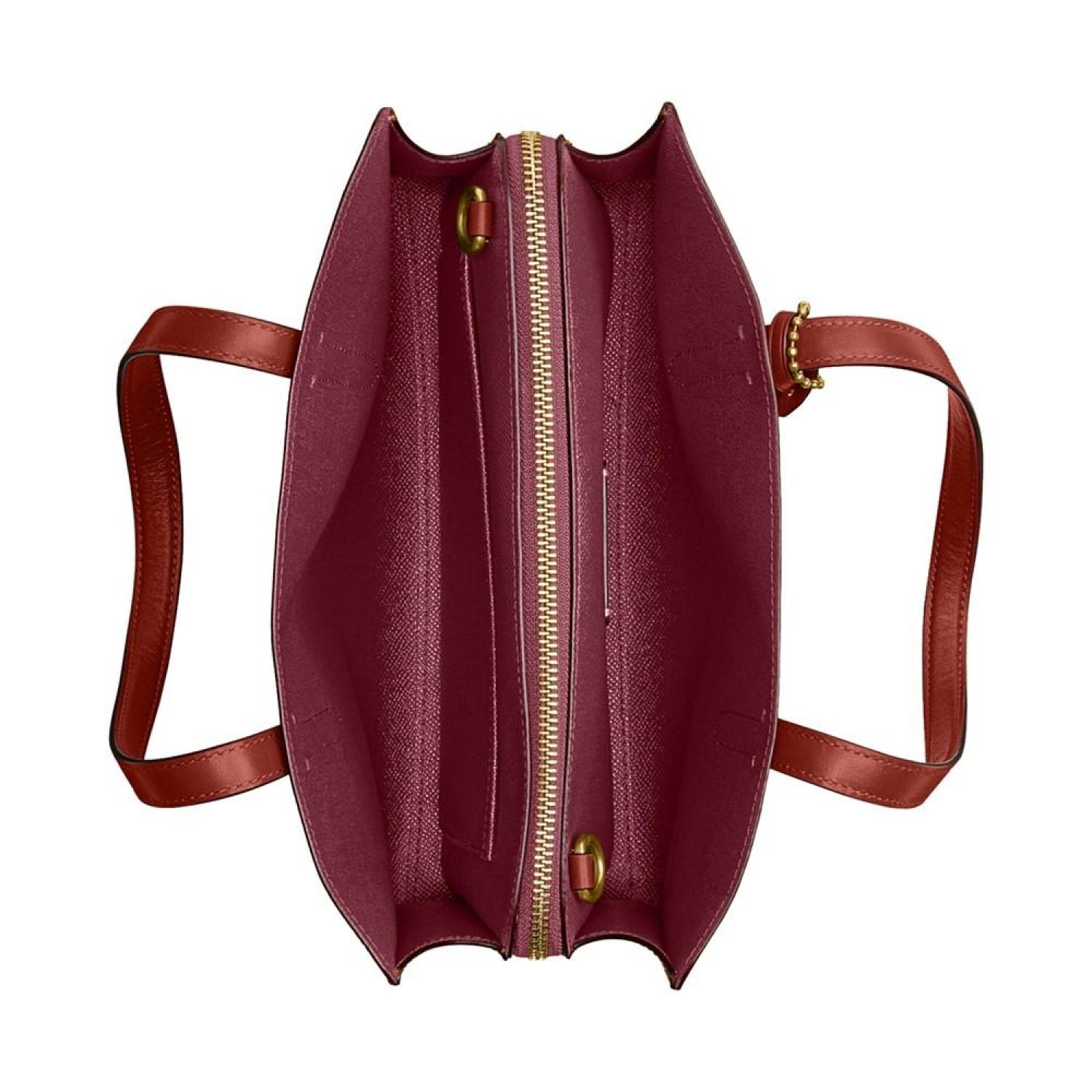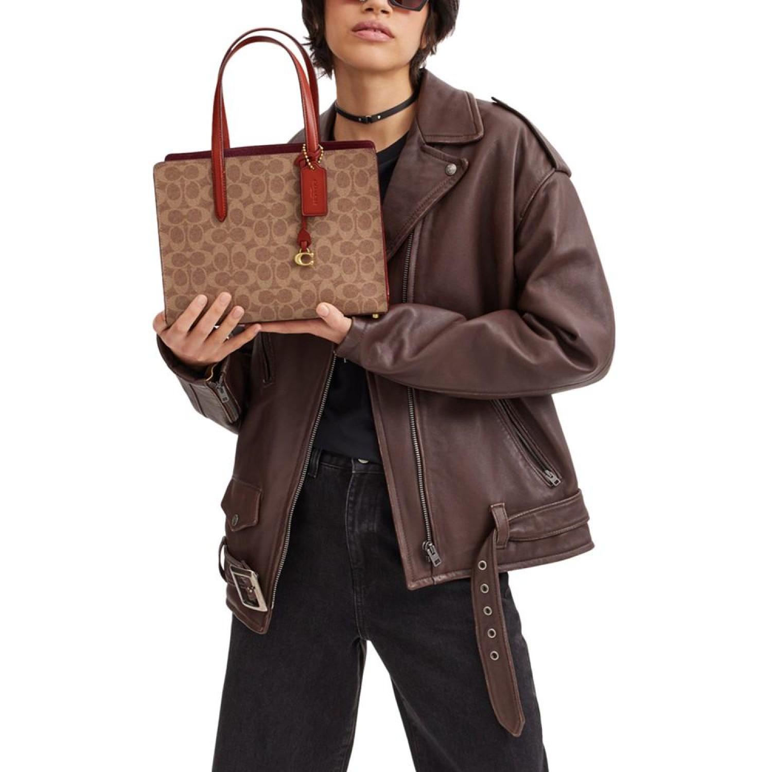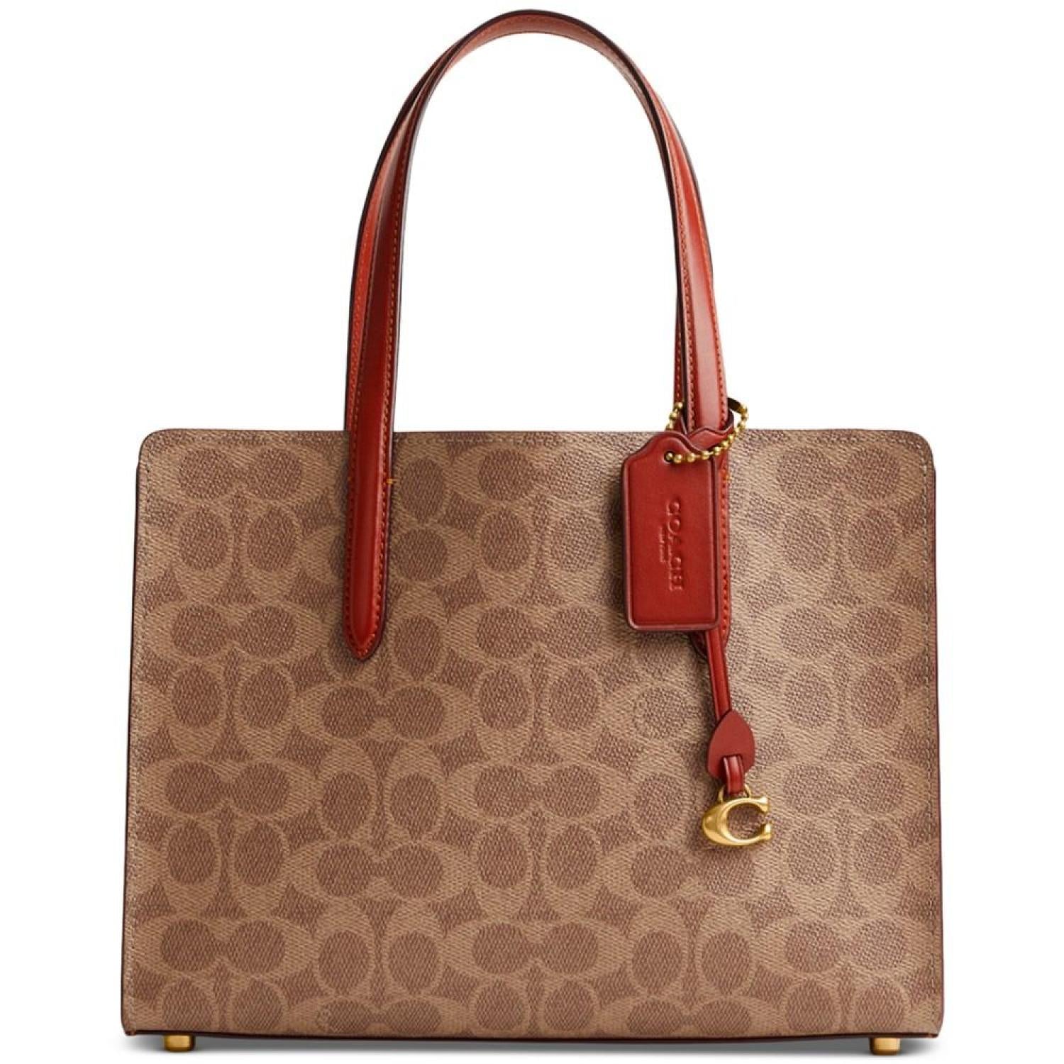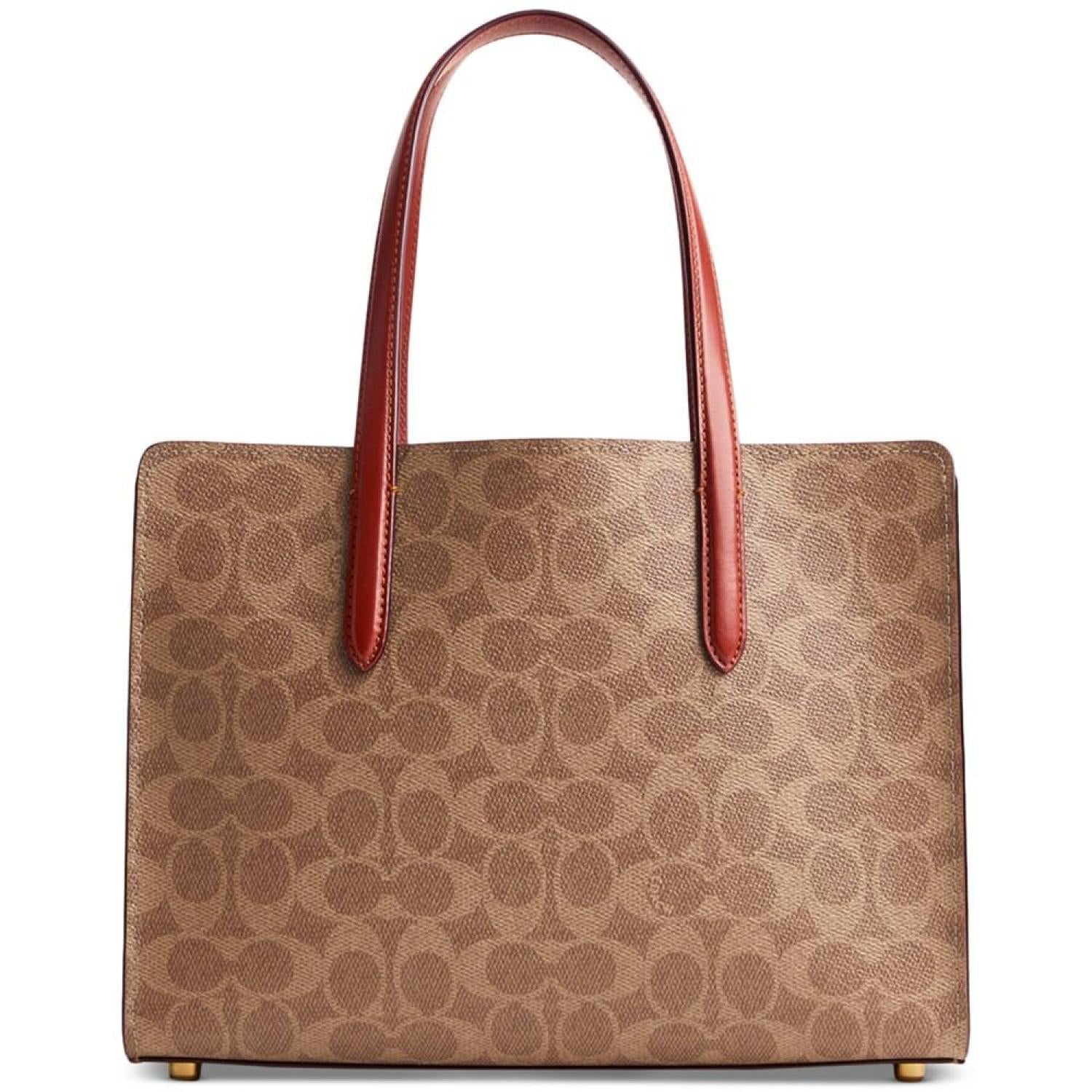 Keep it together in classic COACH style with the Coated Canvas Signature Carter Carryall 28. Medium sized bag; 11"W x 8"H x 4-1/4"D (width is measured across the bottom of handbag); 1.76 lbs. approx. weight Silhouette is based off 5'9" model 6"L handles; 21-1/2"L removable strap Open top Brass-tone hardware & protective metal feet at base Interior center zip compartment & slip pocket Spot clean Imported