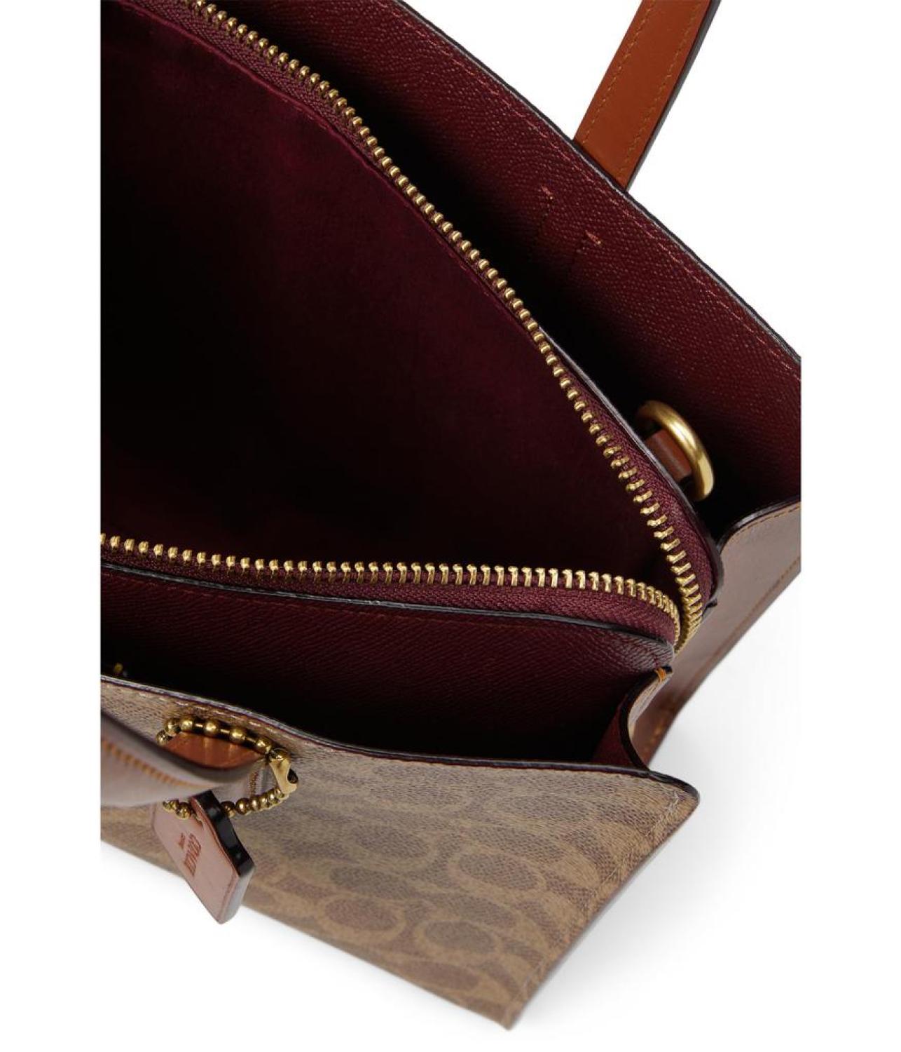 Please Note: COACH™ items cannot be shipped to military addresses (APO or FPO) and addresses in Hawaii, the Virgin Islands, Guam or any other locations outside of the continental US. Fancy and functional, the COACH™ Coated Canvas Signature Carter Carryall 28 is something you would love to carry almost anywhere from office to shopping sprees. Crafted in signature coated canvas and refined calf leather, this bag is secured with a zippered top closure. It is detailed with multiple compartments and comes with dual top handles and a detachable and adjustable crossbody strap. One zippered interior middle compartment, three open compartments, and one back slip compartment. Iconic C dangle charm included. Cotton lining. Imported. Measurements: Bottom Width: 11 in Depth: 3 in Height: 8 in Strap Length: 50 in Strap Drop: 25 in Handle Length: 14 in Handle Drop: 6 1/2 in Weight: 1 lb 7 oz