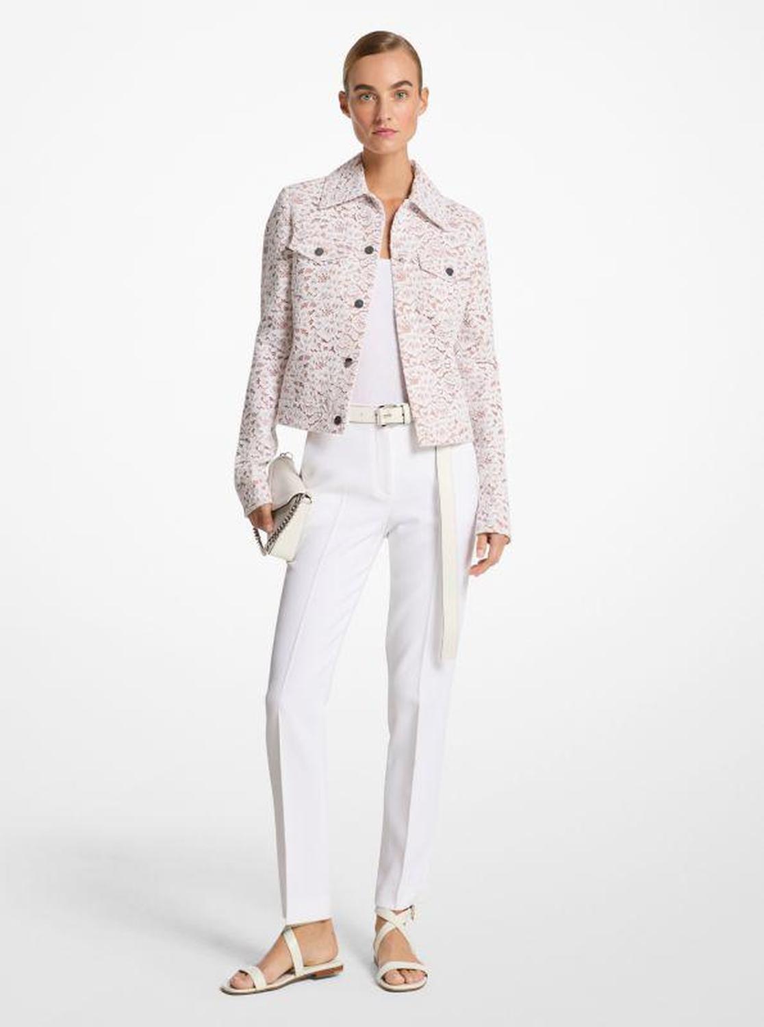 Corded floral lace offers a sophisticated and refreshing take on the ubiquitous jean jacket. This Italian-crafted masterpiece is detailed with two front pockets and snap buttons, ensuring it’s as functional as it is fashionable.
