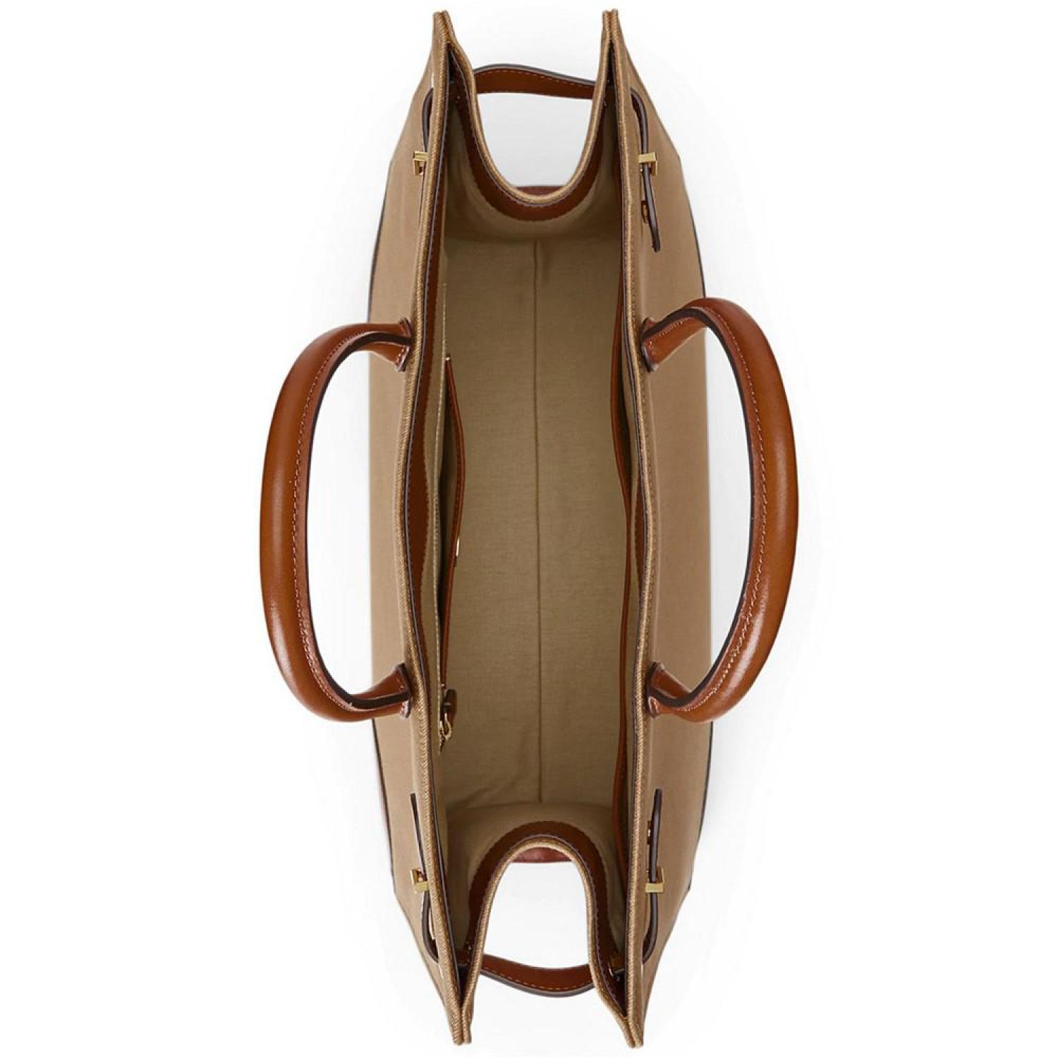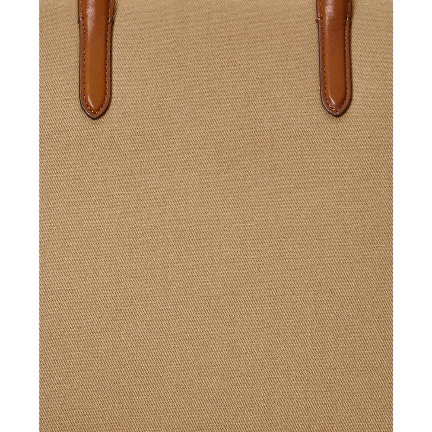 Rendered in smooth and sophisticated cotton twill, Lauren Ralph Lauren's Devyn tote bag is designed with a spacious silhouette and a myriad of pockets, offering ample storage for your essentials. Large sized bag; 16-1/2"W x 13"H x 7"D (width is measured across the bottom of handbag); 3.25 lbs. approx. weight Silhouette is based off 5'9" model 5"L top handles Open top Gold-tone hardware Interior zip & slip pockets Dust bag included Cotton; trim: leather Wipe clean Imported