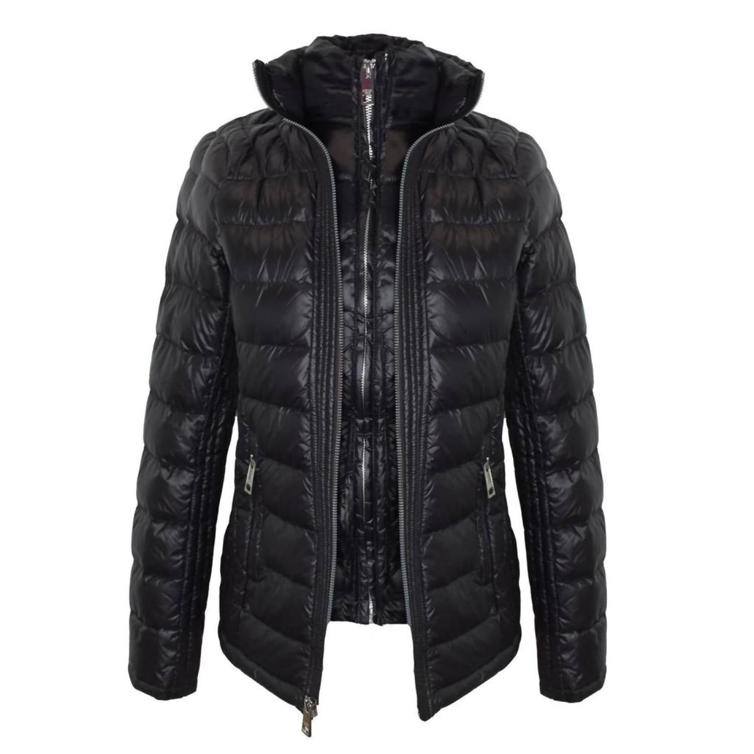 • Cozy, cute and timeless. The puffer jacket that will keep you warm all season long.Down Fill. Double Layered Zip. Hidden hood, (collars zip open for hood). Silver Hardware.