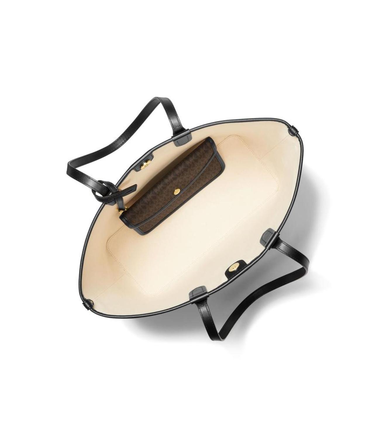 • Step into success carrying the MICHAEL Michael Kors® Eliza Large East/West Open Tote. Crafted from faux leather, it features open top magnetic closure. With allover iconic brand detailing and eye-catching leopard print on the front makes it a perfect day-to-day handbag.
