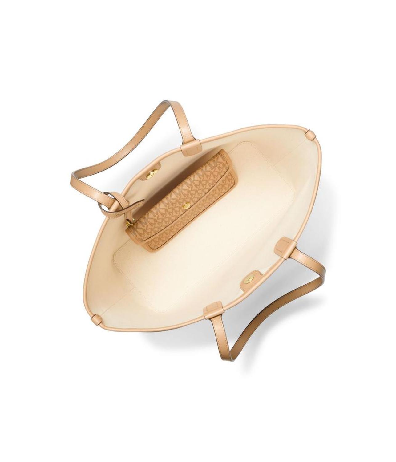• Reinforce your iconic look carrying the MICHAEL Michael Kors® Eliza Large East/West Open Tote. It features two top handles, magnetic closure, and one main compartment. The allover monogram detailing adds an exquisite touch.