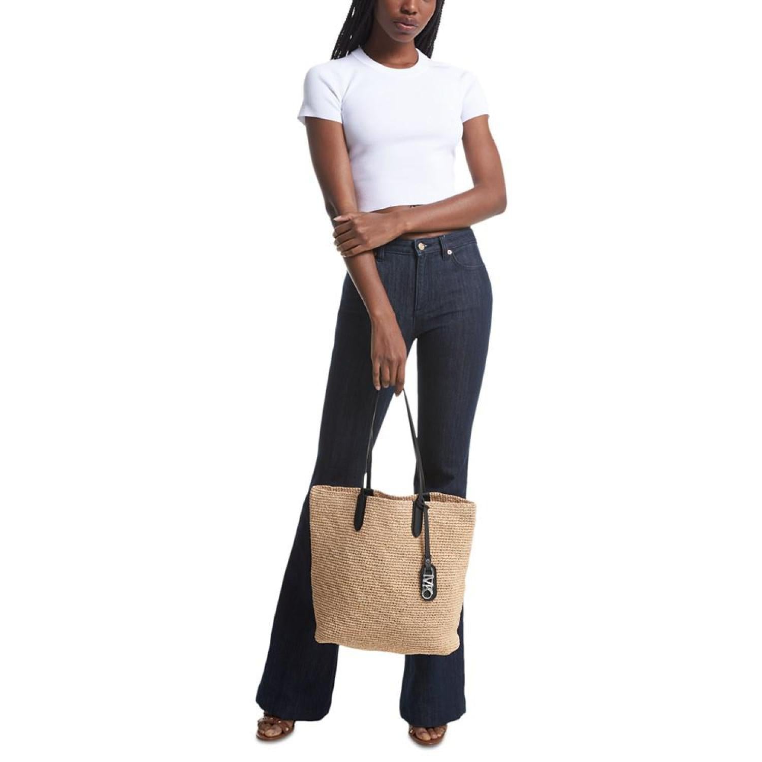 • Naturally elegant, the Eliza Medium North South Woven Tote by MICHAEL Michael Kors is the perfect way to elevate your warm-weather style.