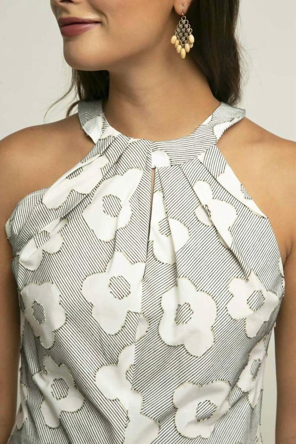 • A timeless blouse that will never go out of style.The Ella Top is a halter-style top with a draped neckline that falls in flattering pleats and a side zip for a waist-skimming fit. Our Pound Cake print is a textured striped floral in a soft neutral shade. Cotton/polyester Made in Los Angeles, USA