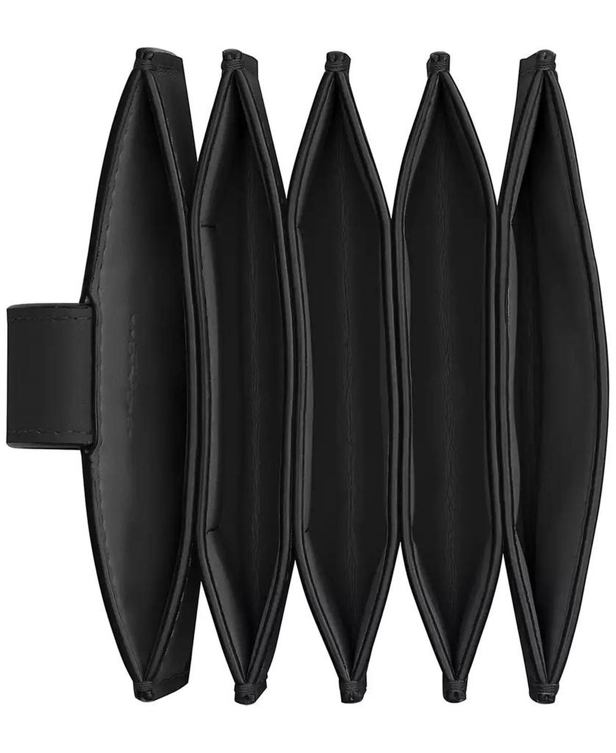 Simple and refined, staying organized is easy with this five-compartment leather card holder by COACH. 4-1/4"W x 2-1/4"H; 0.18 lbs. approx. weight Snap closure Brass-tone hardware & logo, 5 interior compartments Leather Spot clean Imported