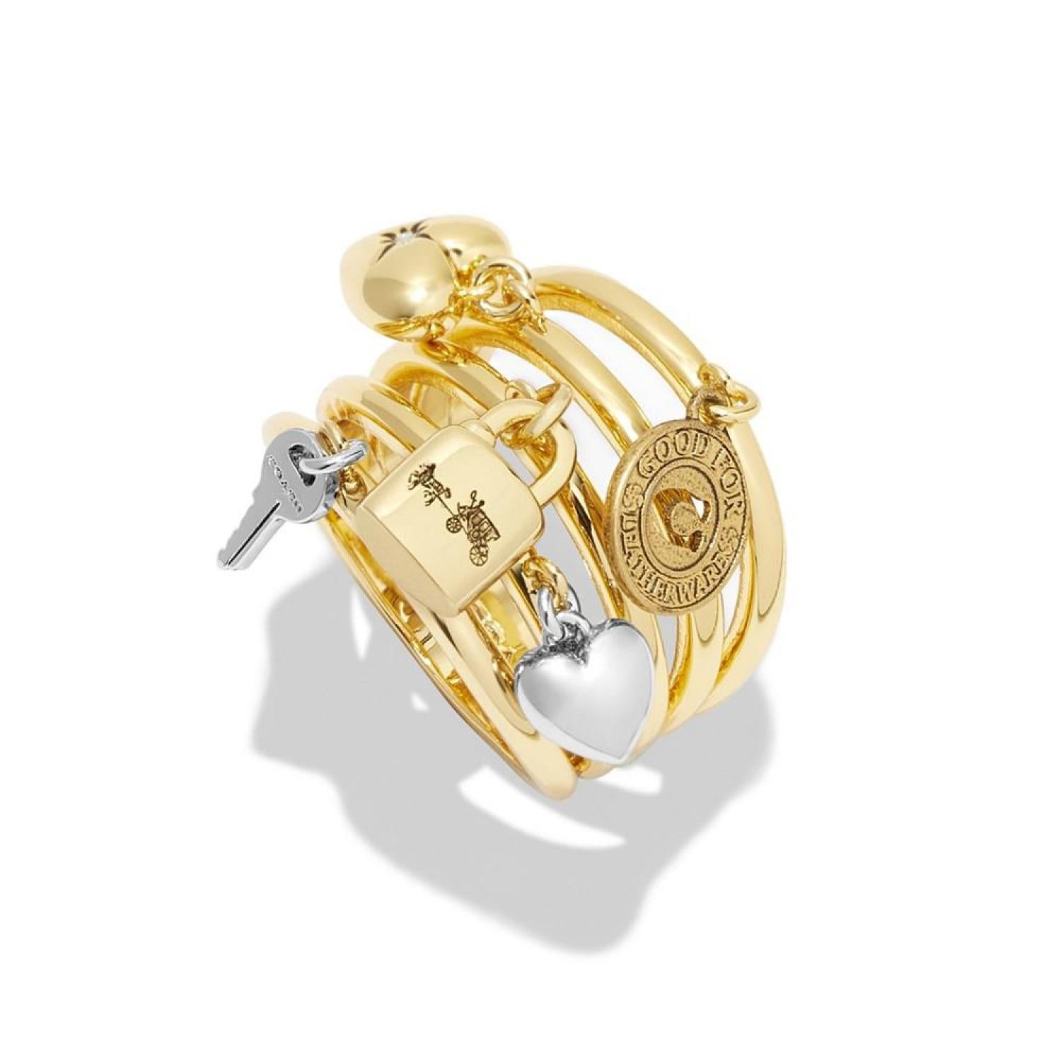 Striking multi-row ring adorned with small mixed charms including coin, hearts, padlock and hey. Charms adorned with signature motifs and delicate stones. Faux stone- made of glass crystal Set in brass with two-tone plating Ring size- 7 Approx. ring face length- 0.7" Approx. ring band width- 5-18mm Slip-on closure Includes COACH pouch This item purchased online must be returned to the vendor by mail only. This item cannot be returned to Macy's stores. Wipe Clean Imported
