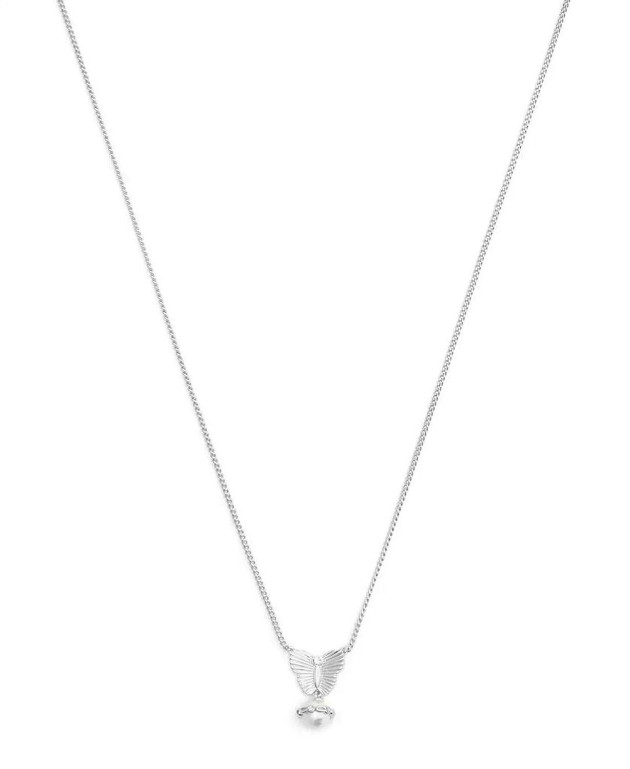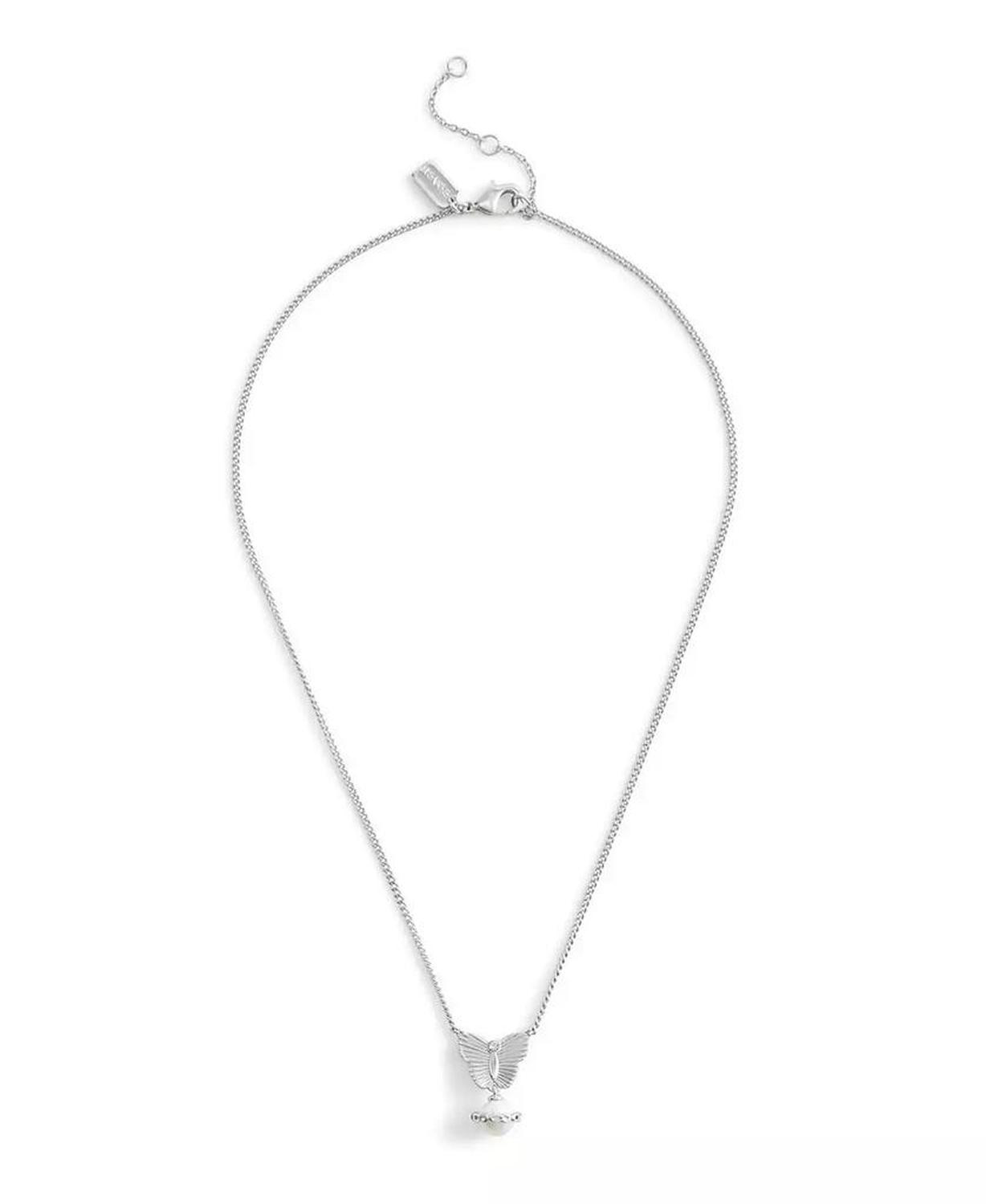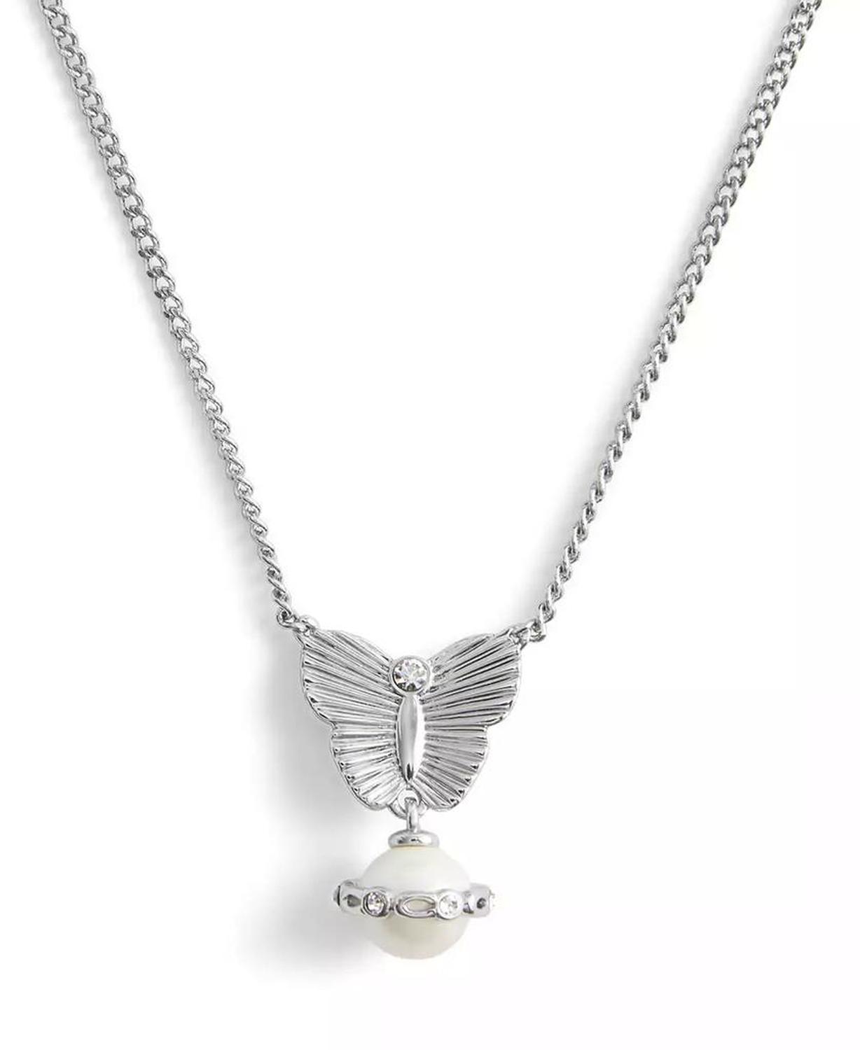Refined chain necklace featuring textured butterfly pendant paired with delicate cultivated pearl haloed with signature sculpted C hardware and delicate stones. Set in polished rhodium finish brass Approx. length: 16" + 2" extender Approx. Pendant Drop: 3/4" Approx. Pendant Width: 1/2" Lobster clasp closure Chain type: Link Faux stone made of glass Includes signature COACH jewelry dustbag. Faux cultivated pearl made of glass Wipe clean Imported