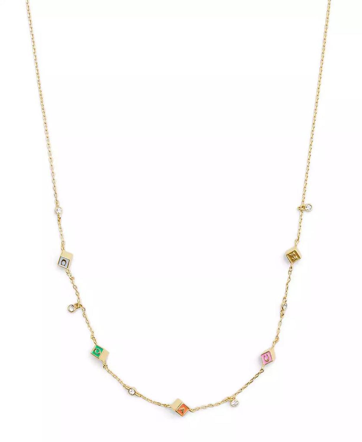 Refined chain strand necklace featuring playful cube beads spelling out signature COACH in colorful enamel. Adorned with minimal sparkly stones. Set in polished gold-tone finish brass Approx. length: 16" + 2" Extender Approx. frontal drop: 1/5" Lobster clasp closure Chain type: Link Faux stone made of glass Includes signature COACH jewelry dustbag Wipe clean Imported