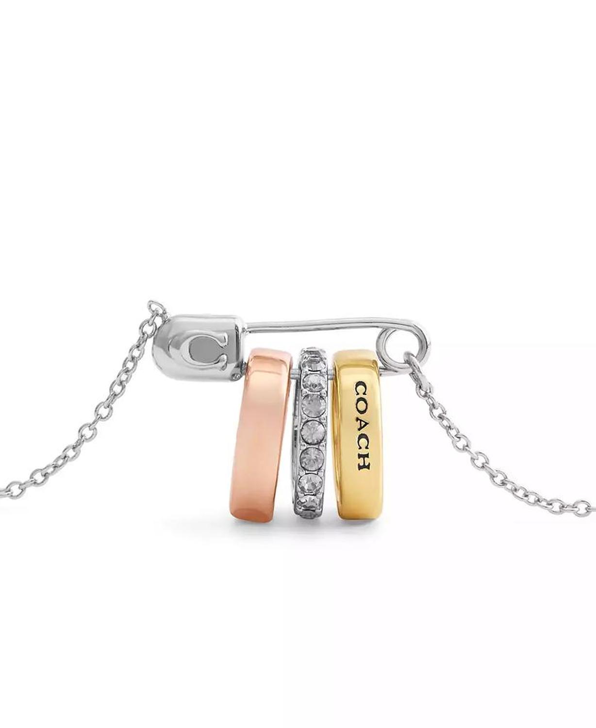 • Refined chain necklace featuring playful safety pin pendant adorned with signature sculpted C and neutral tri-tone finish mixed rondelles. Adorned with delicate crystal stones.