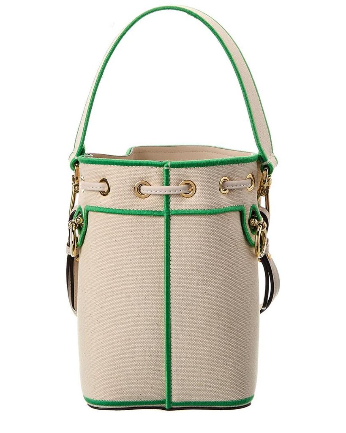 Introducing the FENDI Mon Tresor Mini Canvas Bucket Bag - the perfect addition to any fashion-forward woman's handbag collection. Crafted from exquisite white and green canvas and finished with gold-tone hardware, this bucket bag is a statement piece that exudes elegance and sophistication. The design features logo embroidery and logo charm detailing, making it instantly recognizable as a FENDI creation. The interior is lined with durable canvas, ensuring that your belongings remain safe and secure. Measuring 5 inches wide, 7 inches high, and 4.5 inches deep, this bag is the ideal size for everyday use. The top handle has a drop of 7 inches, while the removable shoulder strap drops 24 inches, allowing for versatile styling options. The drawstring closure adds an extra layer of security. Please note, all measurements were taken by hand and are approximate; slight variations may occur. Rest assured, our products are 100% genuine. While we sometimes purchase merchandise from trusted independent suppliers and not directly from the brand owner, we guarantee the authenticity of every product we sell. Shop with confidence and add the FENDI Mon Tresor Mini Canvas Bucket Bag to your wardrobe today.