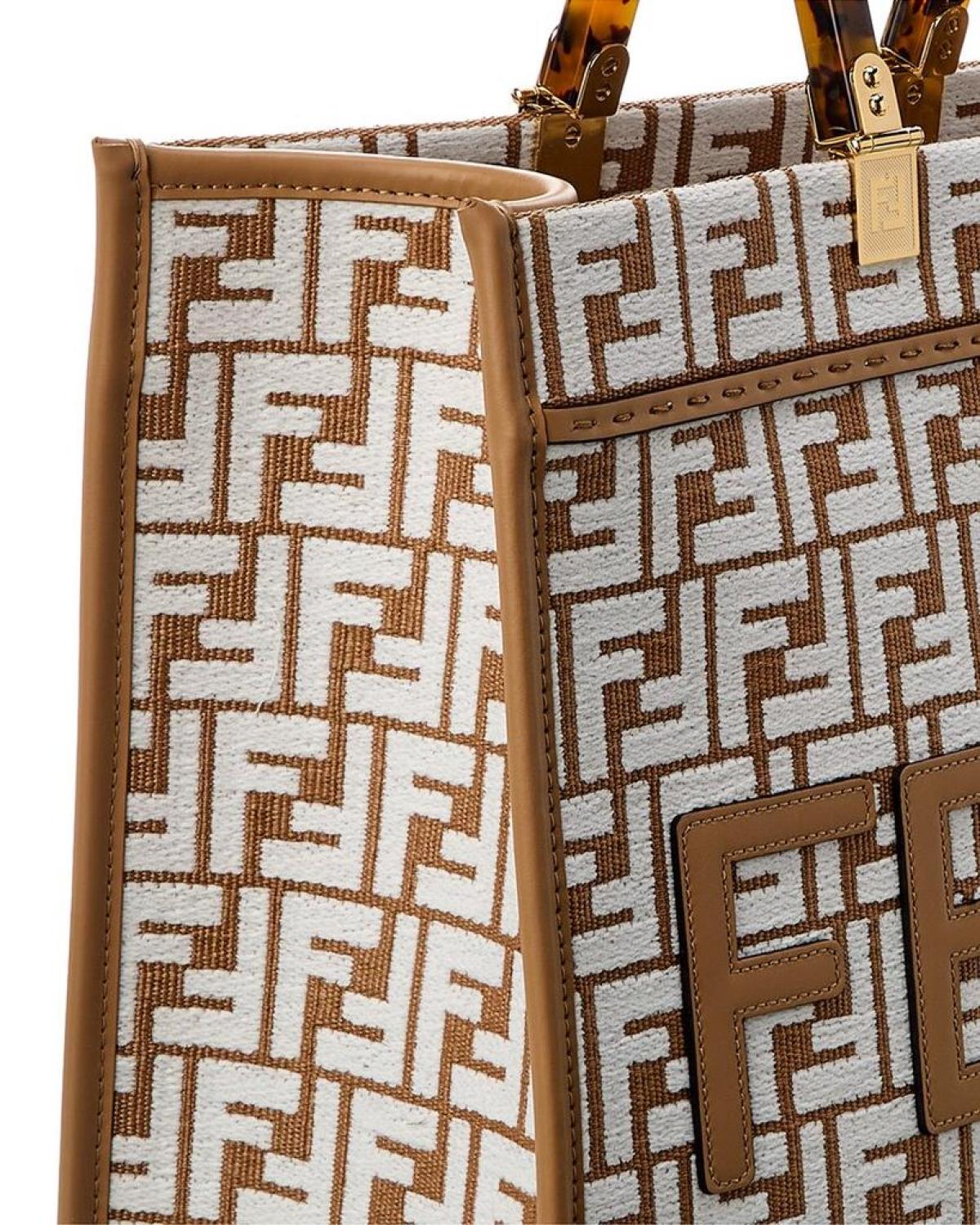 • Introducing the FENDI Sunshine Medium Raffia & Leather Tote, the epitome of innovative and elegant Italian luxury. This stunning handbag embodies the perfect combination of classic style and contemporary design. Crafted in Italy, this tote showcases the brand's impeccable craftsmanship and attention to detail.The FENDI Sunshine Tote features a contrasting combination of beige and white FF raffia, chenille fabric, and leather. The luxurious gold-tone hardware and plexiglass top handles add a touch of sophistication to the overall design.Designed with functionality in mind, this tote offers a spacious suede-lined interior, ensuring ample space for all your essentials. Measuring 16 inches wide, 14 inches high, and 8.5 inches deep, it provides enough room to accommodate your daily necessities.Featuring a convenient open top, this tote allows for easy access to your belongings. The top handles have a drop of 5 inches, while the removable shoulder strap offers a drop of 17.5 inches, providing versatility in carrying options.Please note that all measurements are approximate, as slight variations may occur due to the handmade nature of the product. Rest assured, our products are 100% genuine. While we sometimes source merchandise from trusted independent suppliers, we guarantee the authenticity of every product sold on our site.Elevate your style and make a statement with the FENDI Sunshine Medium Raffia & Leather Tote. Embrace Italian luxury and be the envy of every fashion enthusiast. Shop now and experience the beauty and excellence of FENDI.
