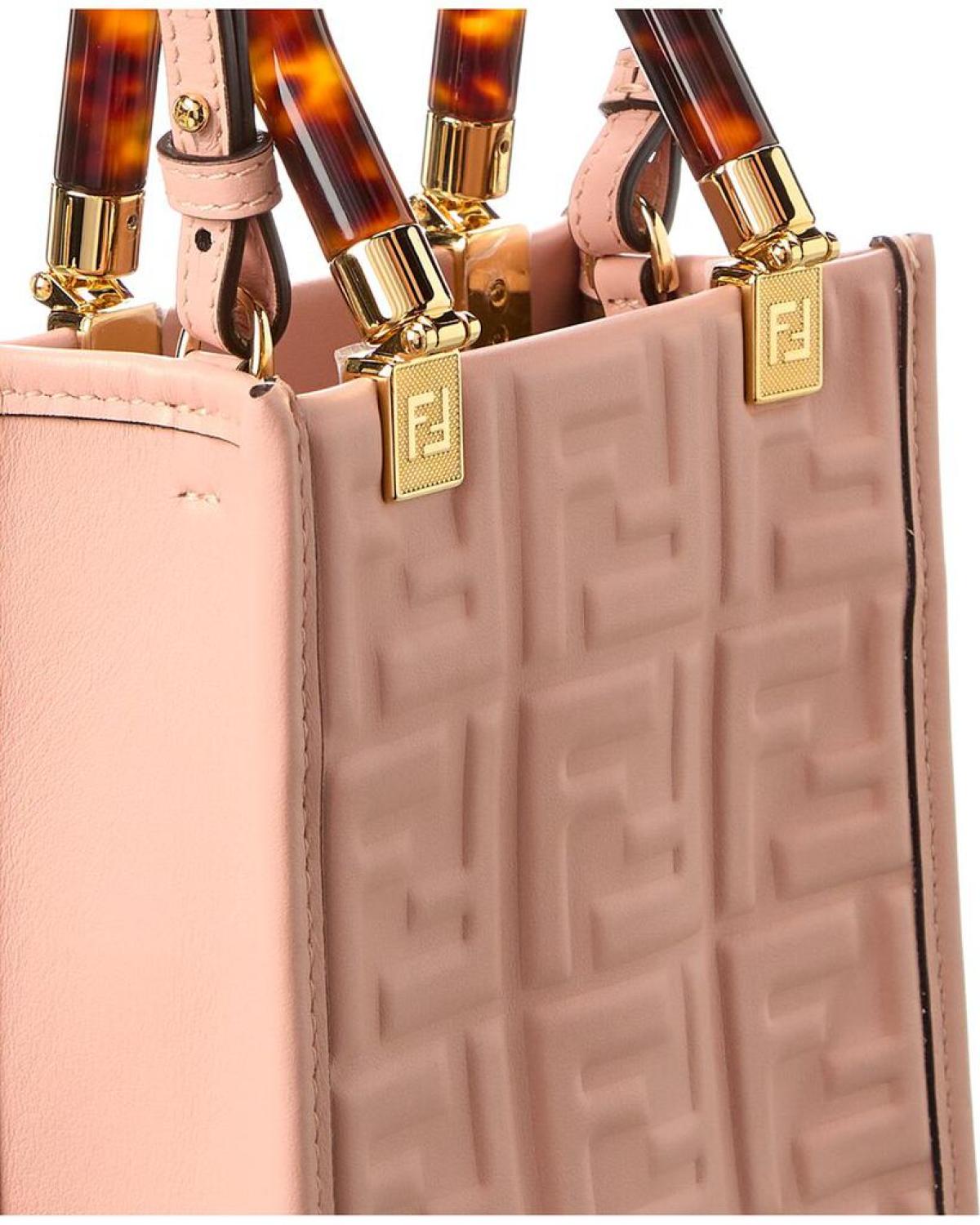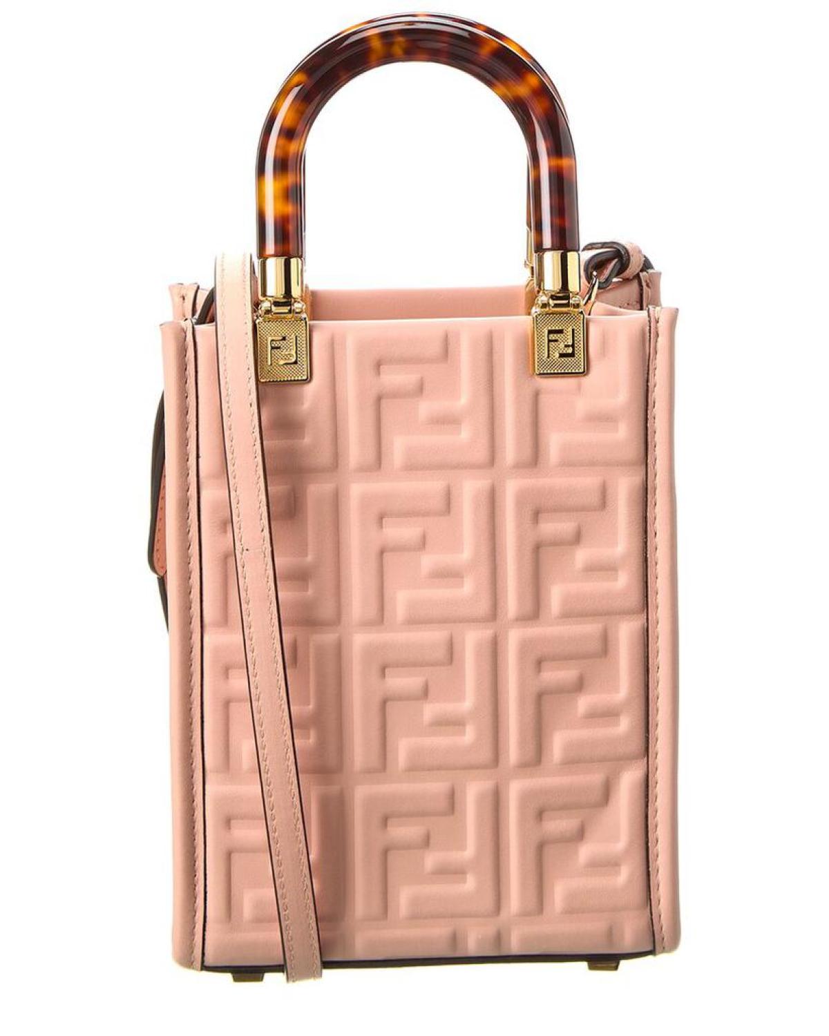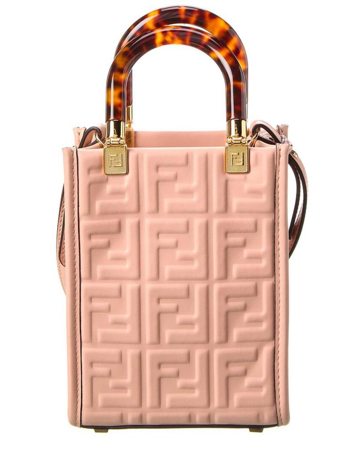 Introducing the FENDI Sunshine Mini Leather Tote, a luxurious addition to any woman's handbag collection. This tote bag boasts the iconic pink FF motif leather, accompanied by gold-tone hardware and elegant plexiglass top handles. Made in Italy with the utmost attention to detail, this tote features a fabric lining and measures 5 inches wide by 6.5 inches high by 2.5 inches deep. The top handles drop 3 inches, and a removable shoulder strap drops 23 inches, making it the perfect accessory for any occasion. Innovative and elegant, FENDI is a brand that has been creating luxury products since its inception. They are known for their exceptional quality, attention to detail, and striking design. This tote is 100% genuine, and while some products may be purchased from trusted independent suppliers, every item sold on our site is guaranteed authentic. This FENDI Sunshine Mini Leather Tote is the perfect way to show the woman in your life how much you care. Guaranteed for Mother's Day, this tote promises to be a present she will never forget. Order yours today and experience the luxury of FENDI.