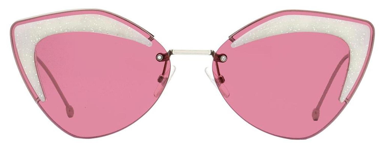 The Fendi 0355/S Sunglasses feature a rimless cat eye design for women. The lens features glitter accents at the brow line and adjustable nose pads to ensure a perfect fit. The Fendi sunglass collection features an array of shapes and styles that are daring yet express a refined chic character. Providing 100% UV protection from the suns harmful rays these sunglasses are functional in addition to being fashionable. Frame Material - Metal Frame Color - Palladium Lens Color - Maroon Size - 66-16-140 Made in Italy Includes original case and cloth