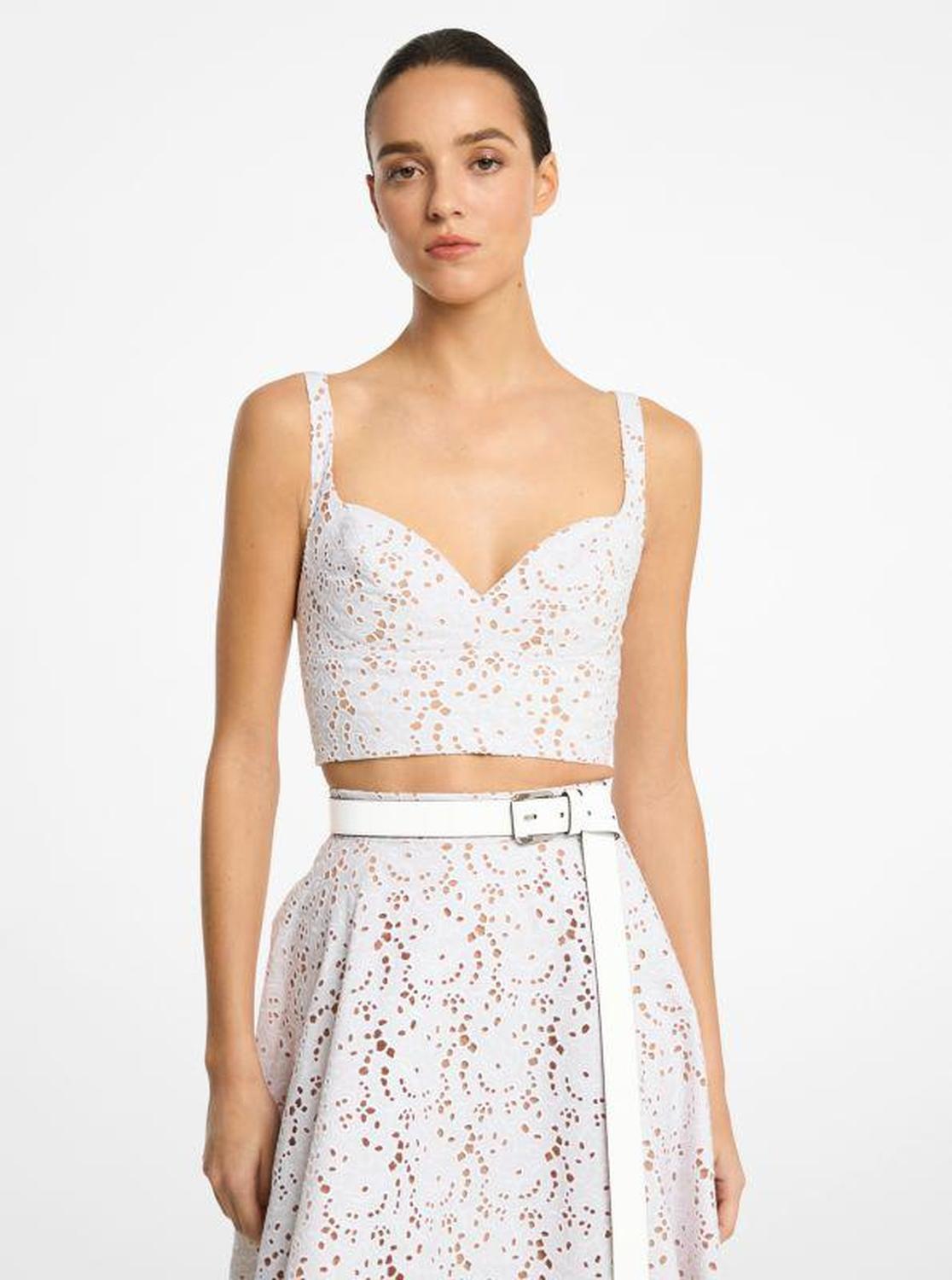 Rendered in delicate floral eyelet, this bustier top exudes romance inspired by a Mediterranean holiday. Style it with the matching skirt and white leather accessories for instant elegance. Made in Italy.