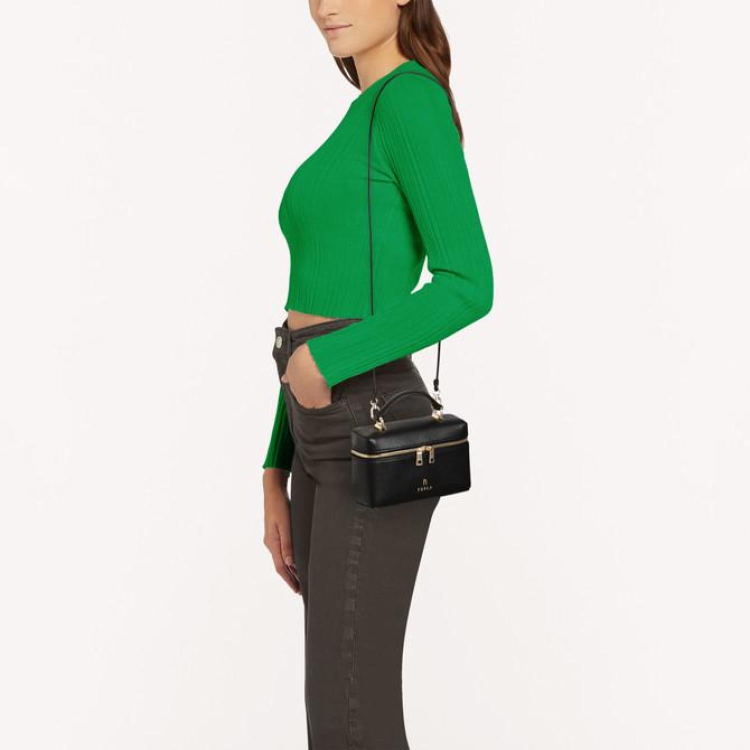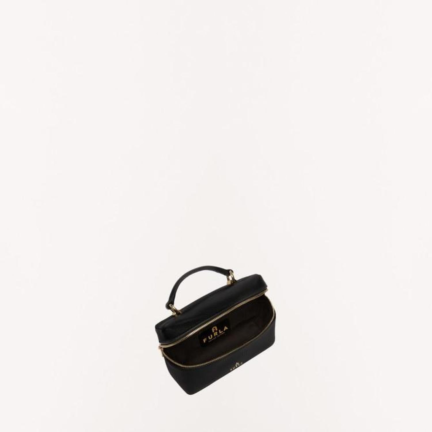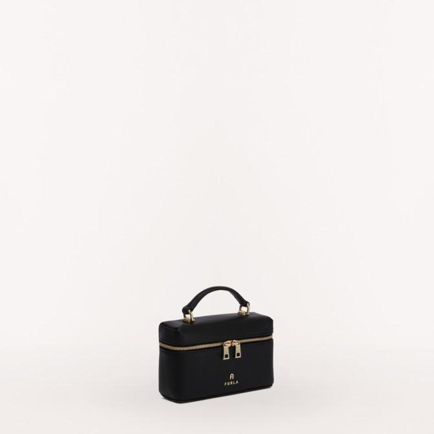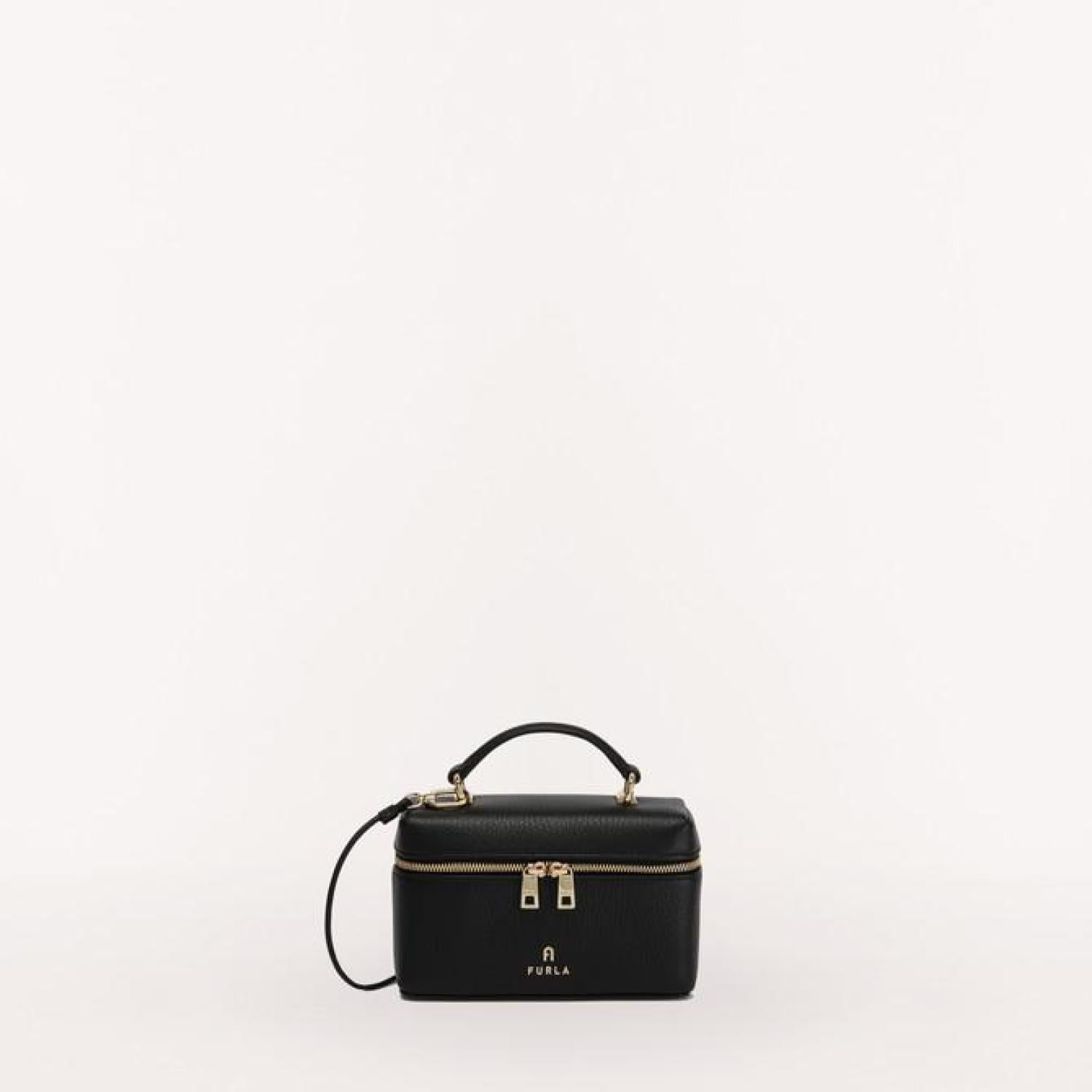 Crafted from soft and luxurious grained leather, this elegant Furla Camelia vanity case can be carried by hand or worn crossbody. The versatile piece is the ideal size for storing solely what you need in terms of cosmetics, jewellery or other small essential items. - Top handle - Removable leather strap - Two-way zipped closure - Furla logo and Arch punched on the front Dimensions 5.51 x 3.74 x 1.97 (w x h x d) material Grained Calf Leather composition 100% Leather Plating Gold Height 3.74 in product code WE00510_HSF000_1007_O6000