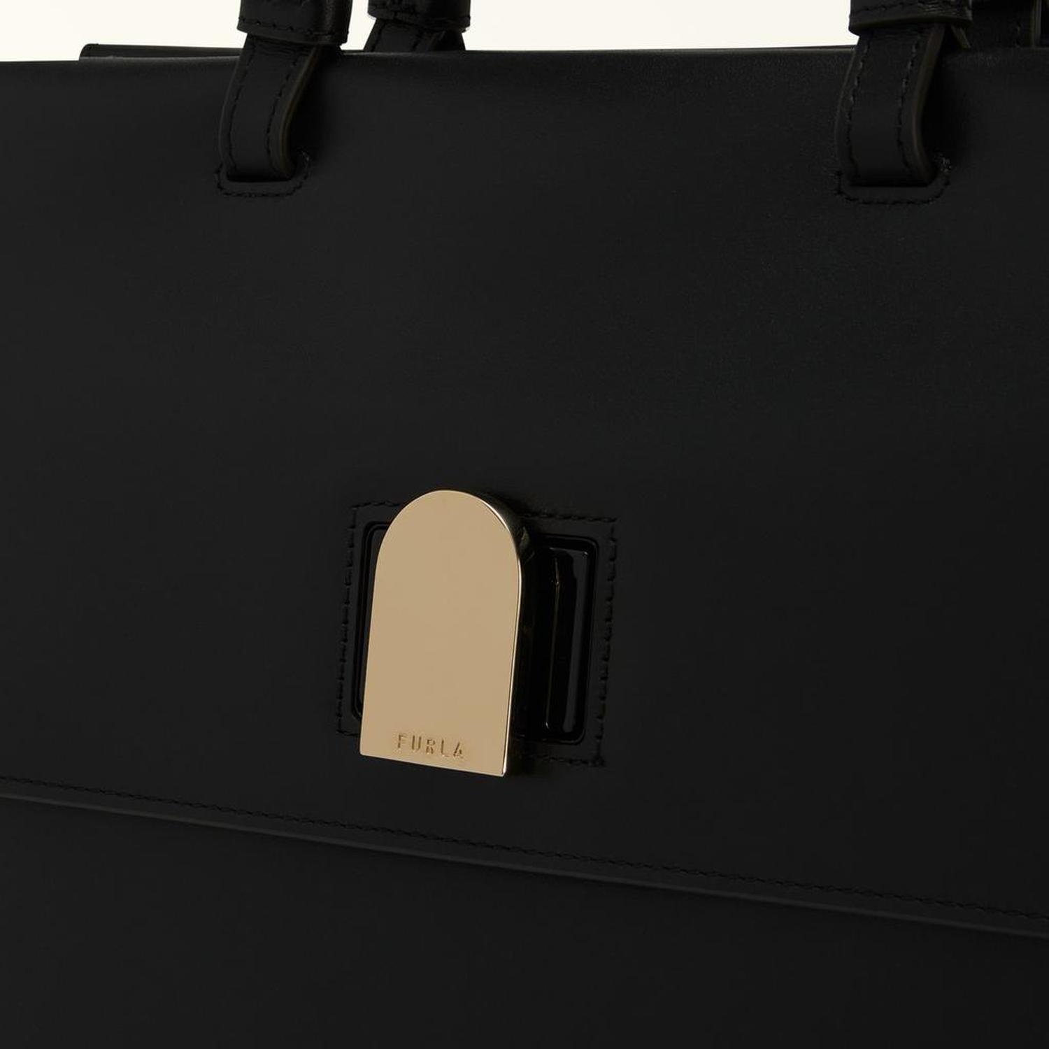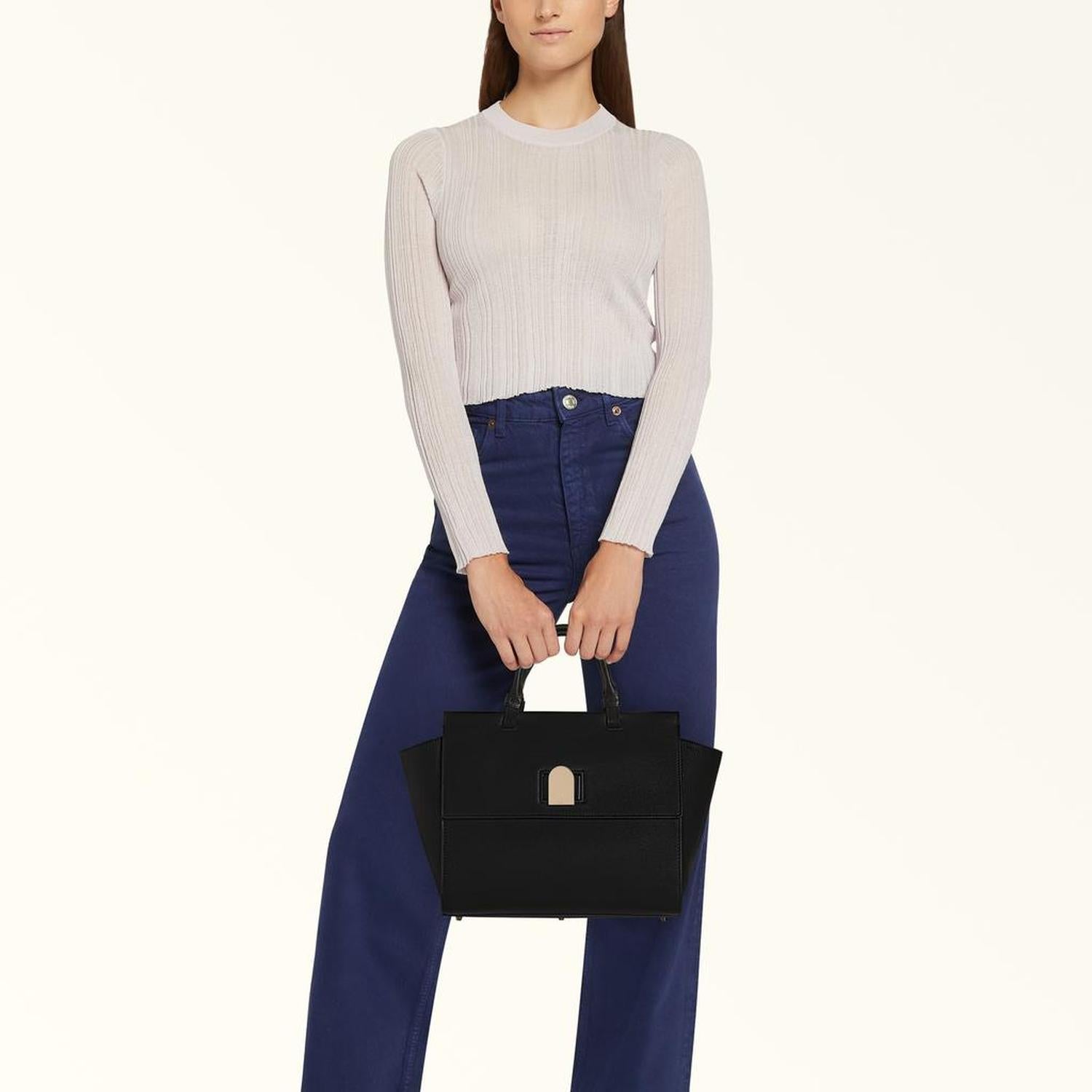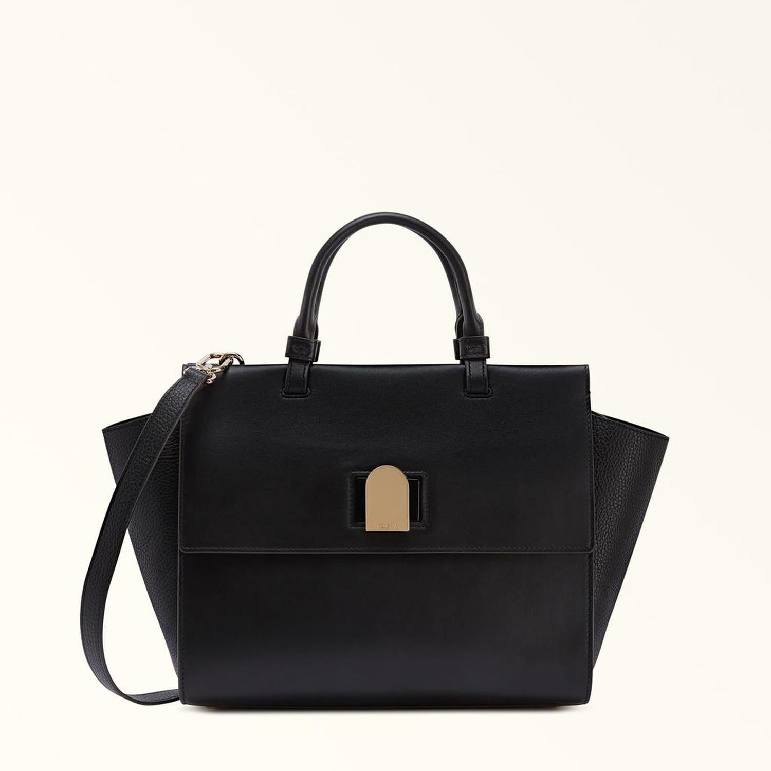 • Furla Emma is a shopping bag made in a combination of soft Roma calfskin and grained leather. The compact bag stands out for its twist closure with the Arch logo and the zip on the top. An elegant bag to carry by hand or across the body.