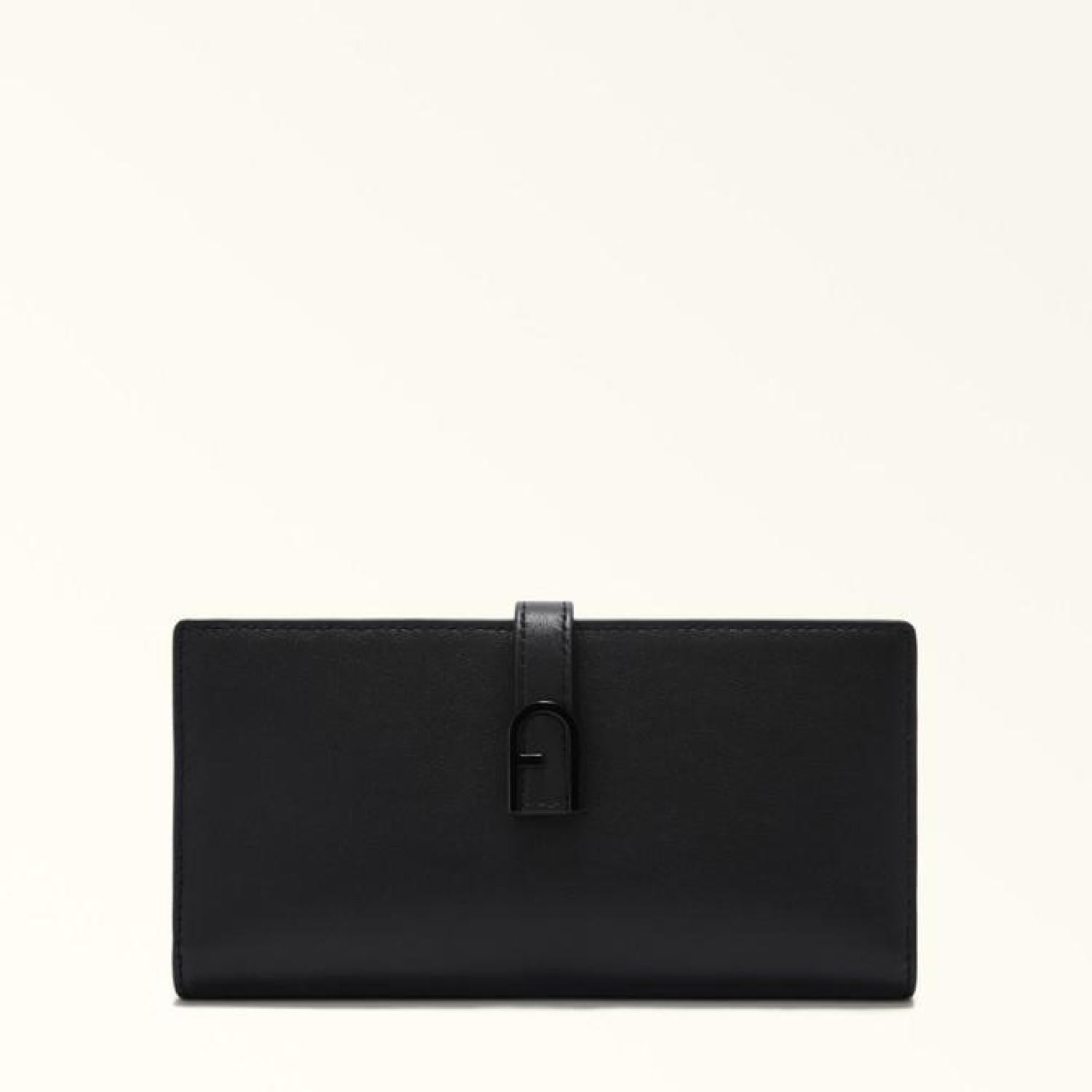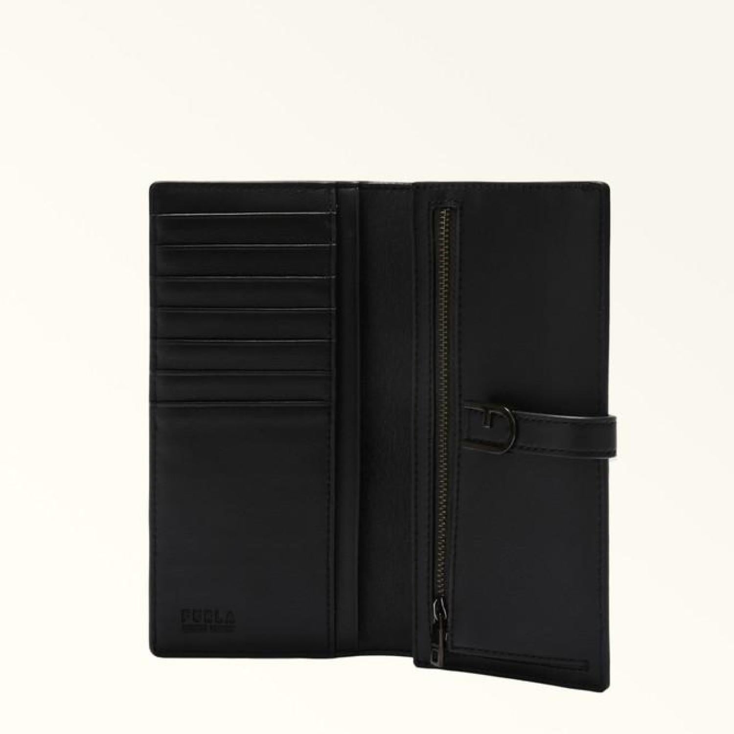 This Furla Flow continental wallet is styled in fine leather with a soft hand. A joy to touch, the super-slim bi-fold design is practical and convenient, in that it can easily fit into a bag or backpack, or even an elegant clutch. While the inside is carefully organised to hold cards, documents and banknotes, the outside boasts a press-stud closure embellished with an iconic Arch logo. - Seven inner credit card and ID slots - Inner compartment for banknotes - Three flat pockets - Zipped inner pocket Dimensions 7.28 x 3.74 x 0.79 (w x h x d) material Claris Lux Calf Leather composition 100% Leather Plating Galvanised In The Same Colour Height 3.74 in Lining 100% Viscose product code WP00402_BX2045_1020_O6000