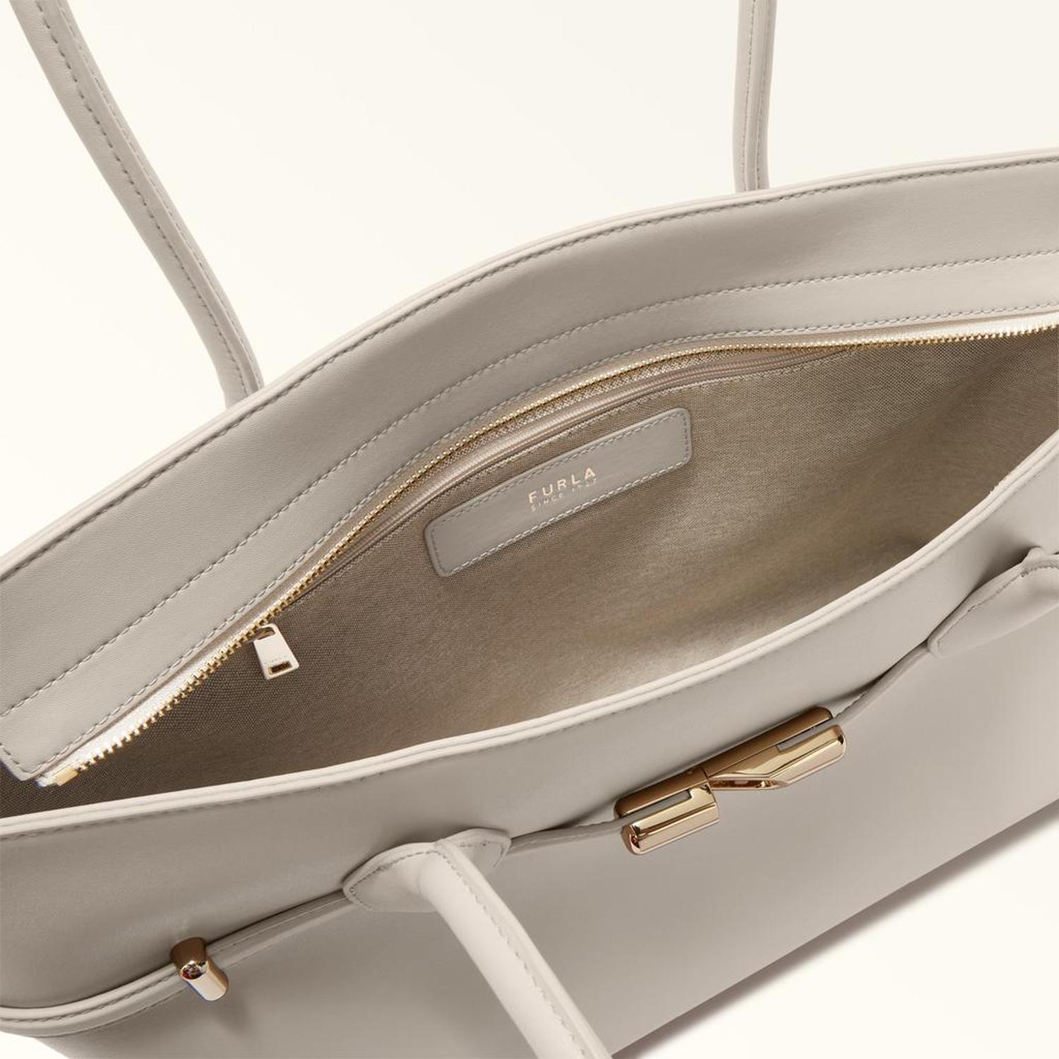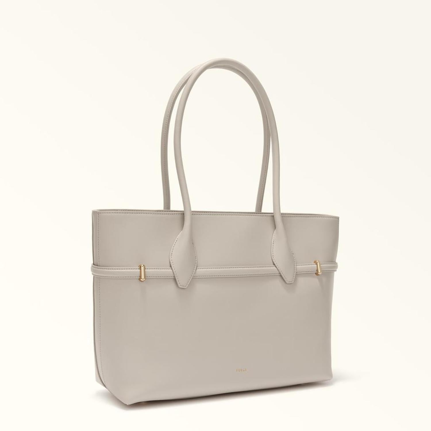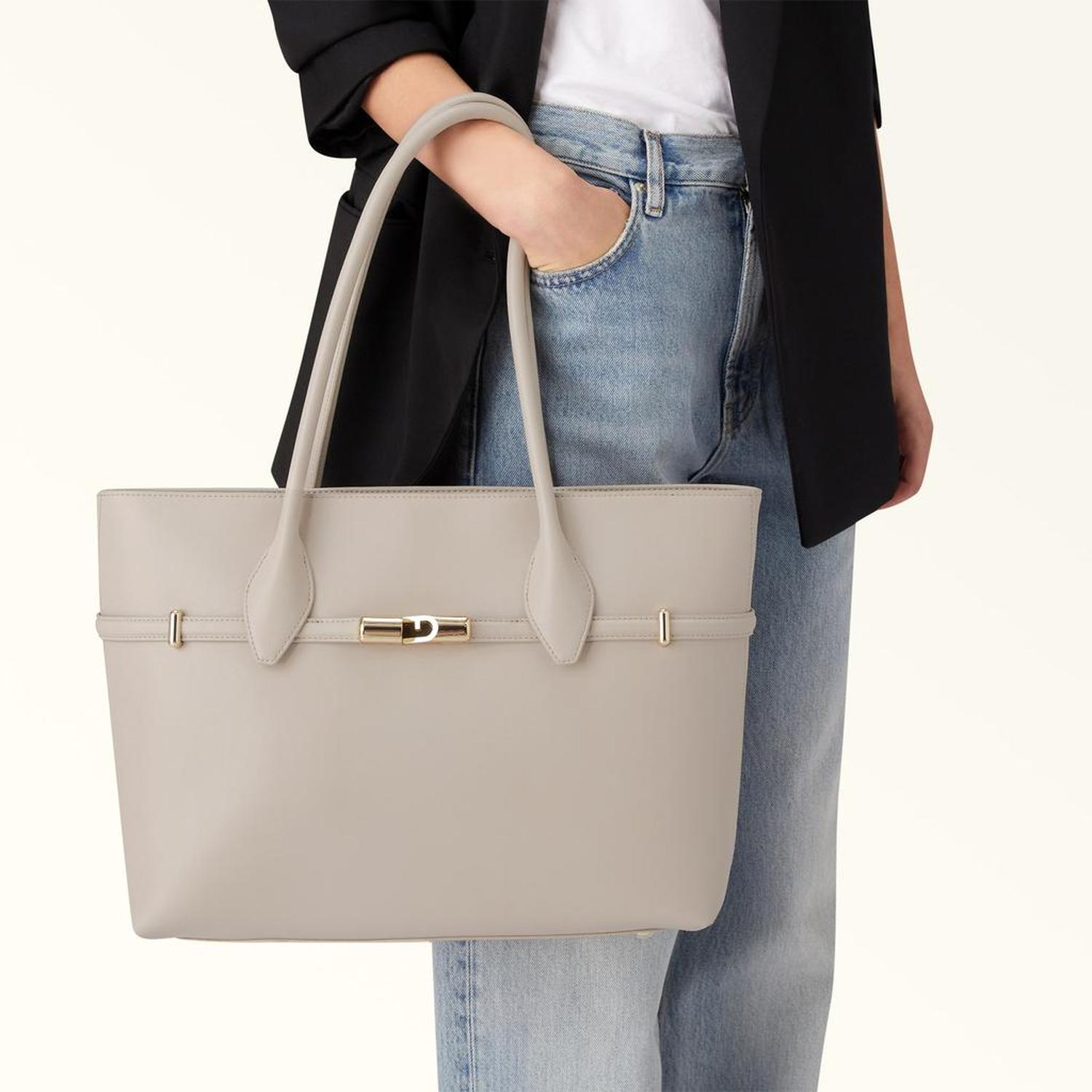 • Sleek, structured and super-spacious, this large Furla Goccia tote comes in smooth leather for a clean and simple look. The elegant and contemporary piece is perfect for everyday use, being versatile and well-organised inside, and is embellished with straps adorned with the new Furla Arch logo magnetic hardware.
