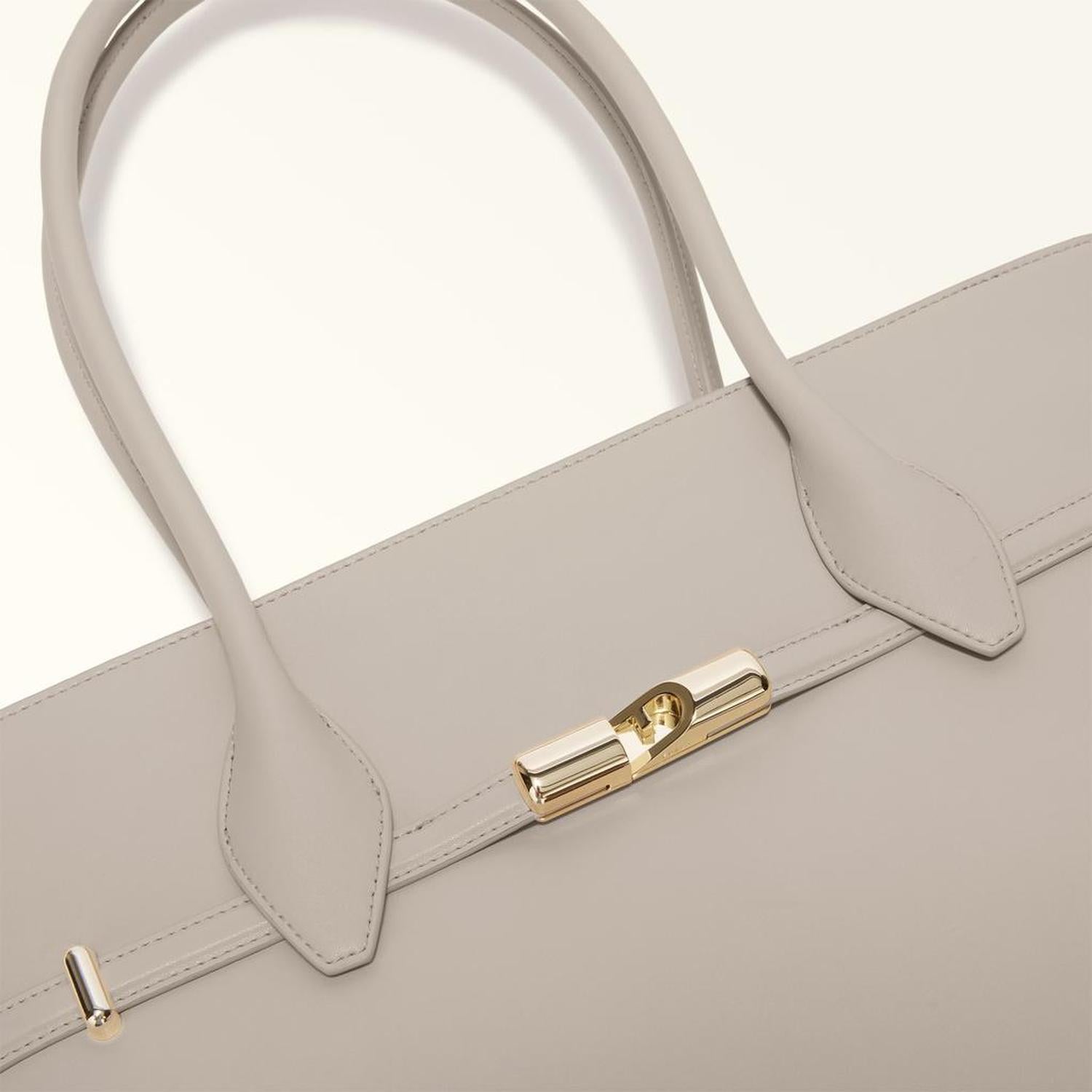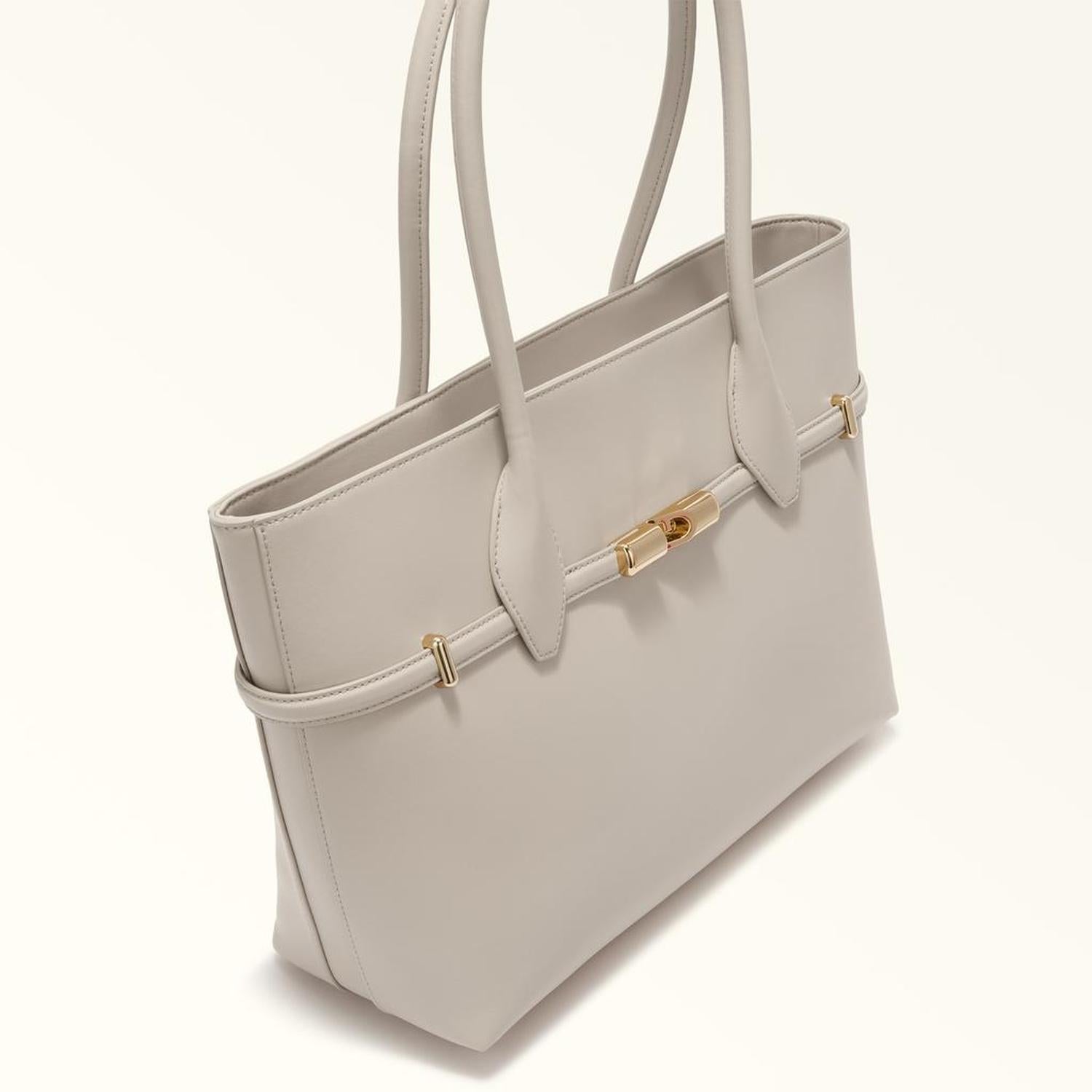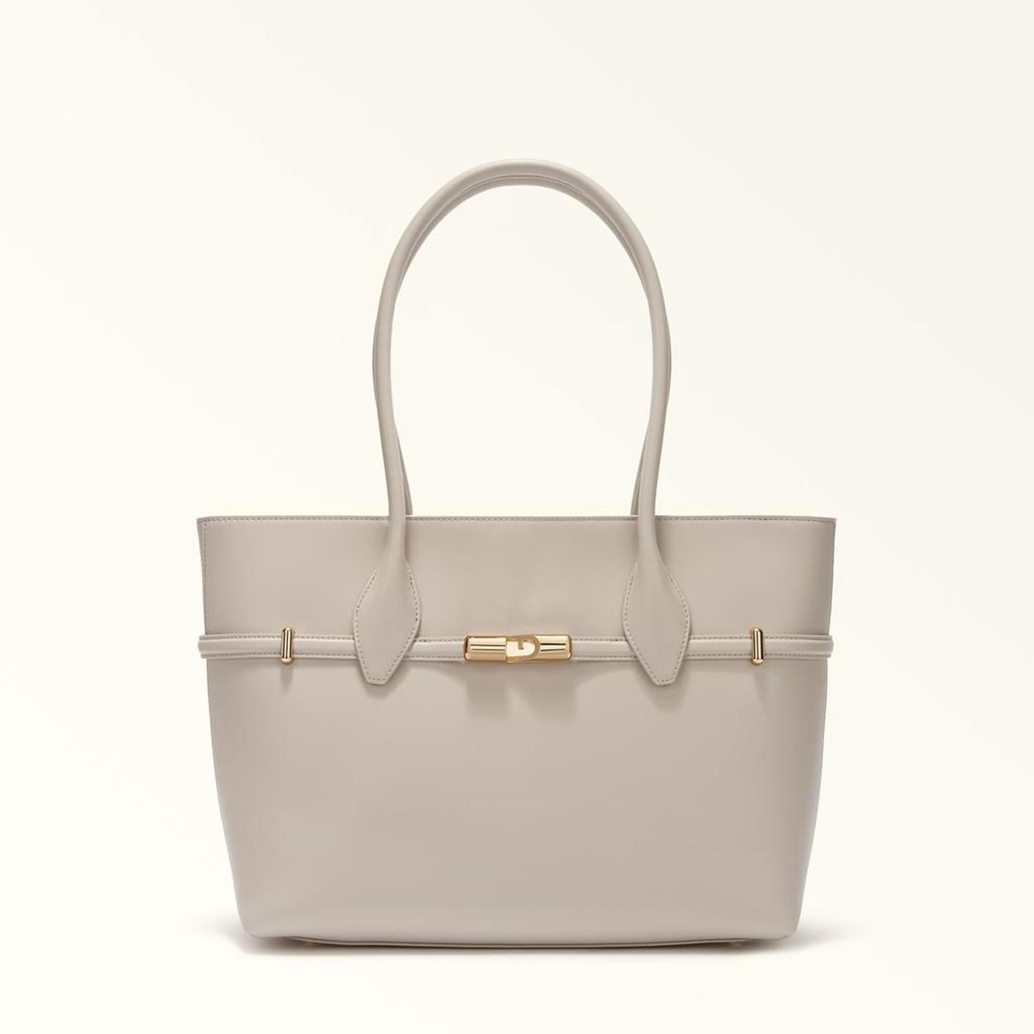 • Sleek, structured and super-spacious, this large Furla Goccia tote comes in smooth leather for a clean and simple look. The elegant and contemporary piece is perfect for everyday use, being versatile and well-organised inside, and is embellished with straps adorned with the new Furla Arch logo magnetic hardware.