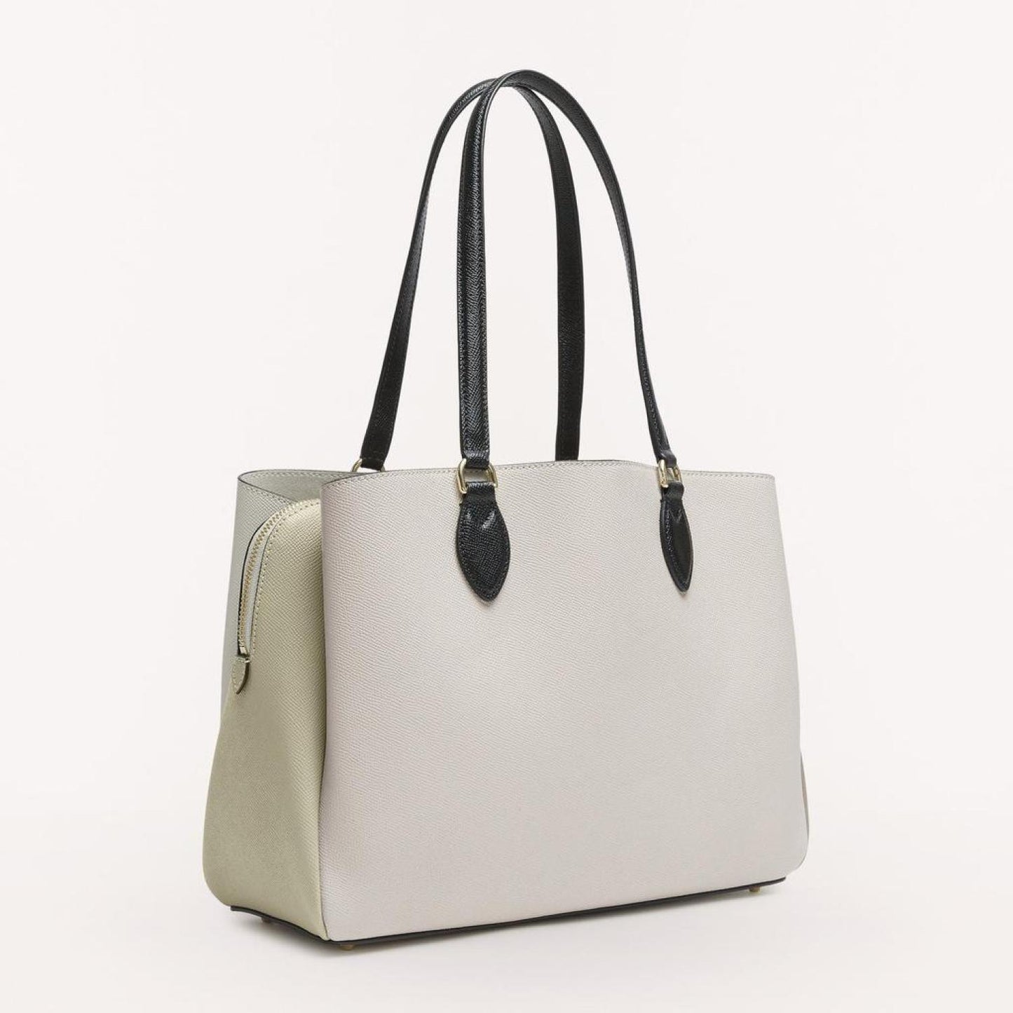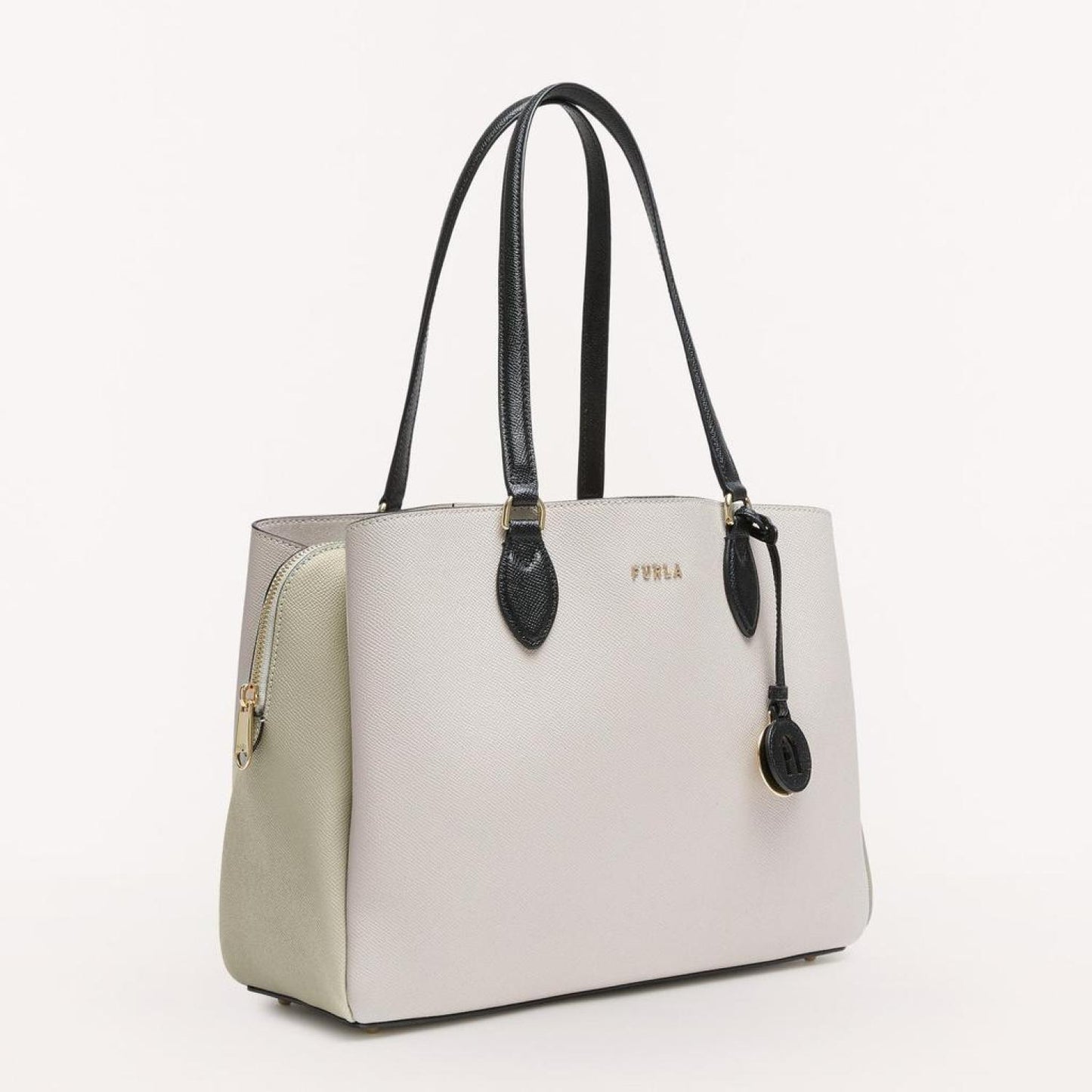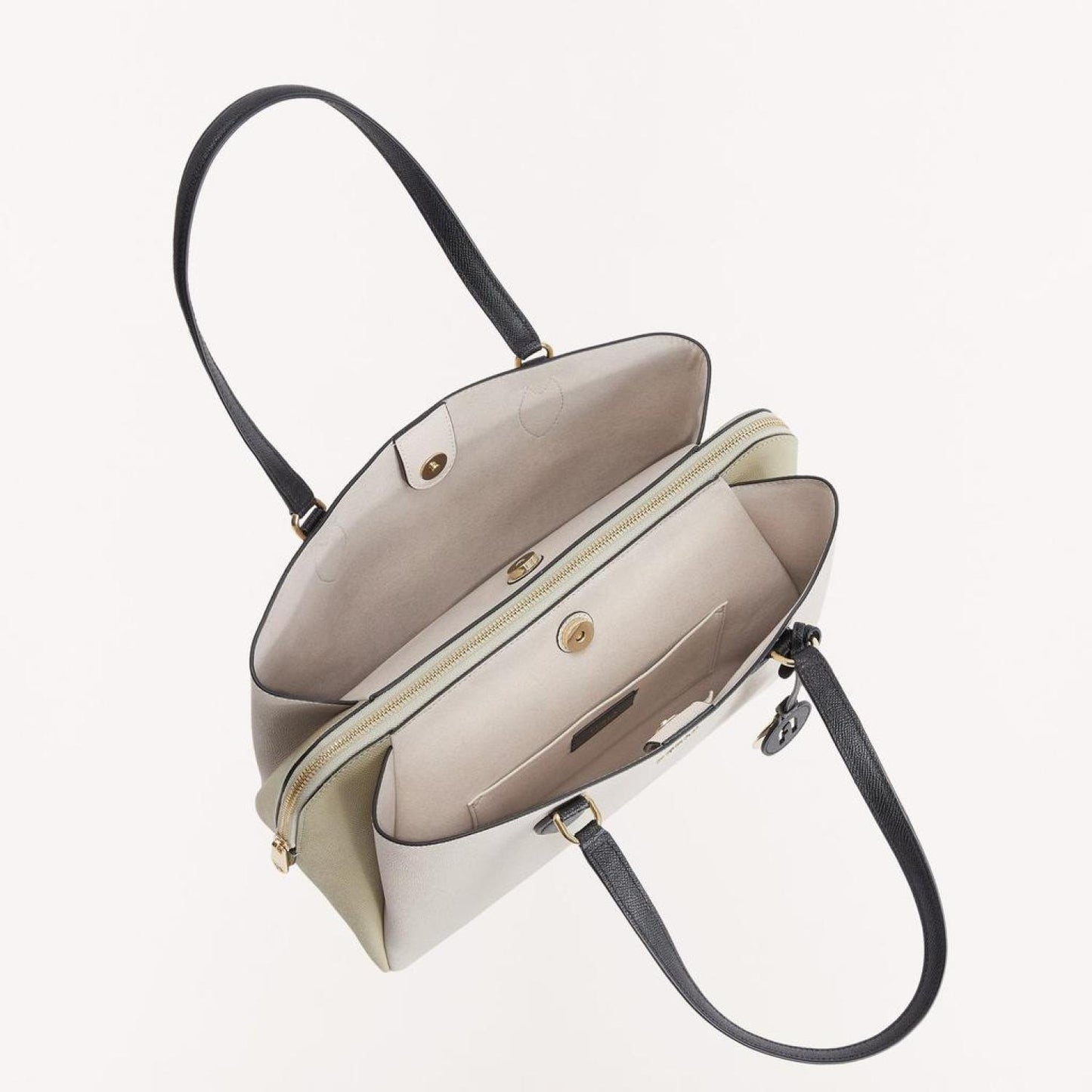 Furla Minerva is a large shopping bag made of colour-block Andromeda calfskin. The inside is divided into two large side compartments with magnetic closures and a zipped central partition, allowing you to neatly organise and store your personal belongings. The model is completed with a charm and Arch logo badge in galvanised metal around the handle. - Leather double handle- Inside zipped pocket- Open inside pocket- Zip closure- Furla lettering logo punched on the front- Galvanised light gold finishes- Dimensions - 13.39 x 9.84 x 5.12