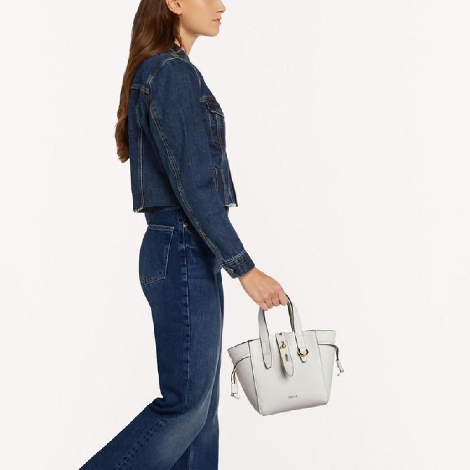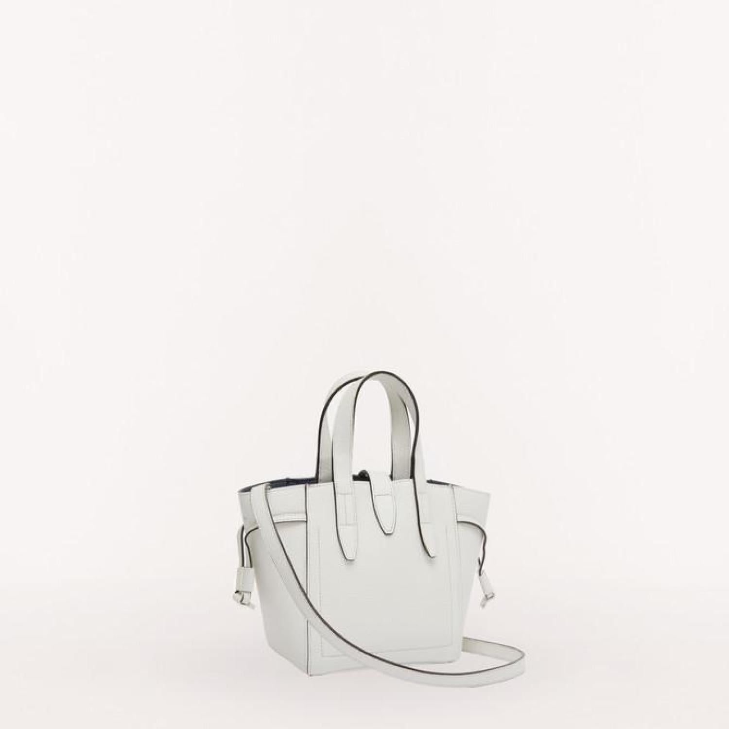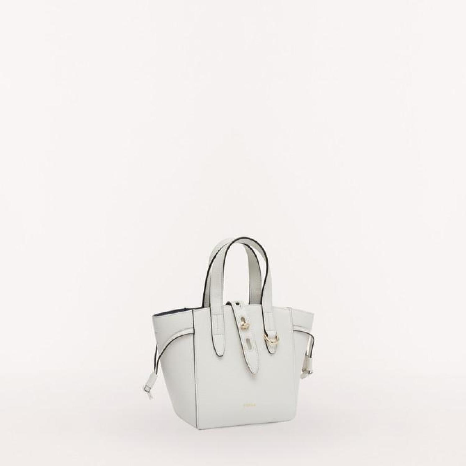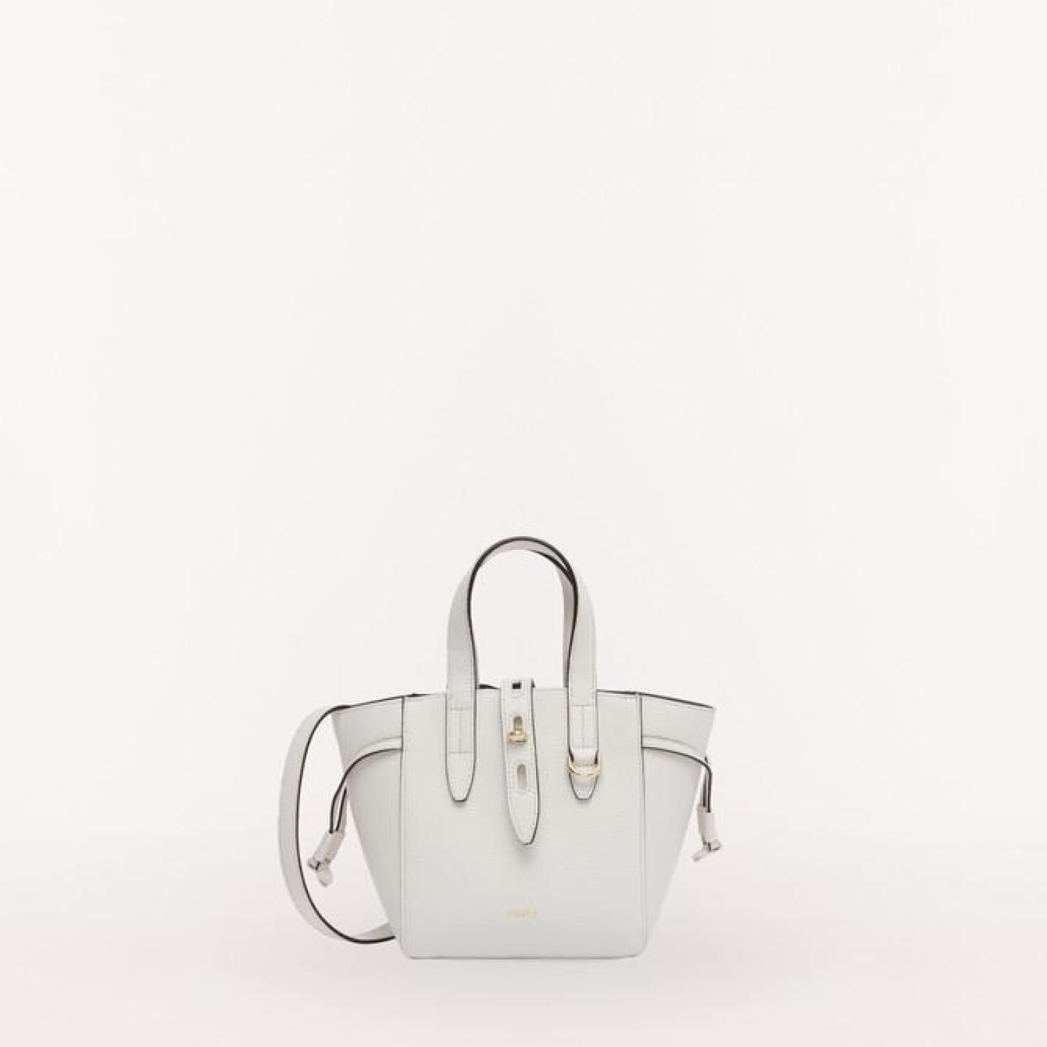 Furla Net is a handbag made of grained calfskin with a contrasting inner lining. The body of the bag is adjustable using the drawstring ties on the sides. The metal twist closure with oval hole details on the leather tab adds a unique touch to the bag. - One inside pocket - Adjustable and removable strap - Furla logo punched on the front - Galvanised gold finishes Dimensions 6.69 x 7.48 x 4.33 (w x h x d) material Grained Calf Leather composition 100% Leather Height 7.48 in product code BASRFUA_HSF000_9025_1704S