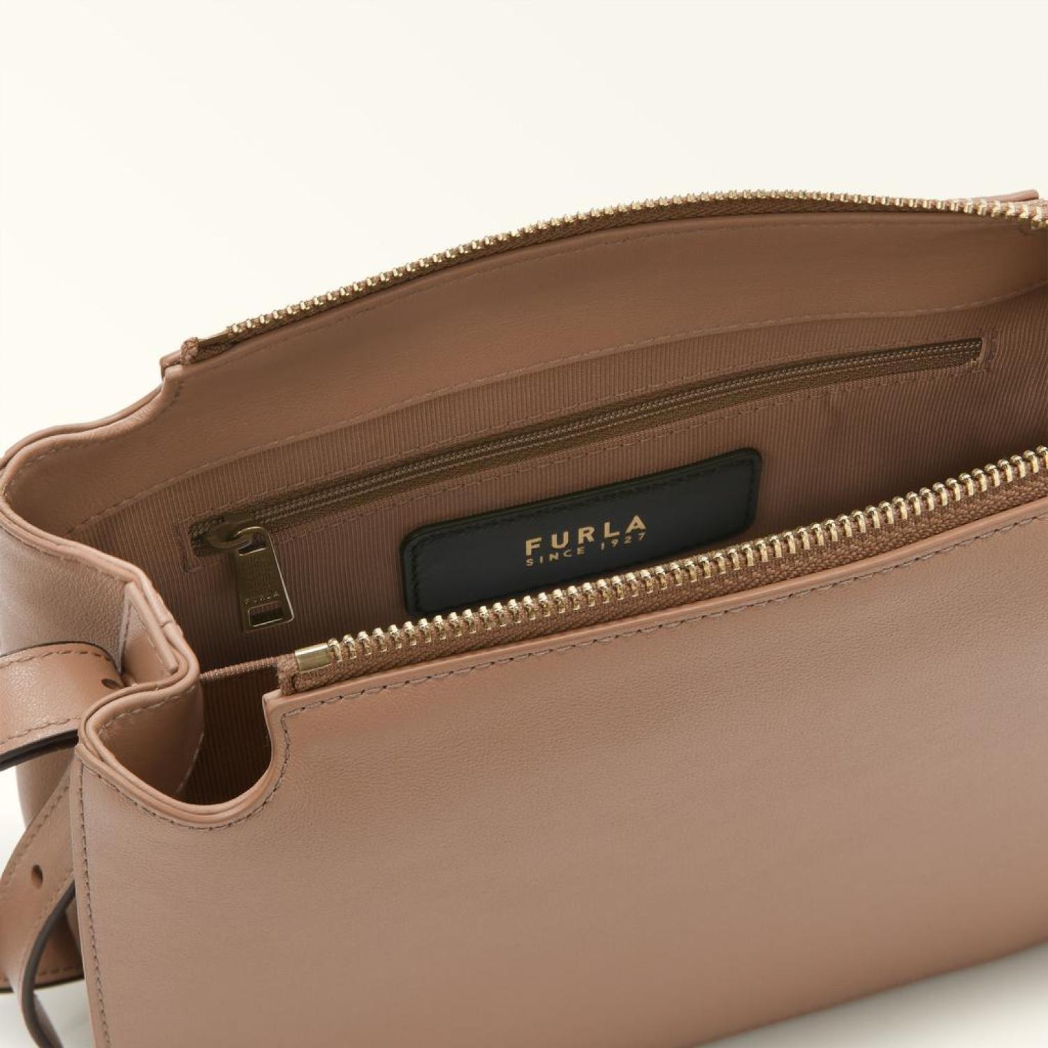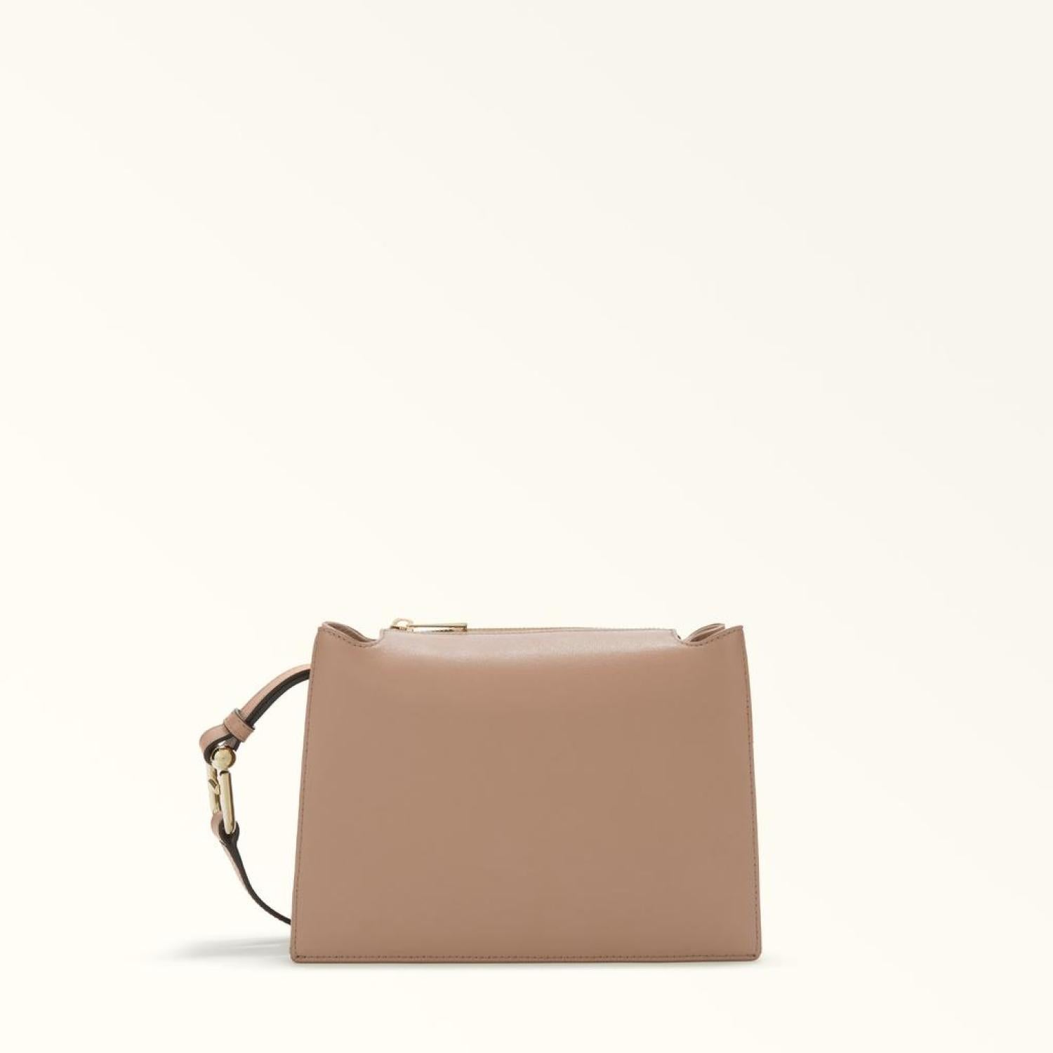 • A balance of square geometric lines and soft and delicate appeal is what makes this Furla Nuvola crossbody distinctive. Styled in luxurious leather with a grained finish, it is embellished with the new interpretation of Arcosfera hardware, which brings the iconic Furla Arch logo together with the original round element of the brand, adding an elegant touch. Inside, beyond the zip closure, it has two open compartments and a central partition, and it can be worn crossbody or on the shoulder with the adjustable and removable strap.