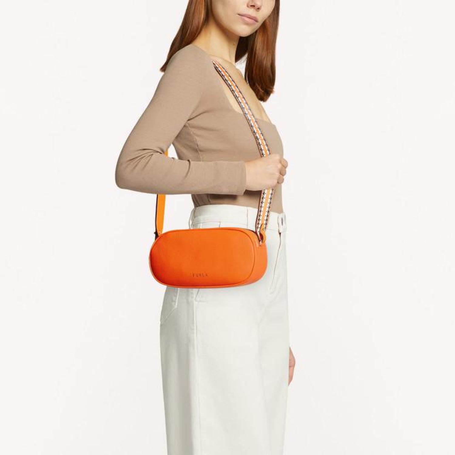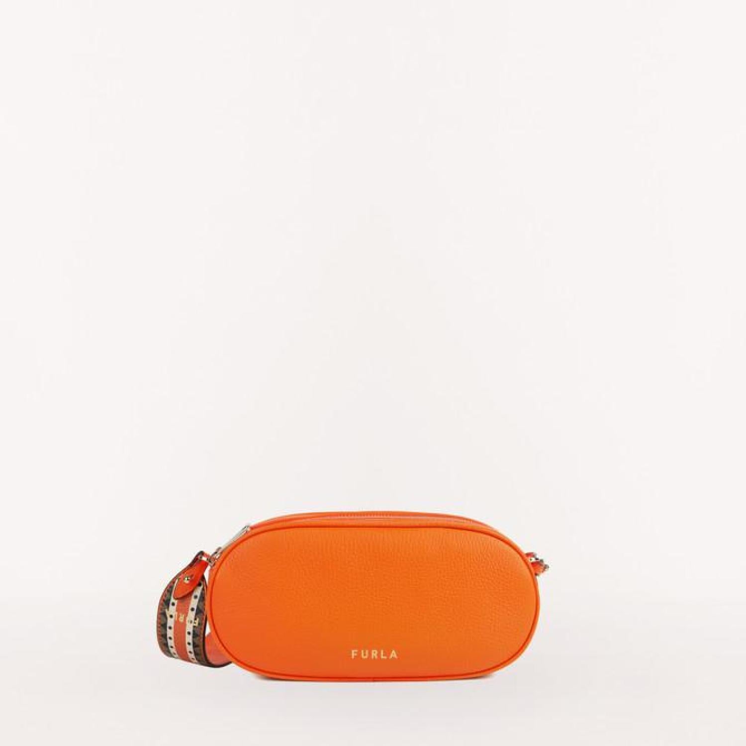 • Furla Real is a small crossbody bag made of grained calfskin. Featuring an oval shape and double zip closure, the bag is made unique by the distinctive removable leather strap with ethnic print. An ideal accessory for keeping your personal items always with you.