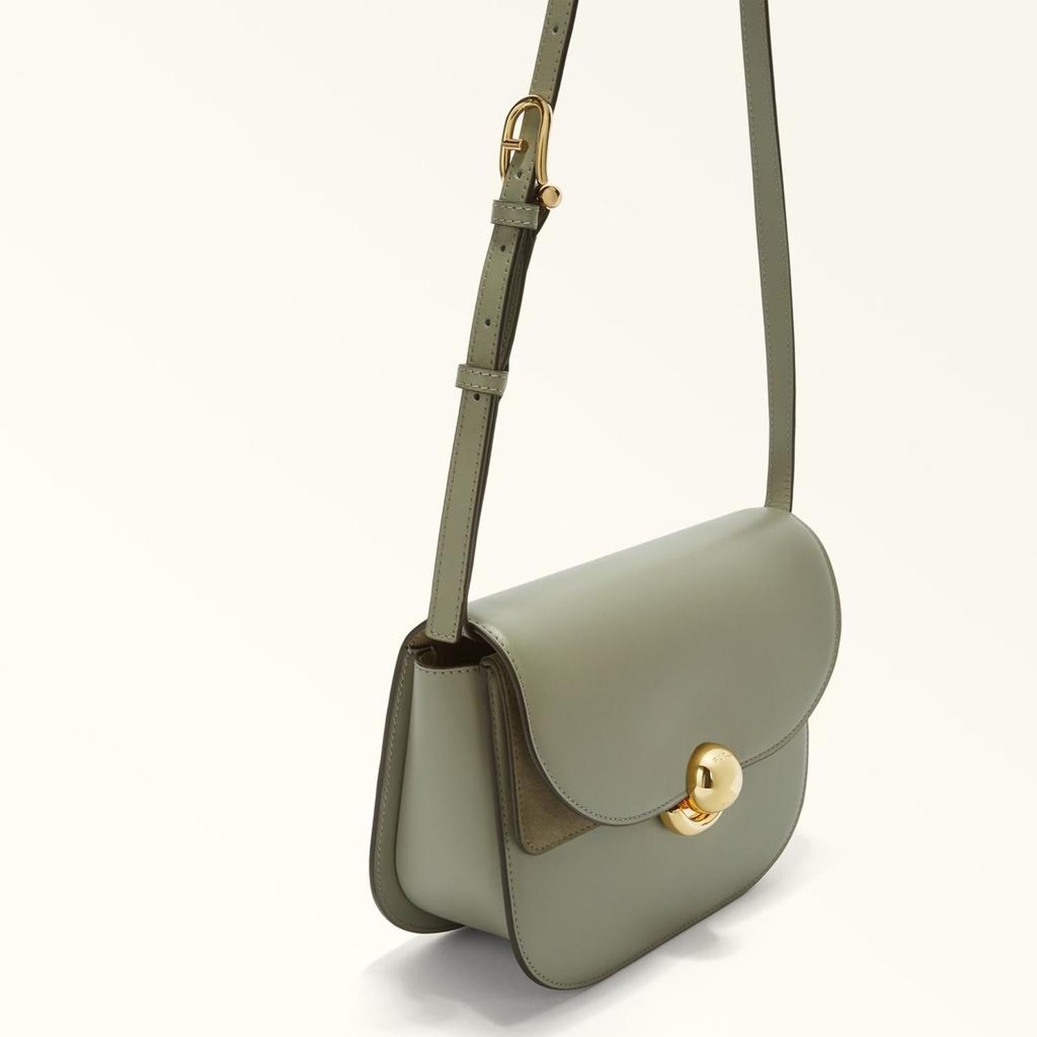 The sleek lines and saddle silhouette of this bag make it elegant and distinctive. The small Furla Sfera piece has a matching adjustable shoulder strap and can be comfortably worn crossbody or on the shoulder. Styled in luxurious smooth leather, it is finished with soft suede details on the inner flap, and the clean and simple new round Sfera closure, the iconic signature of the Furla brand. - Open inside pocket - Inside zip pocket - Open inside pocket on front panel - Flap closure
