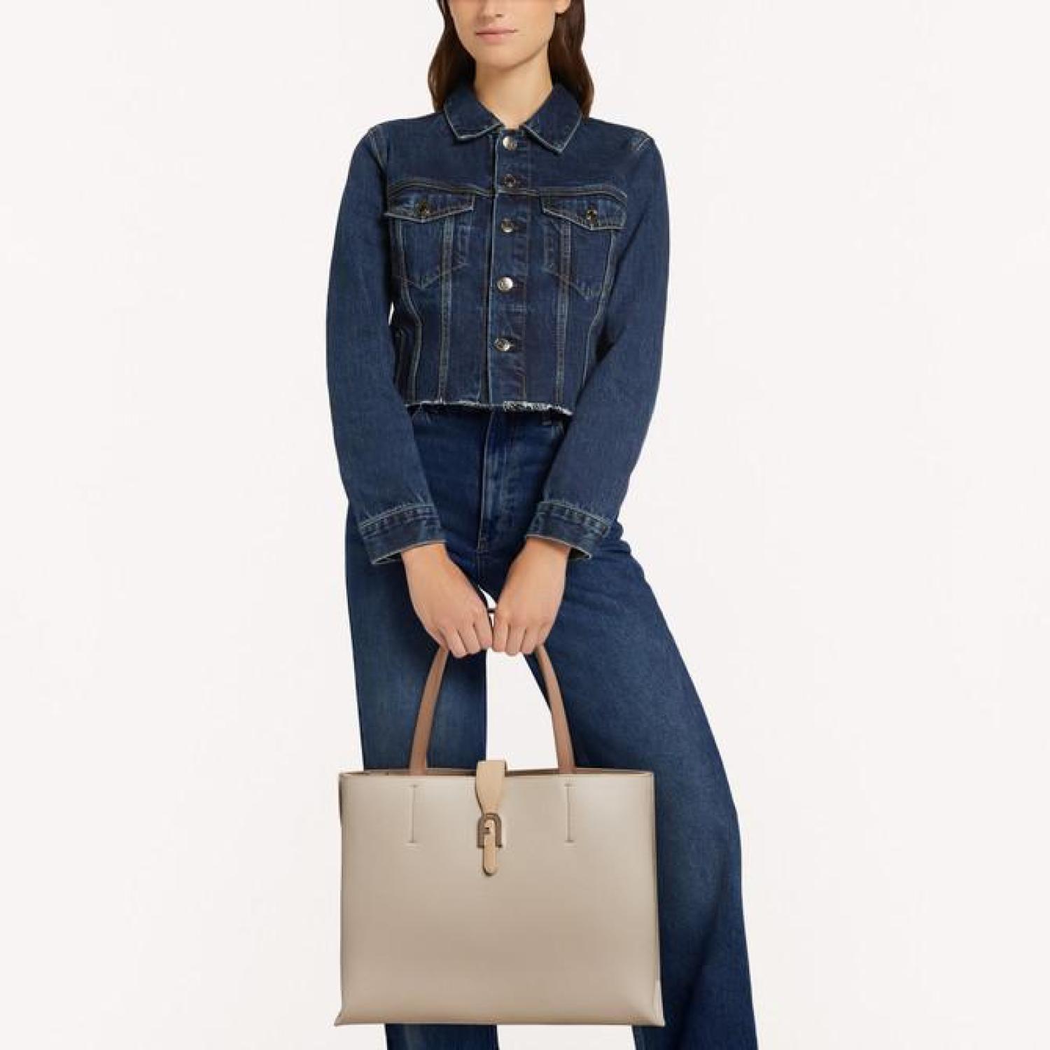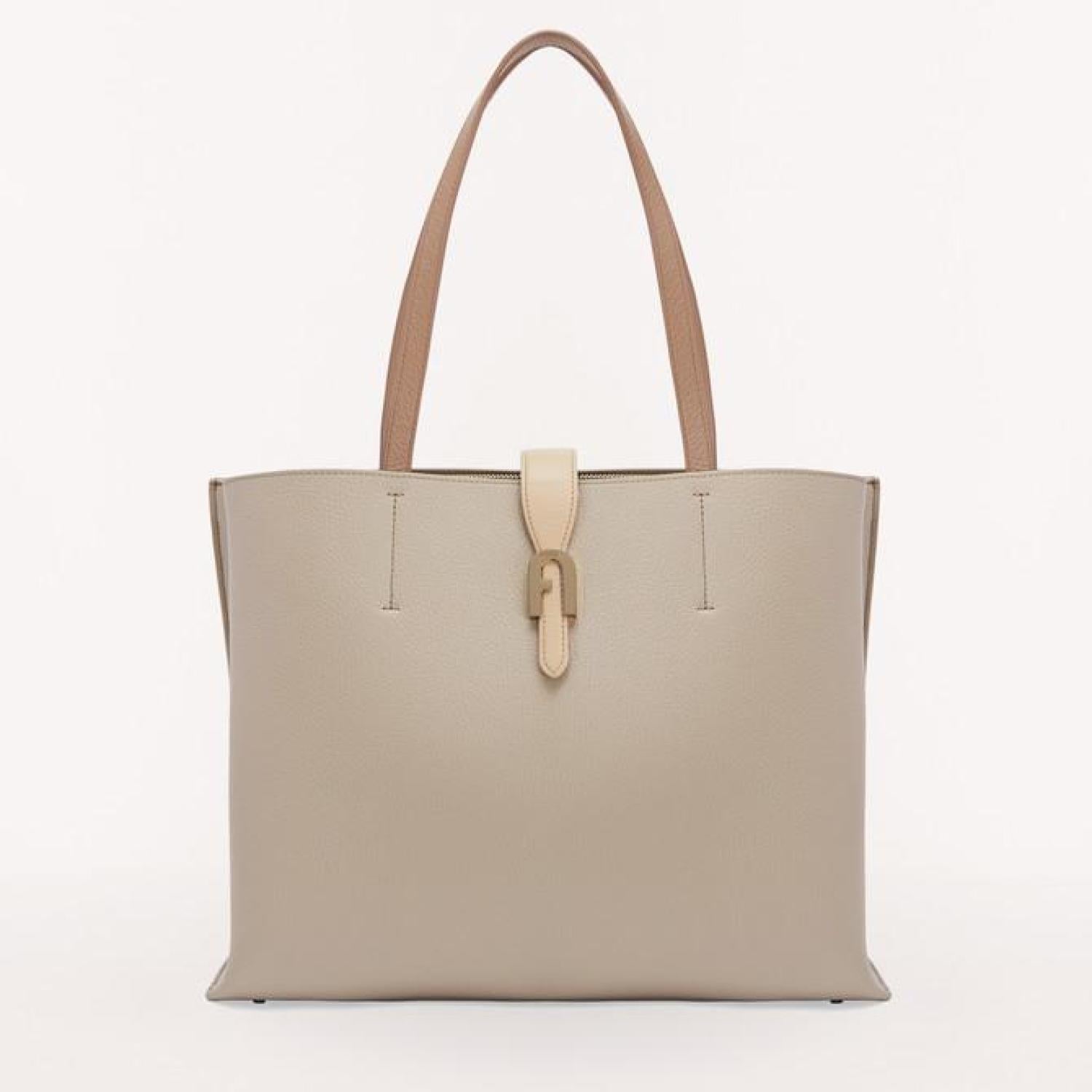 • Furla Sofia is a double-handle large shopping bag made of colour-block grained Eracle leather. The light and functional accessory is perfect for everyday use. The inner gusseted construction with a central zipped pocket and two capacious open side compartments allow you to perfectly organise your personal belongings.