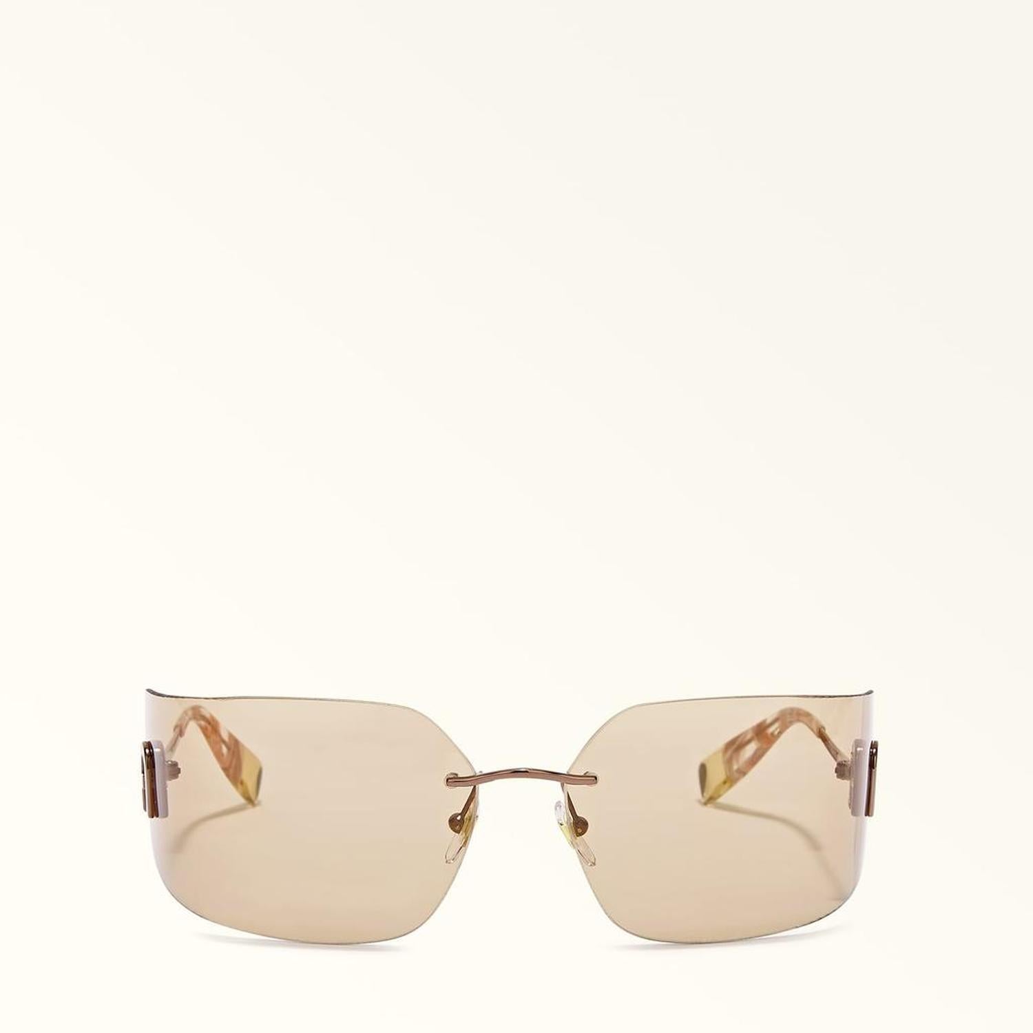 The SFU843 Furla Sunglasses feature a rectangular shape with elegant, contemporary charm. Their slim metal frames are extremely lightweight and end in temple tips made from the same acetate as the Arch logo on the outer lens edges.