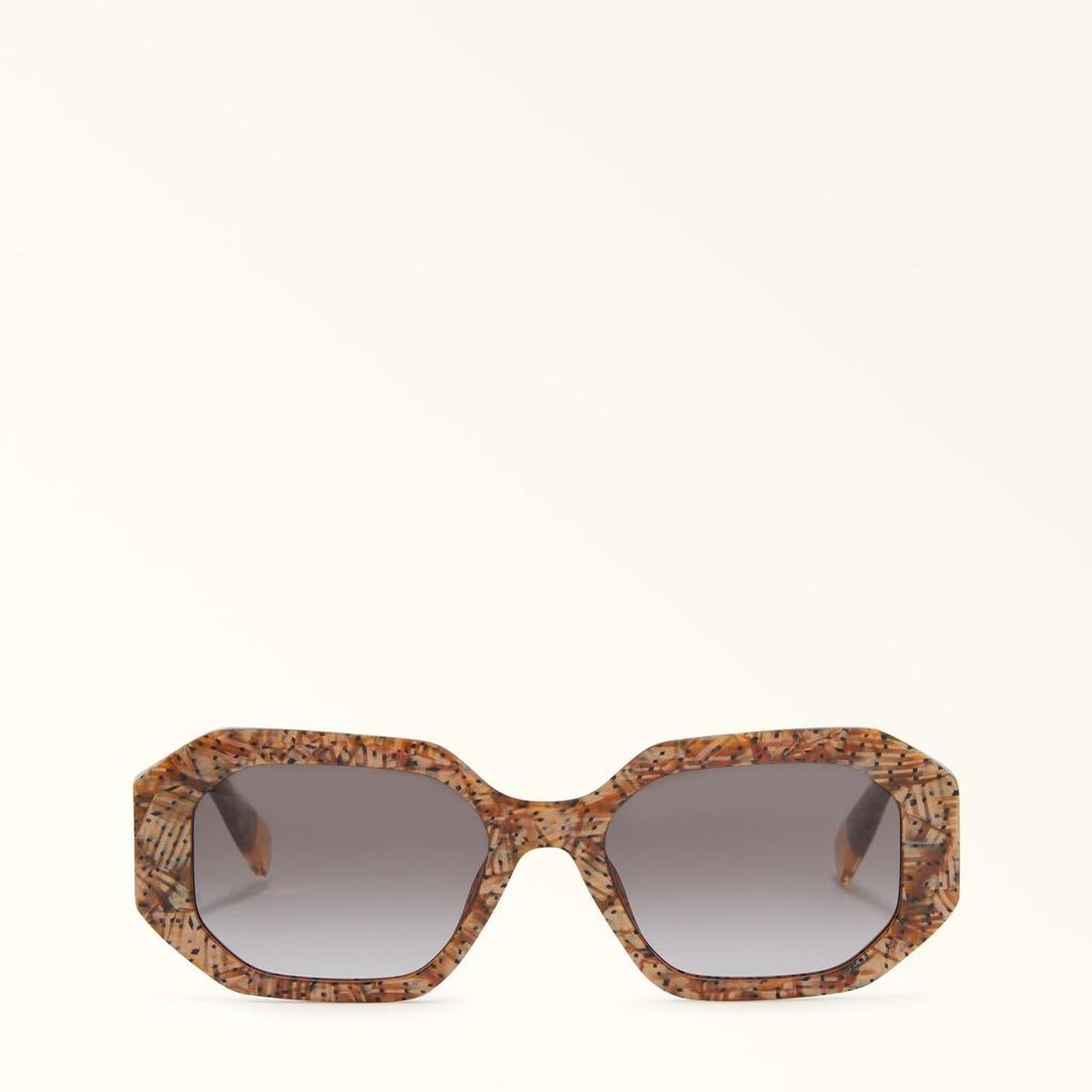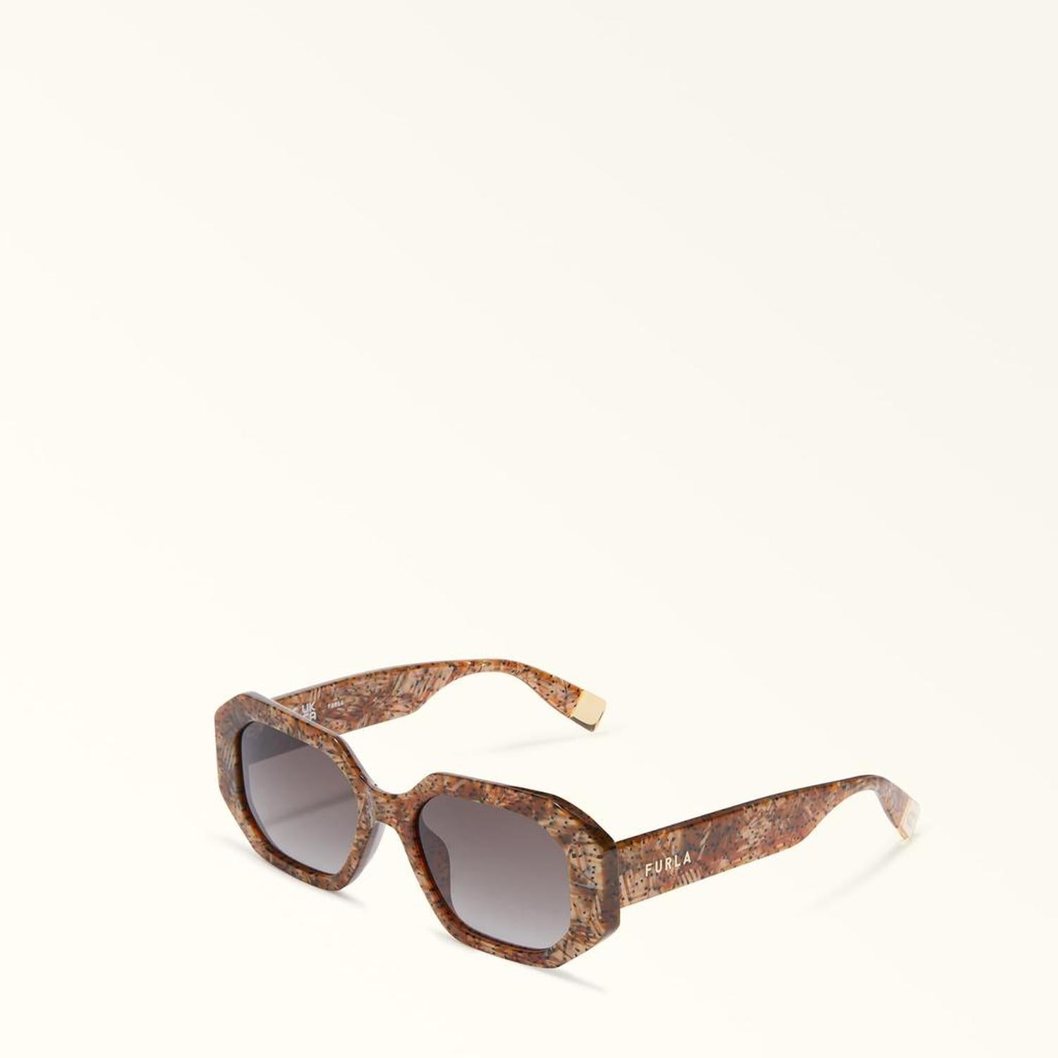 • These sophisticated SFU815 Furla Sunglasses stand out for their geometric shape with a contemporary design. The frame with large bold temples is entirely made of premium acetate and is decorated with a shell design created exclusively for Furla Eyewear by Italian manufacturer Mazzucchelli. Embellished with the brand's signature engraved on the side and shiny metal temple tips.
