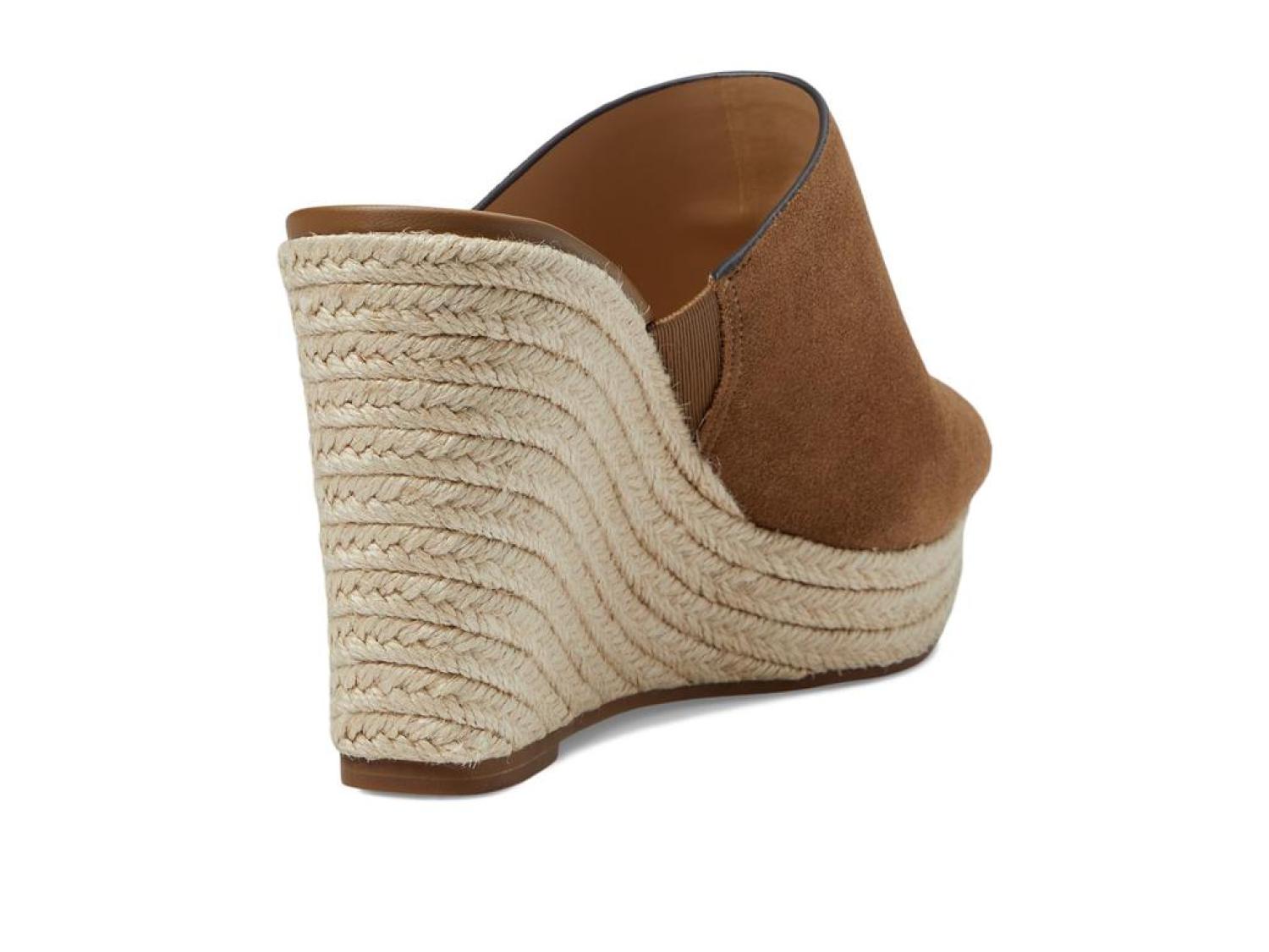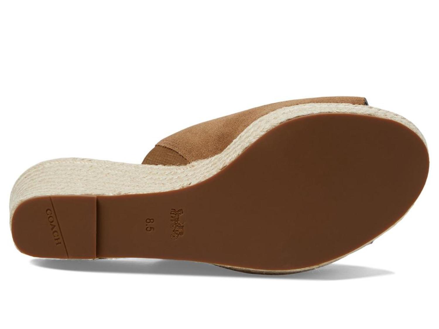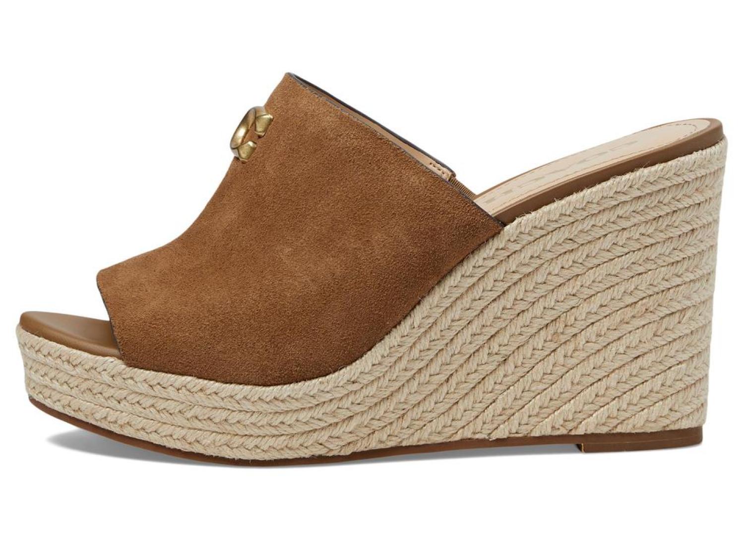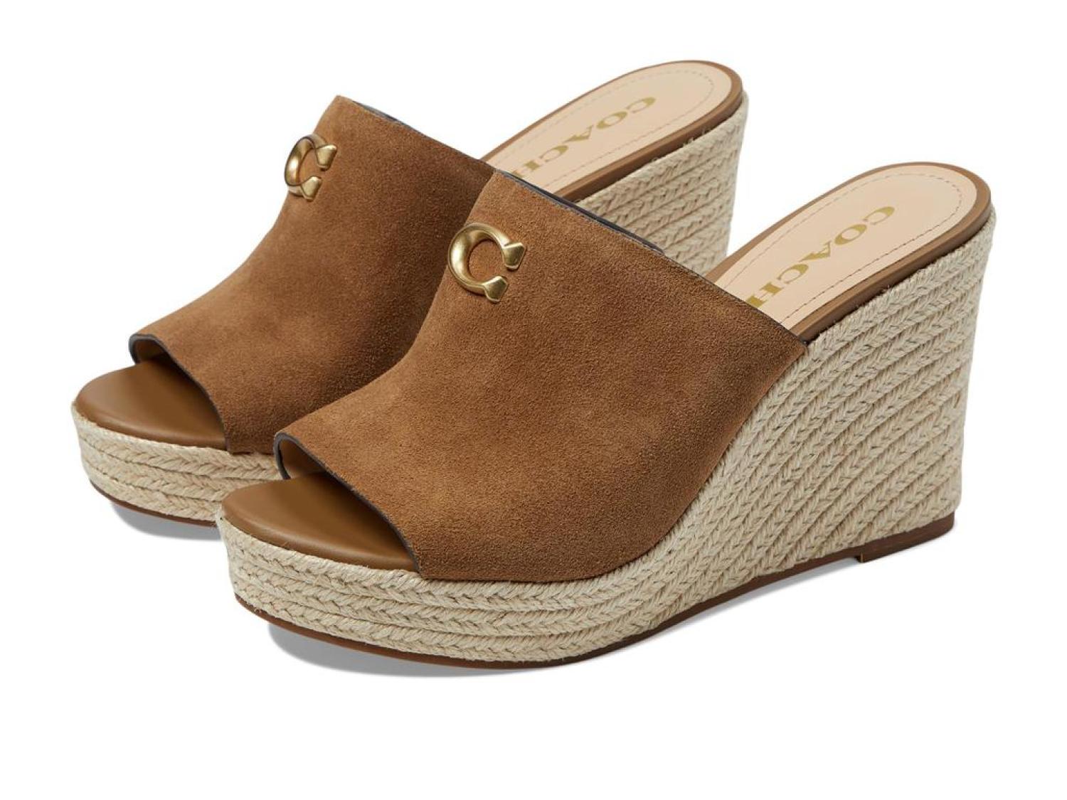 Elevate your chic wardrobe styling for the warm weather months in the COACH® Gloria Suede Wedge. These slip-on shoes feature a peep toe silhouette, a suede upper with branding hardware, man-made leather lining and insole, and a jute wrapped wedge heel.