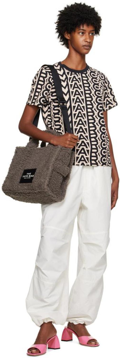 Sherpa fleece tote in gray. Logo patch at face.