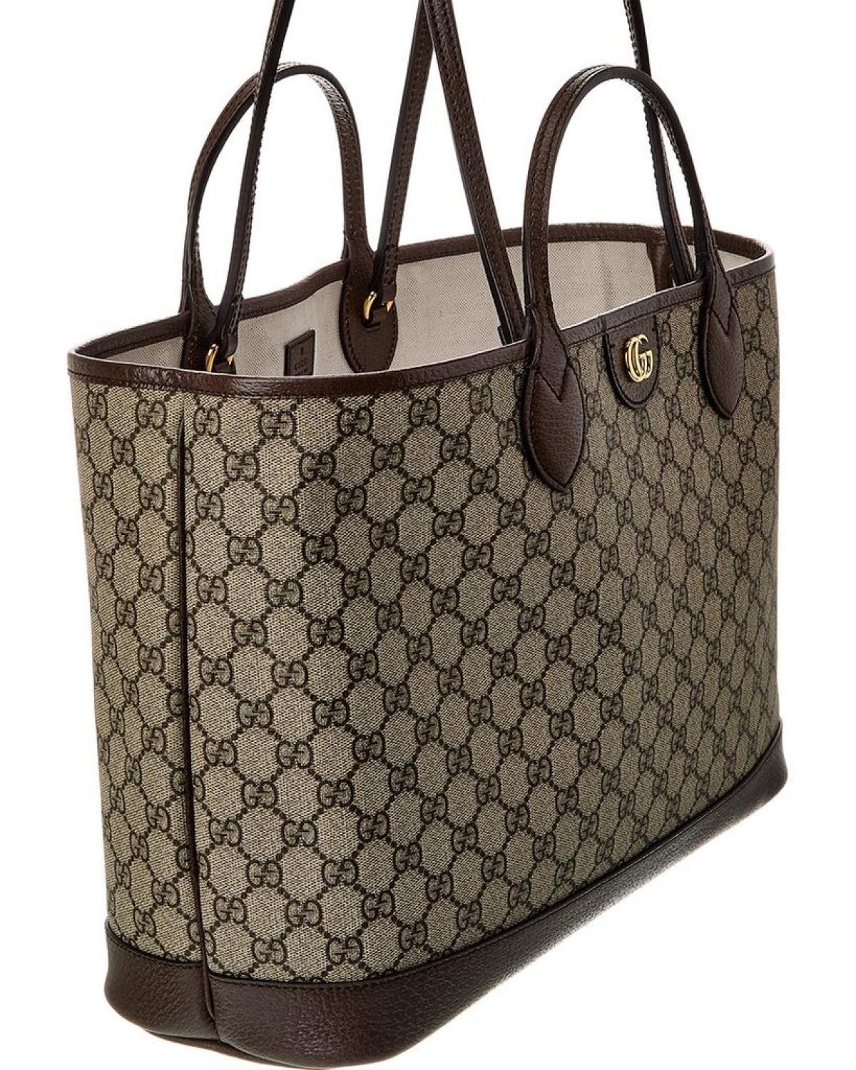 Introducing the Gucci Ophidia Medium GG Supreme Canvas & Leather Tote. This exquisite handbag embodies the essence of Italian luxury and showcases the eclectic style that Gucci is renowned for. Crafted in Italy with meticulous attention to detail, this tote features GG Supreme canvas and brown leather, complemented by light fine gold hardware and the iconic interlocking G logo accent. The interior of this tote is lined with high-quality canvas, adding a touch of luxury to every aspect of this piece. With dimensions measuring 15 inches wide, 11.2 inches high, and 6 inches deep, it offers ample space to carry your essentials. The top handles have a drop of 5 inches, allowing for easy handheld use, while the shoulder straps have a drop of 11 inches for comfortable and convenient crossbody wear.Designed with an open top, this tote provides effortless access to your belongings while exuding sophisticated style. Please note that all measurements were taken by hand and are approximate; slight variations may occur. Rest assured, all of our products, including this Gucci tote, are 100% genuine. While in some cases we source merchandise from trusted independent suppliers, we guarantee the authenticity of every product sold on our site. Elevate your wardrobe and redefine Italian luxury with this Gucci Ophidia Medium GG Supreme Canvas & Leather Tote - a timeless piece that will make a statement wherever you go.