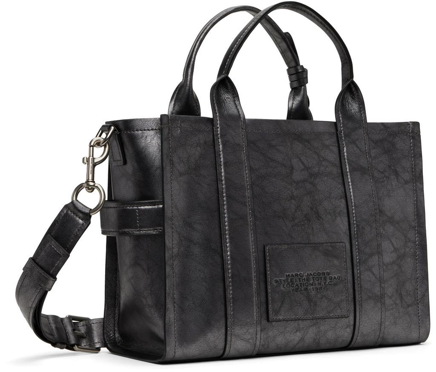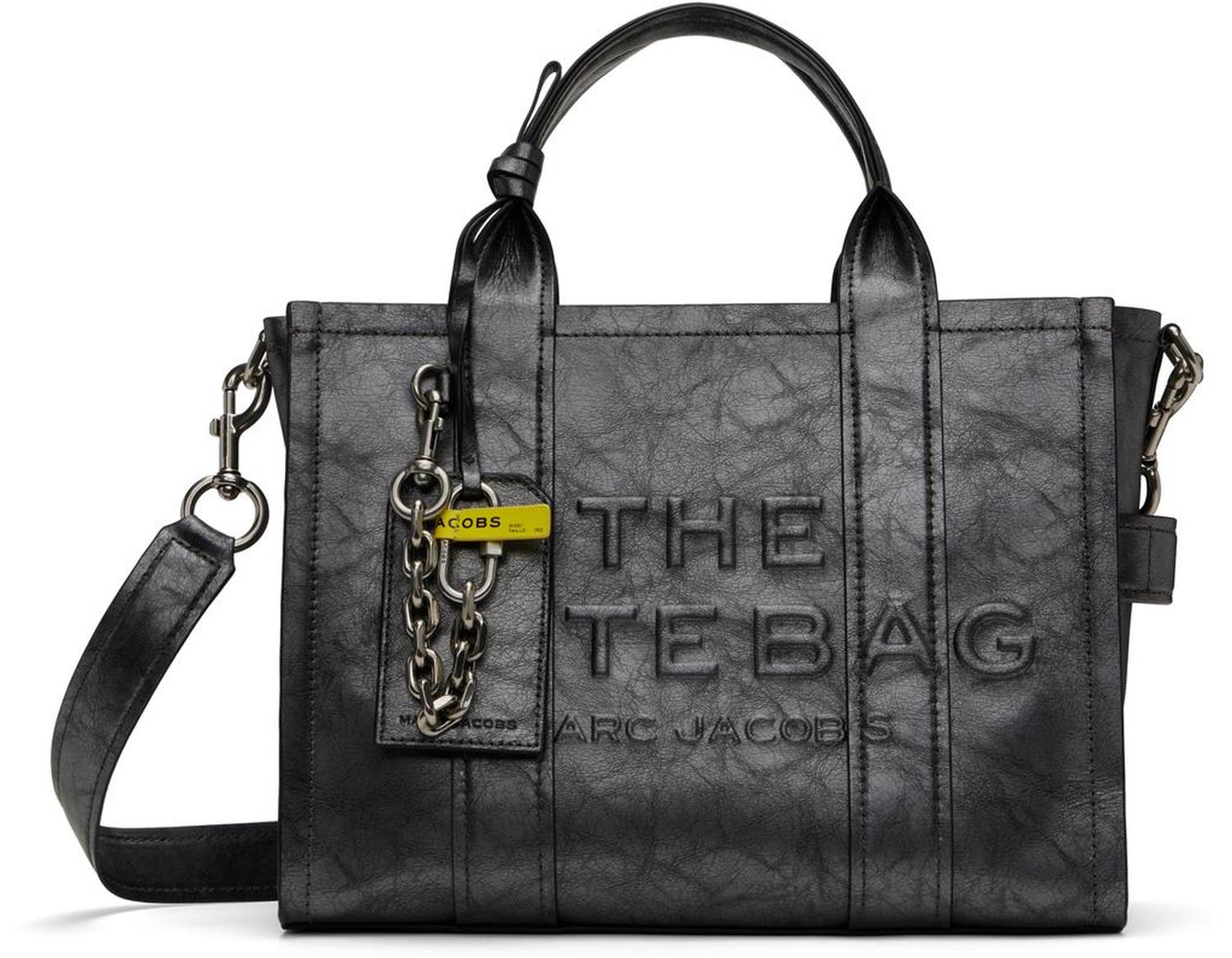 Cracked leather tote in gunmetal tone.