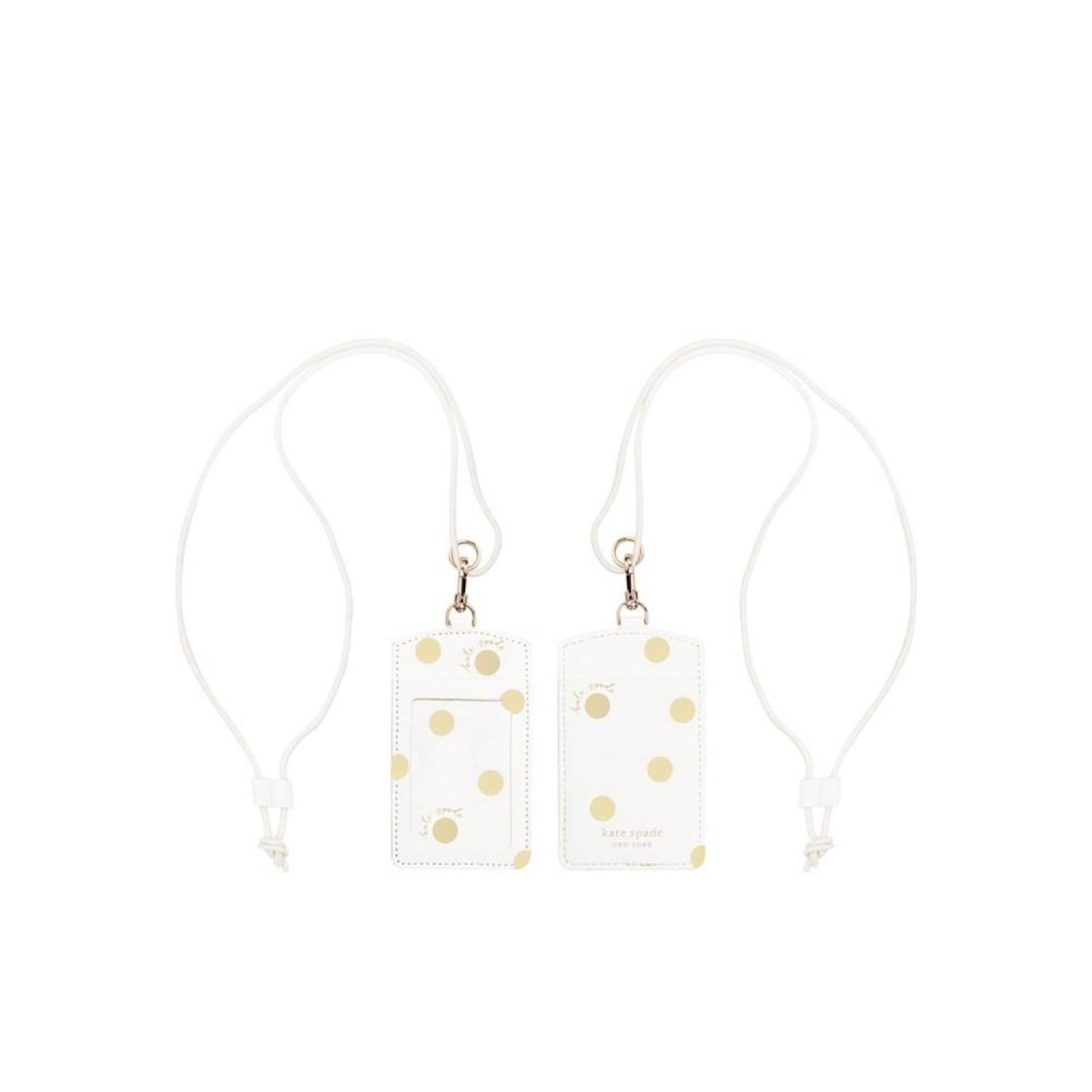 • Phone check. Keys check. Wallet check. ID check. This elegant polka holder by Kate Spade New York has you covered on the latter. It comes with a lanyard, too, so you can wear it around your neck like a necklace to keep your card close. This Kate Spade product is made with a customer in mind who is busy and on-the-go but also very stylish and fashion-forward. There is no reason to compromise functionality or fashion with this product! This beautiful print will also make sure you do not lose sight of your ID, as it is so beautiful it will be hard to take your eyes off of it! Kate Spade products are the perfect way to add a little bit of color and flare to even the smallest aspects of your life. Increase the brightness of your world, as well as all the people you pass on the street with their products today!
