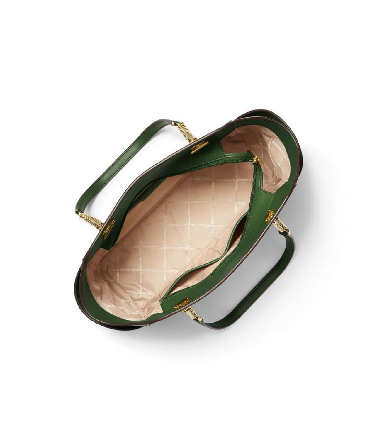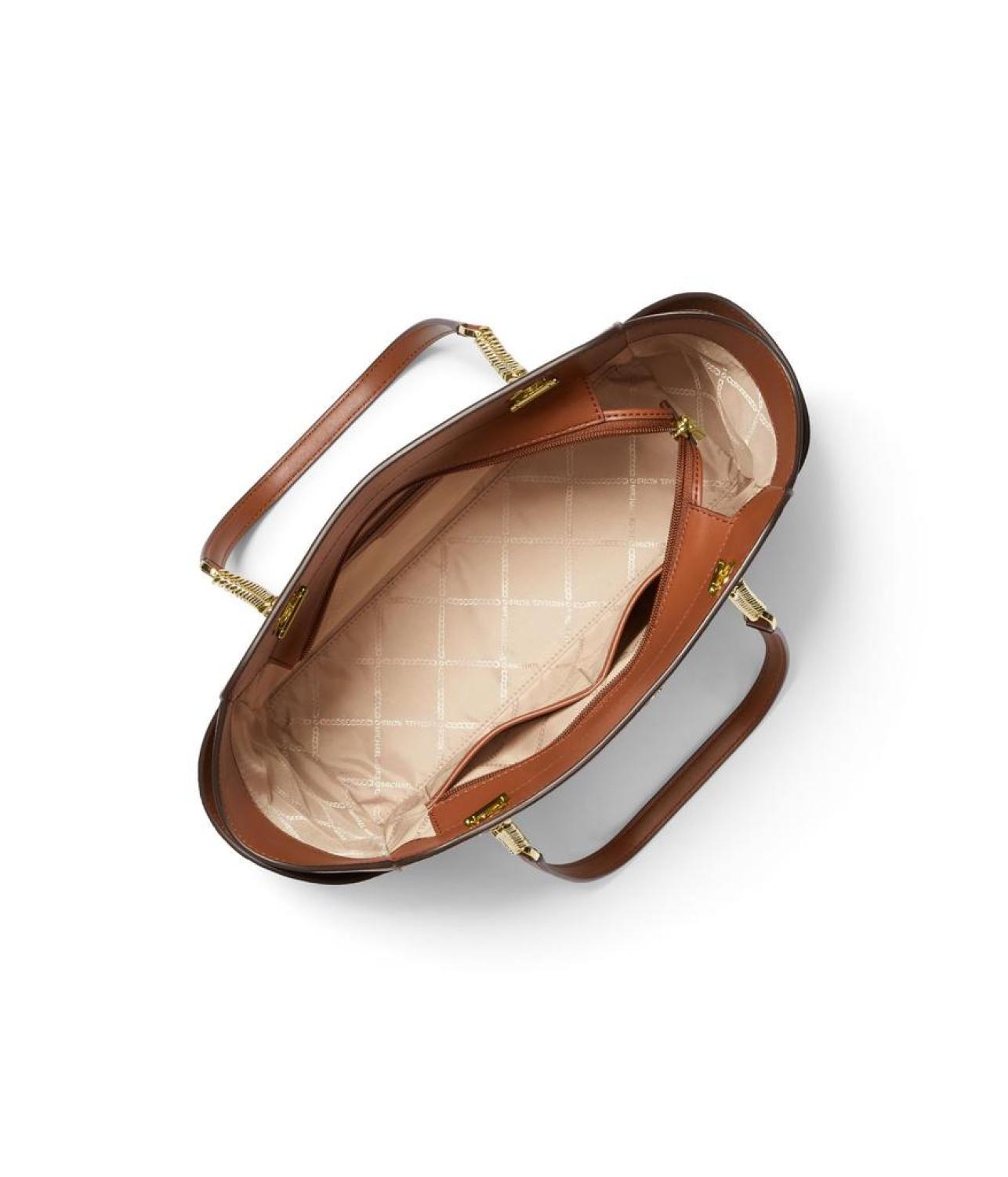 • Bring on eclectic charm to your style donning the MICHAEL Michael Kors® Jacquelyn Medium Top Zip Chain Tote. The bag has a pebbled leather construction and dual chain-linked straps. The tote has a zippered top closure that allows safe storage of your everyday essentials. It is also adorned with a brand logo charm and goldtone hardware on the front.