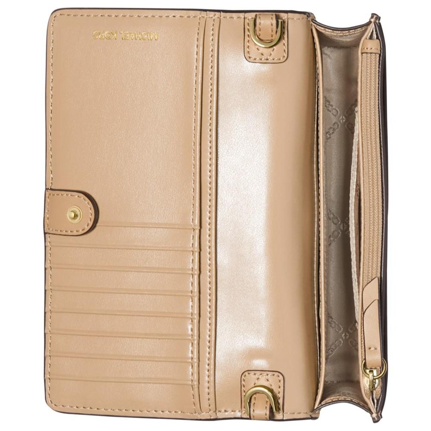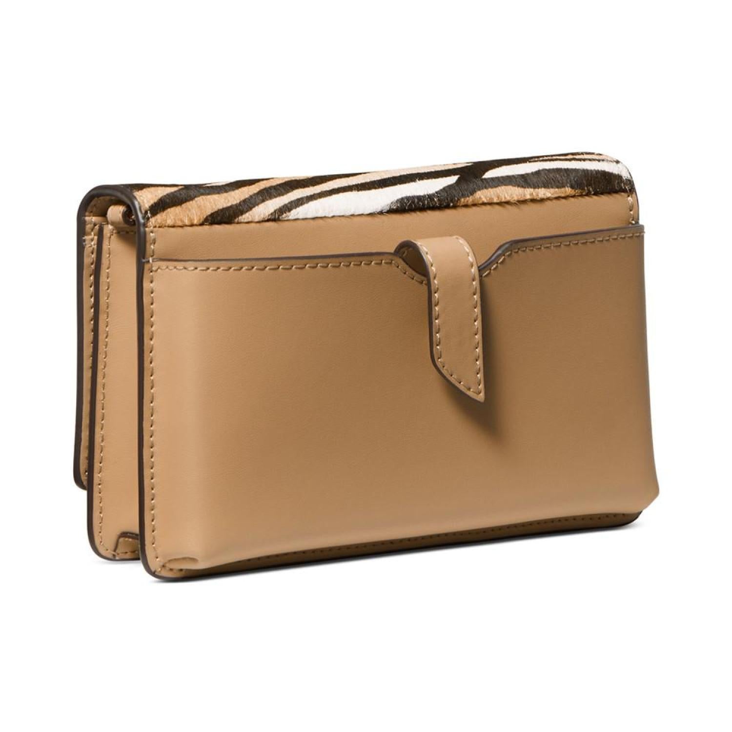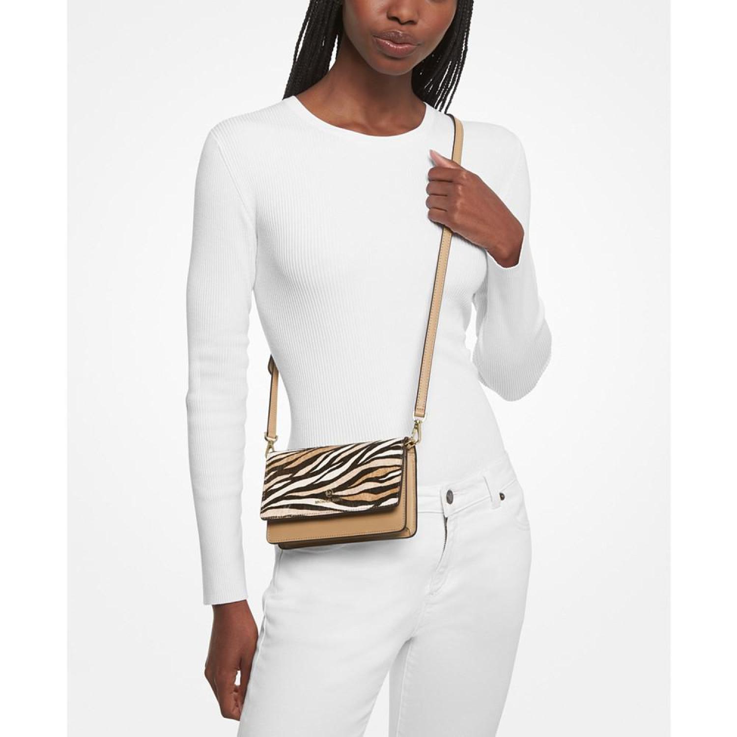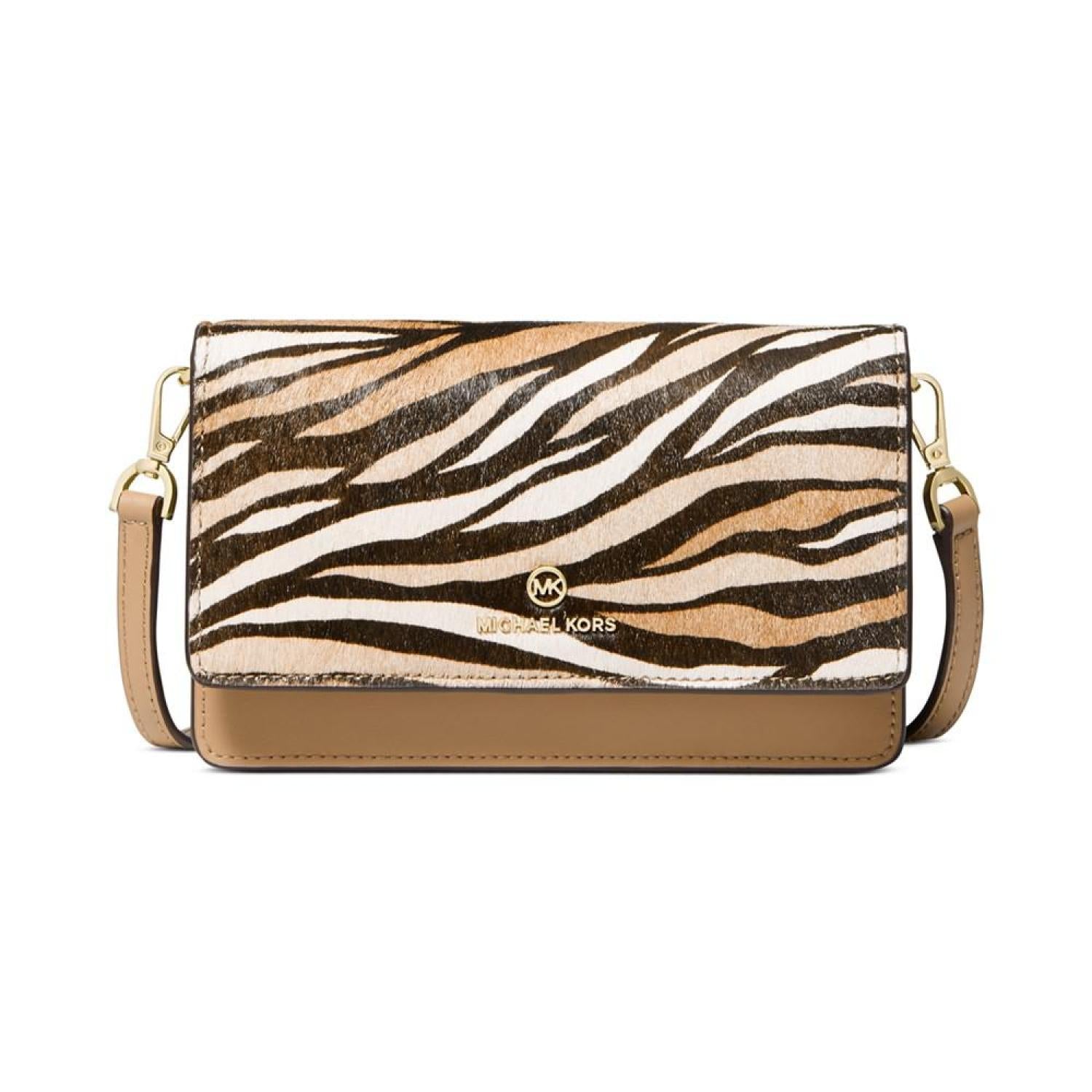 Chic and bold, this phone crossbody by MICHAEL Michael Kors is perfect for just the essentials. Dyed, whole calf hair, country of origin: USA Small sized bag; 7"W x 4-3/4"H x 2-1/2"D (width is measured across the bottom of handbag); 0.44 lbs. approx. weight Silhouette is based off 5'9" model 20-1/2"L - 24-1/2"L adjustable strap Snap closure Gold-tone hardware & exterior back snap pocket 11 interior card slots, 3 slip pockets & 1 zip pocket Leather, X; lining: polyester Spot clean Imported