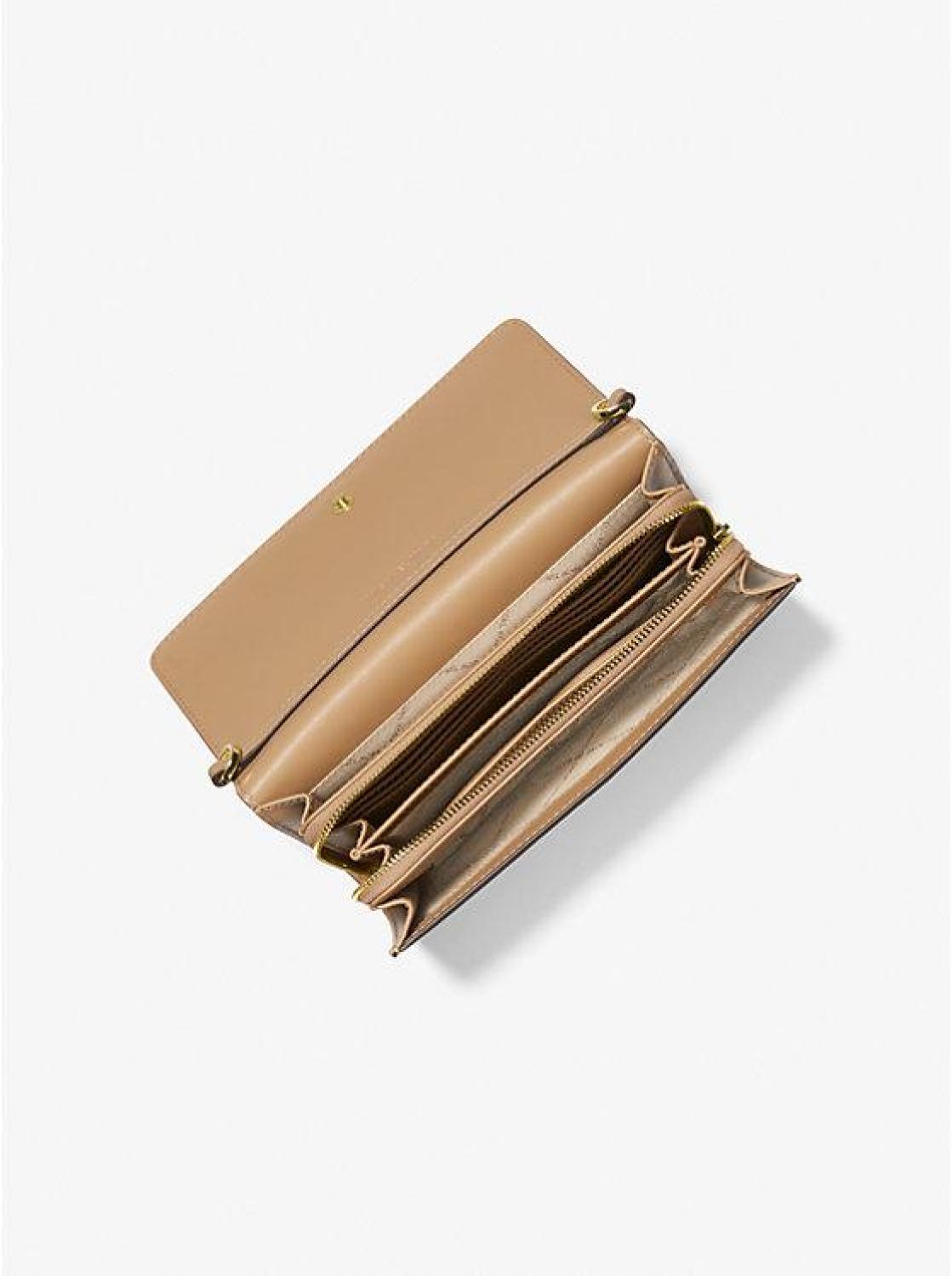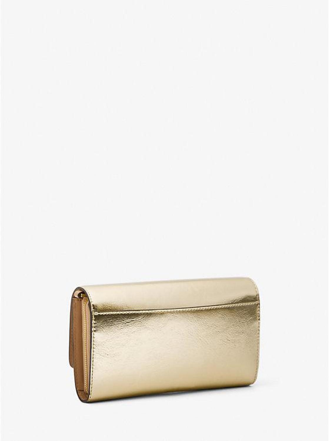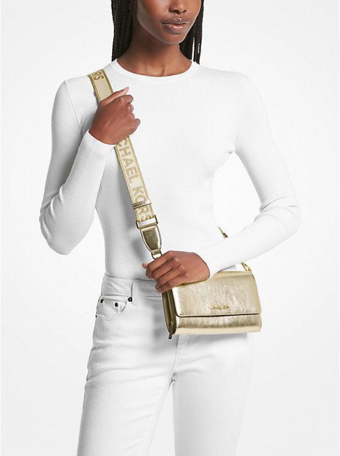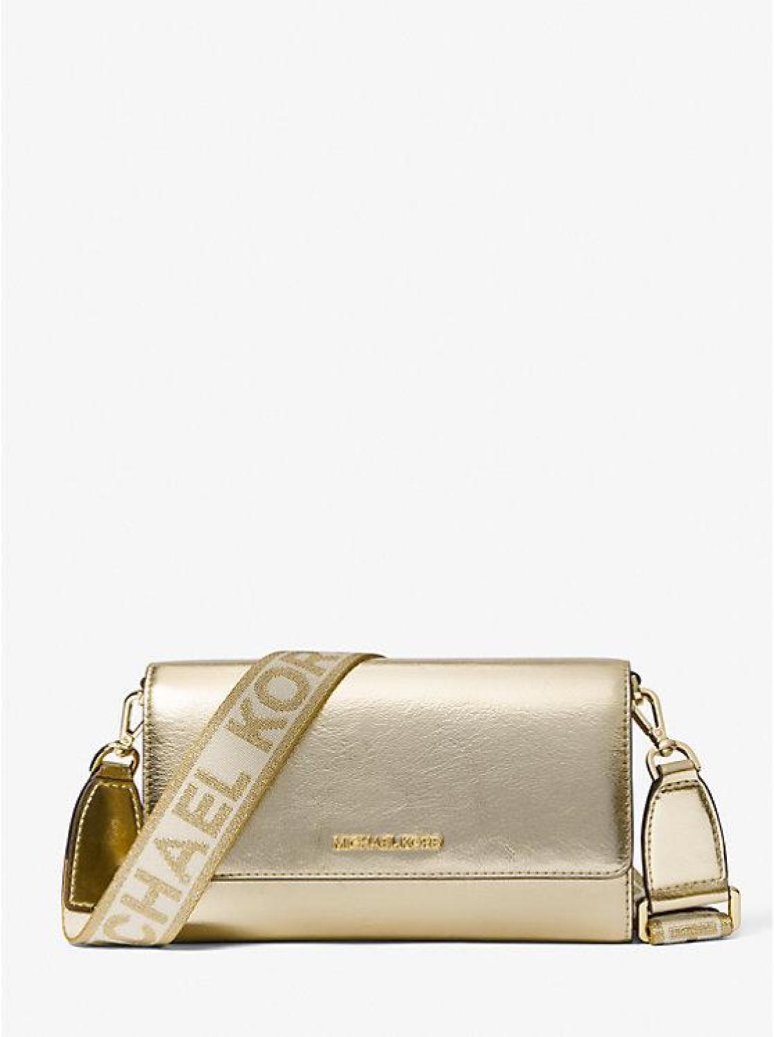 • Sporty chic meets modern minimalism on this Jet Set crossbody bag. It opens to reveal a zip compartment with plenty of slip pockets for organizing bills and cards, while the nylon logo strap allows you to convert the metallic silhouette into a clutch. Carry yours from day to night.