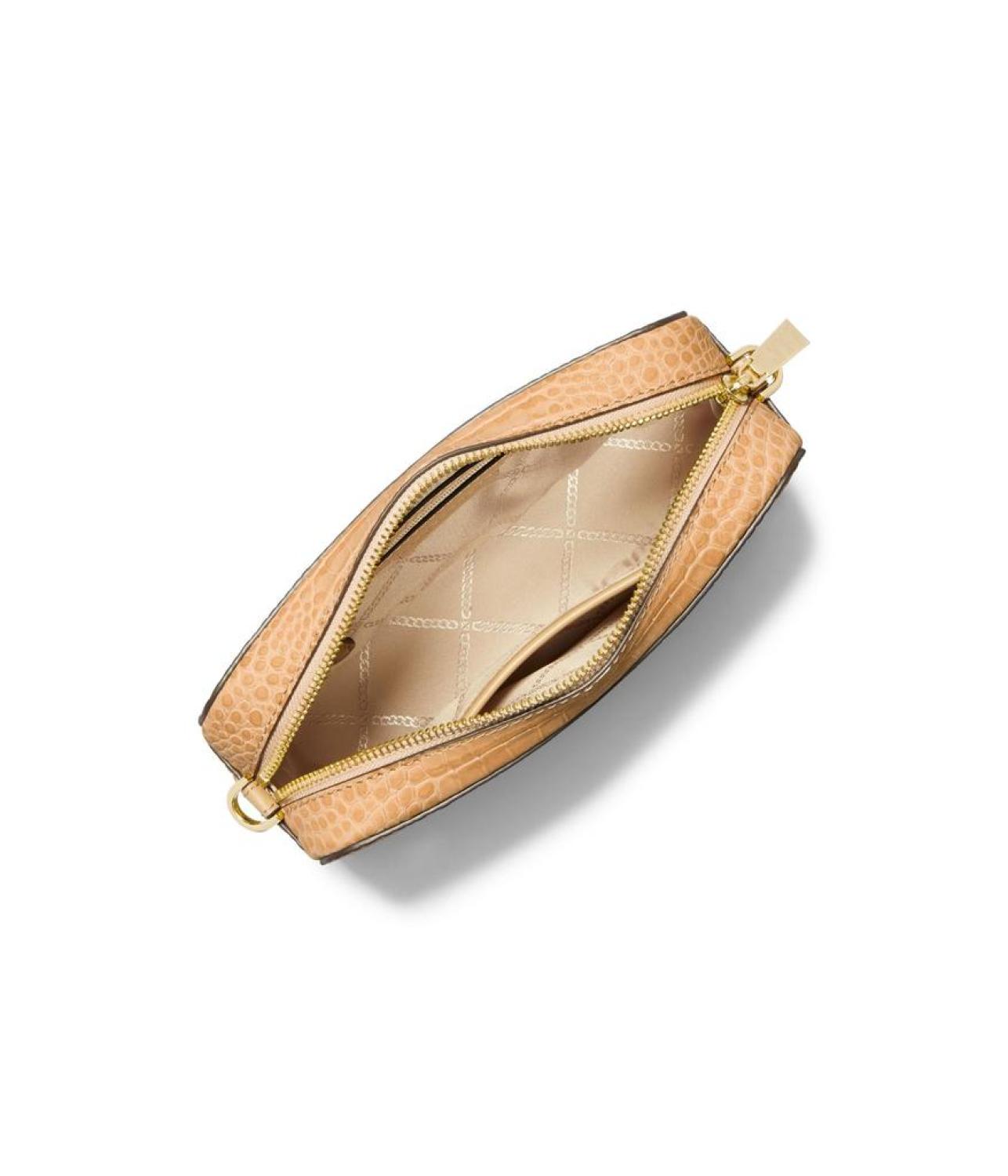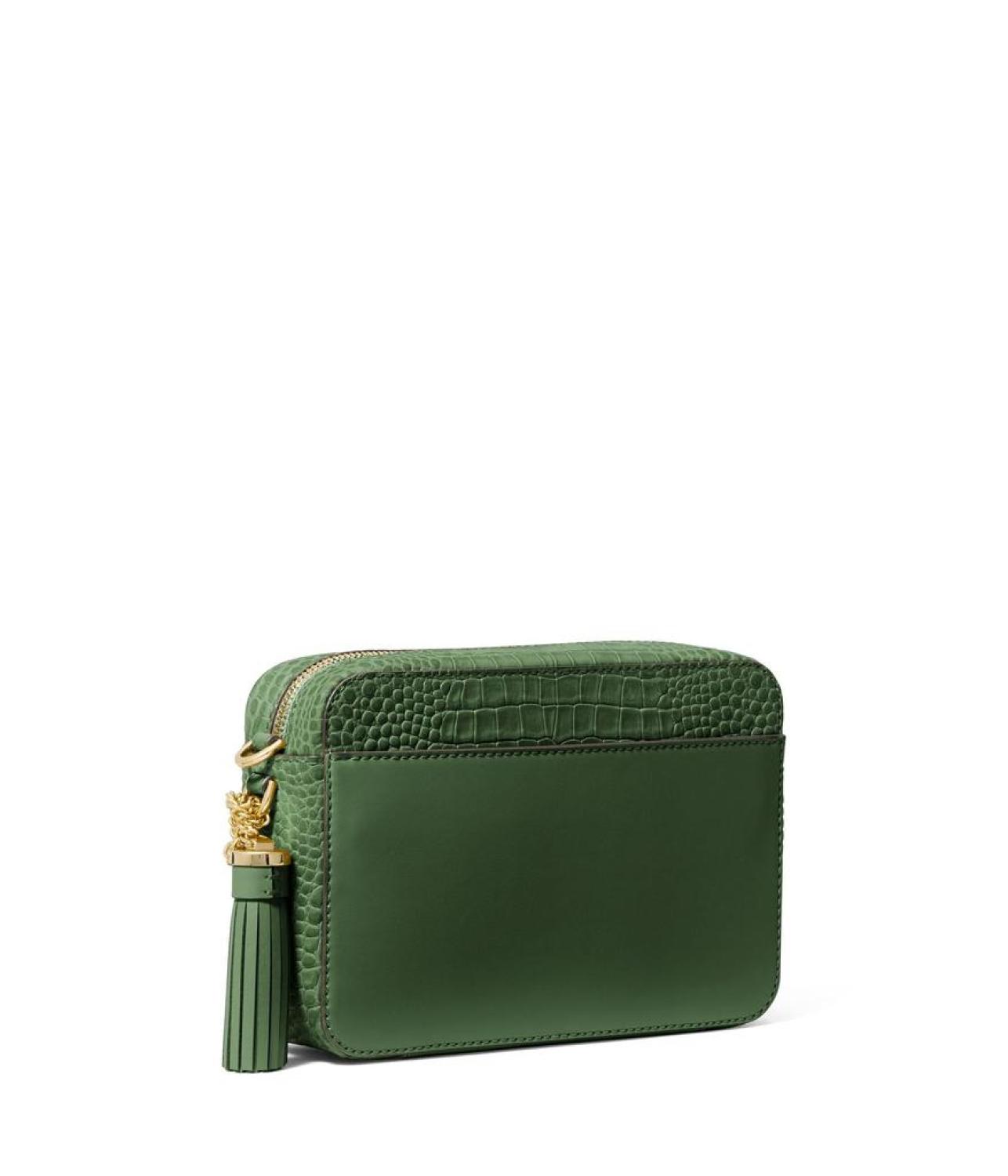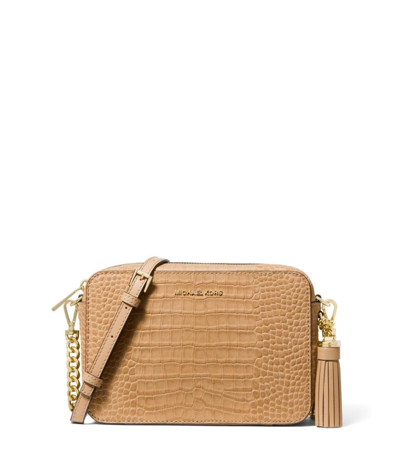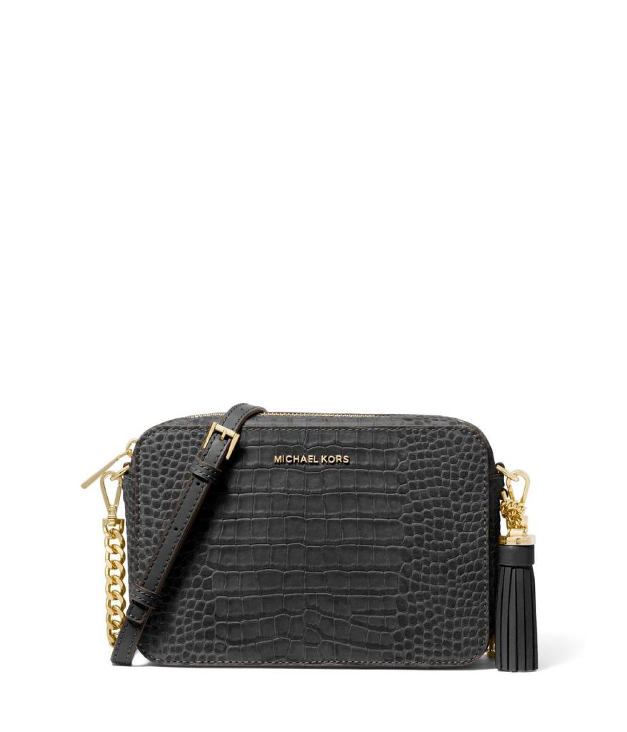 • Sleek and stylish, the MICHAEL Michael Kors® Jet Set Medium Camera Bag with Pocket is sure to make a statement. The handbag has crocodile embossed leather construction and features a crossbody strap with a zippered top closure. It also has chain-link accents and an oversized tassel.